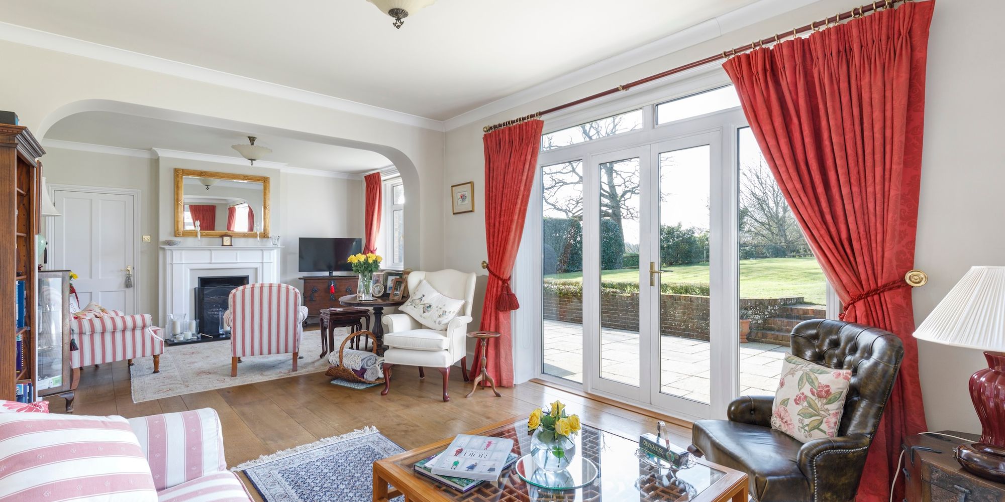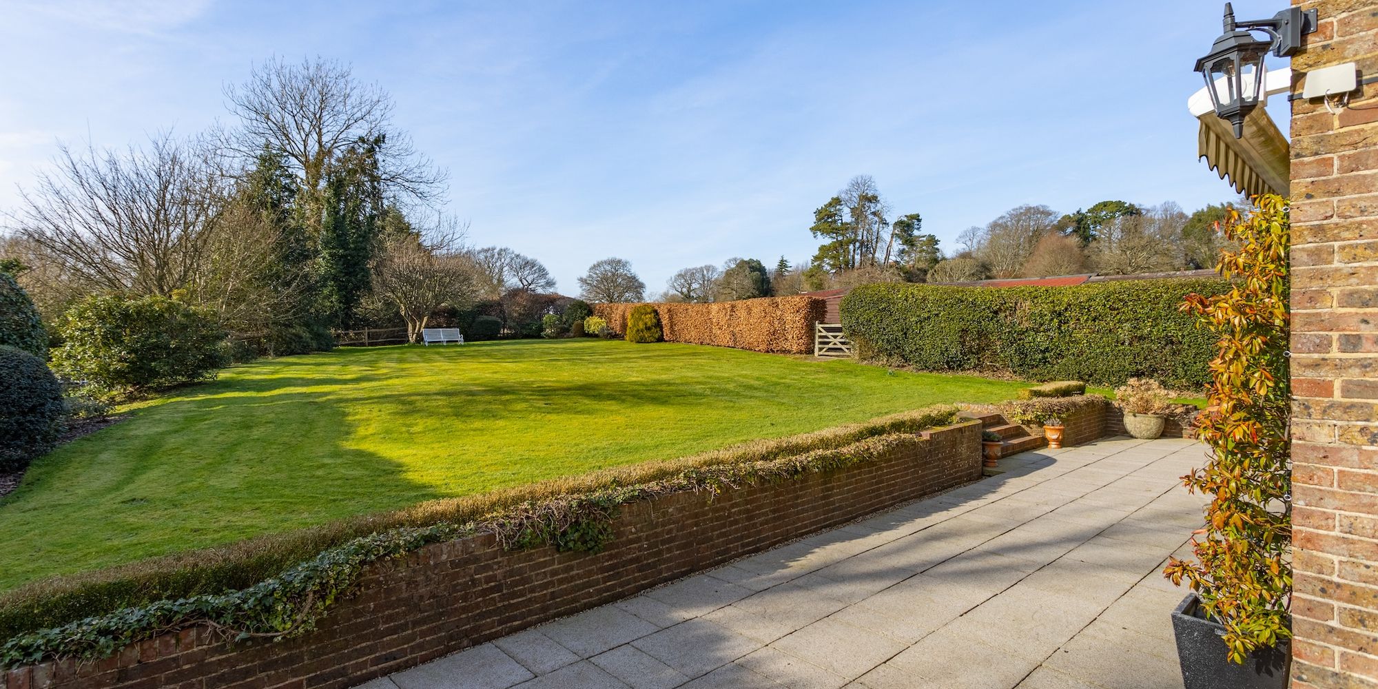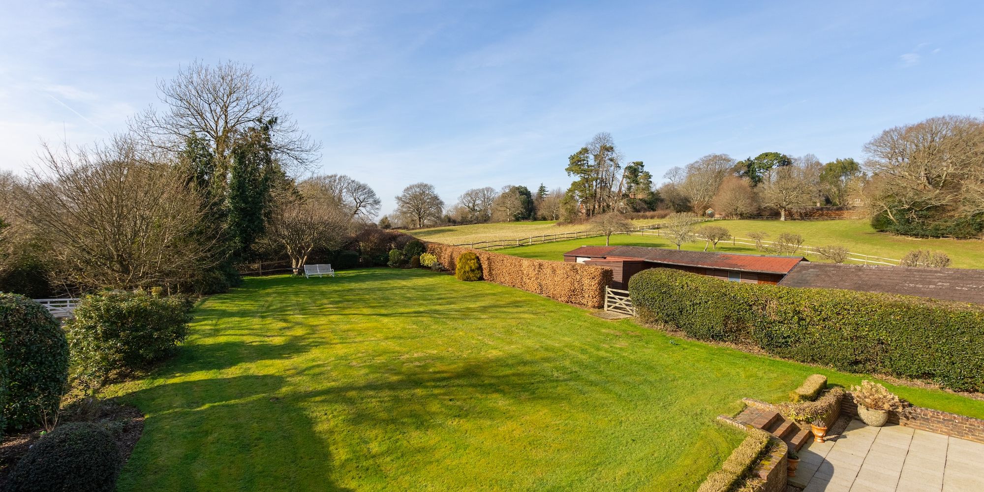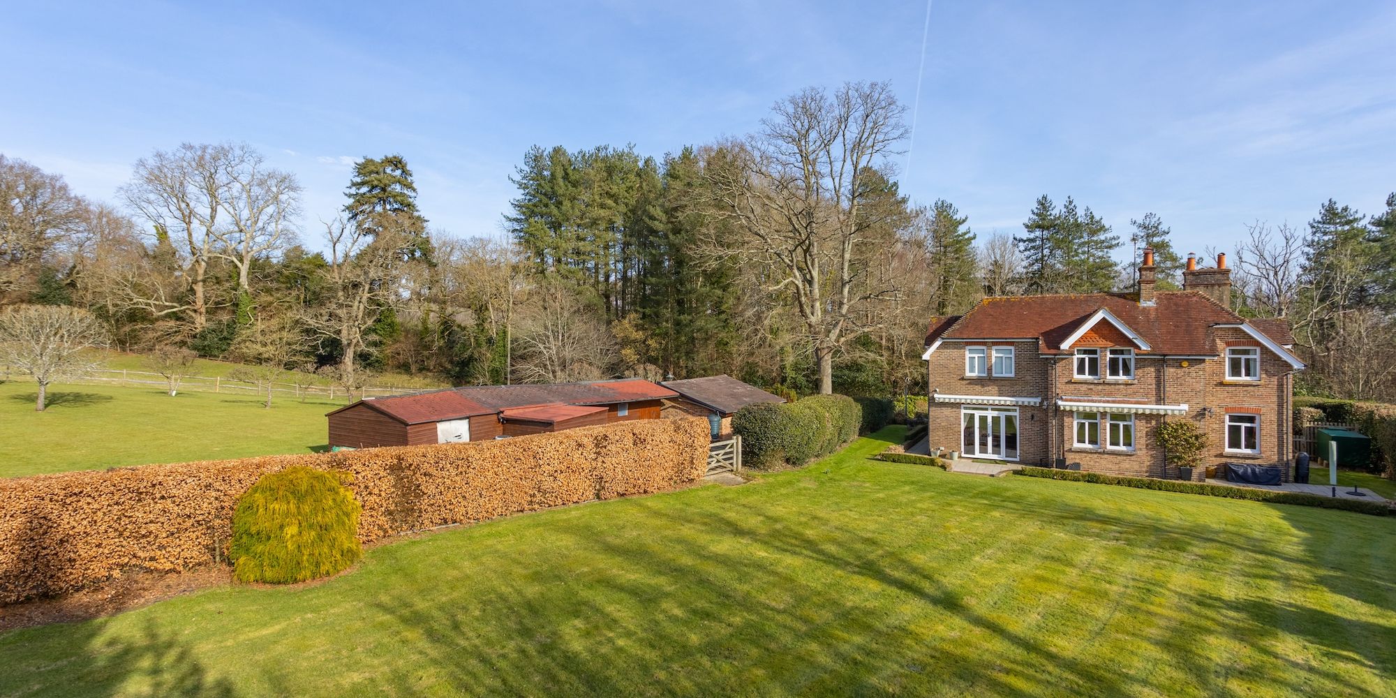 A WEST-FACING FORMAL REAR GARDEN laid to a vast level lawn, is flanked with established hedging and mature trees and ENJOYS A HIGH DEGREE OF PRIVACY AND QUIET SECLUSION. An extensive PATIO TERRACE spans the width of the house whilst complete with two electronically operated awnings, ideal for alfresco dining and entertaining. A five-bar gate positioned between the hedging leads to the Orchard’s outbuilding.