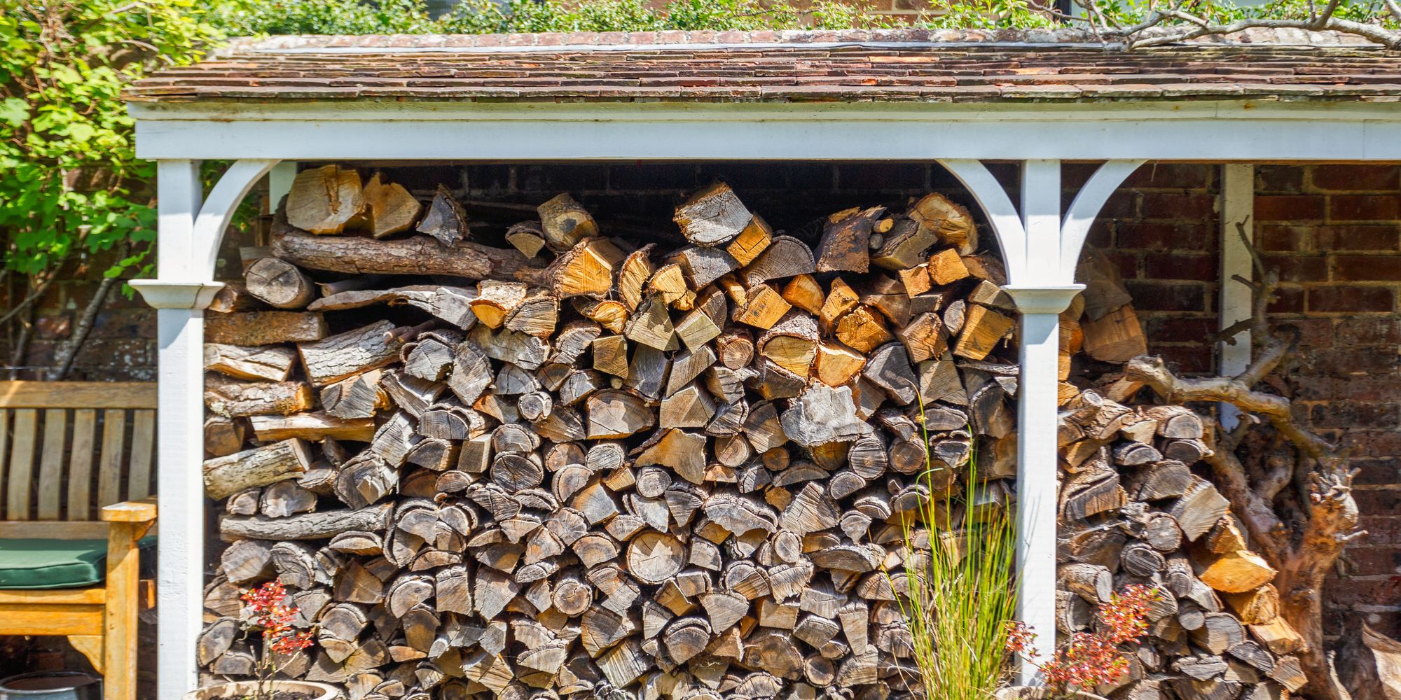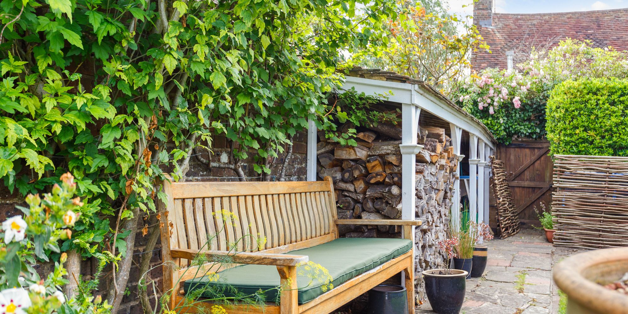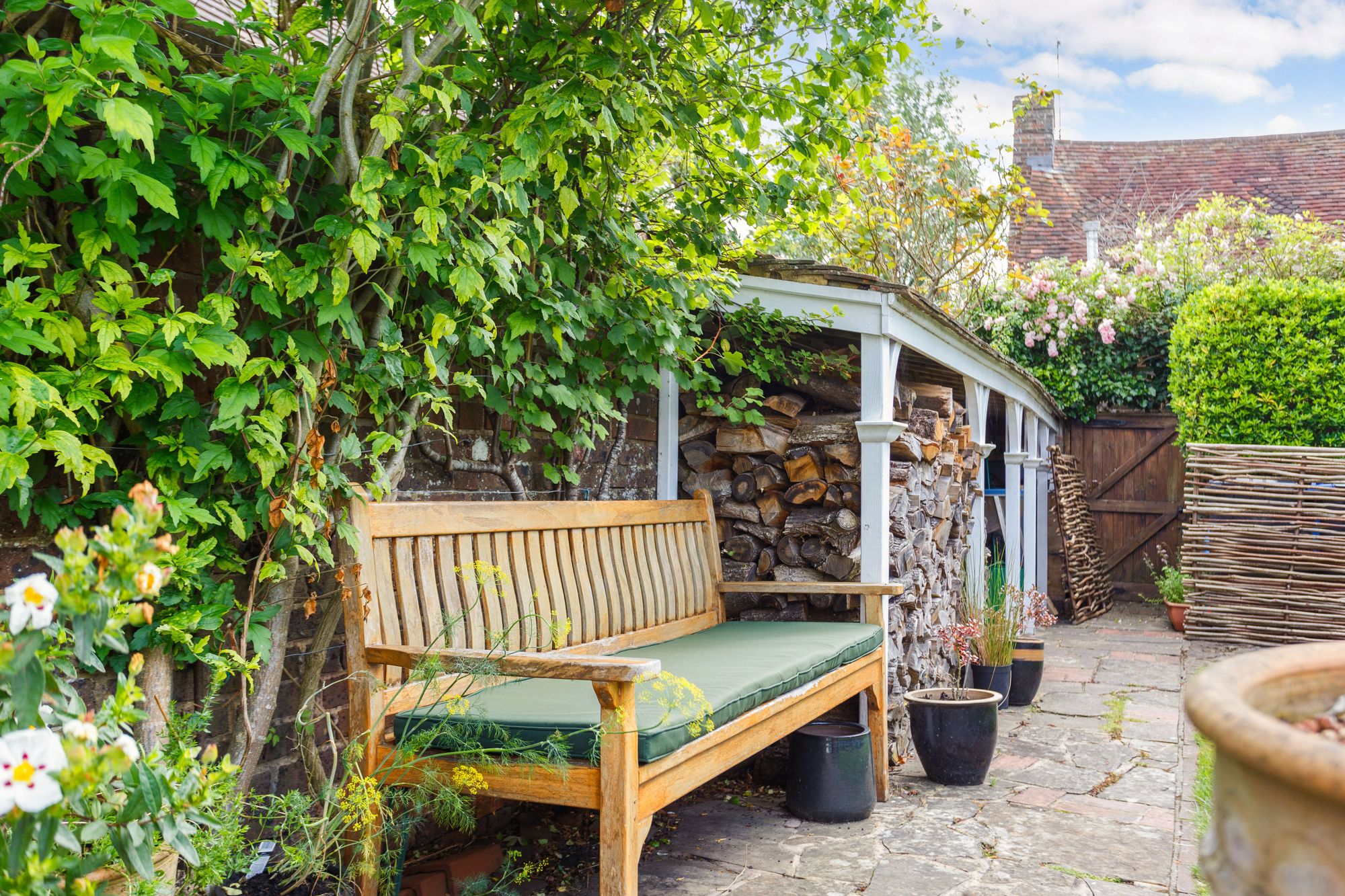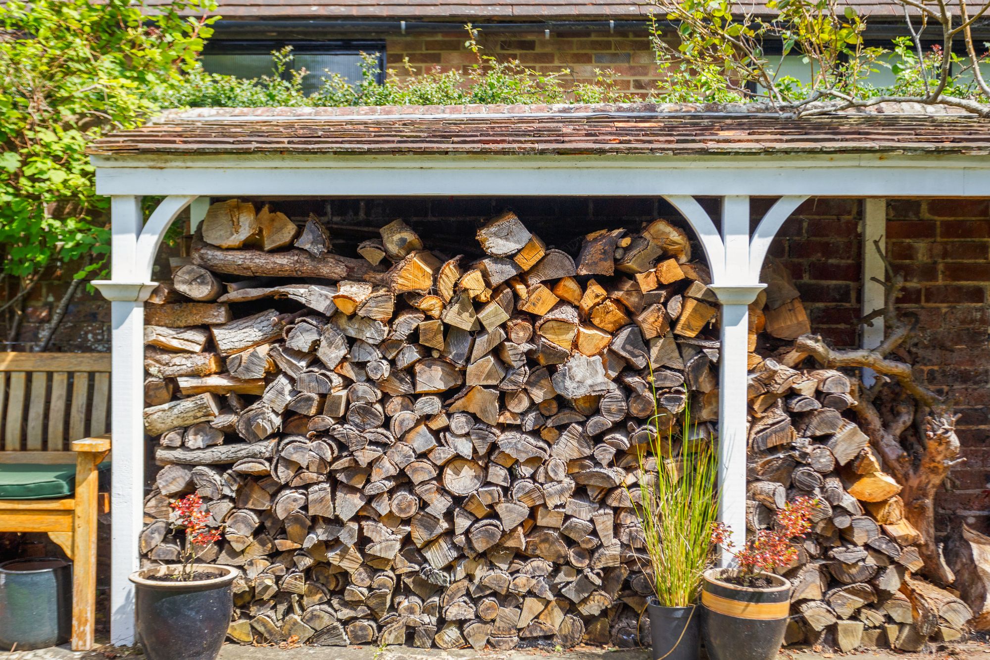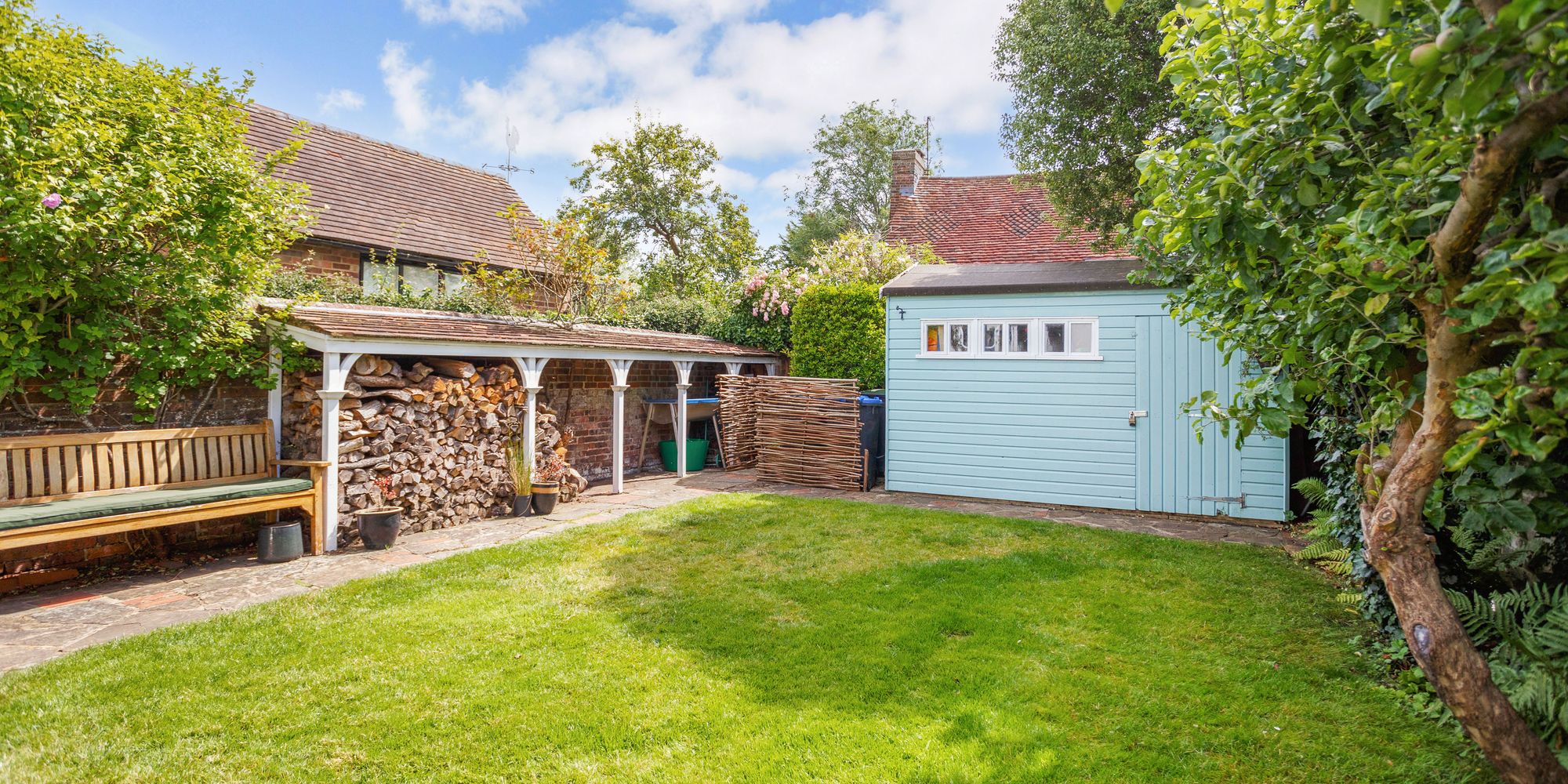 A few steps up lead to a level and neatly clipped lawn with pathway to rear where there is a painted TIMBER STORAGE SHED and an extensive COVERED LOG-STORE to the side.