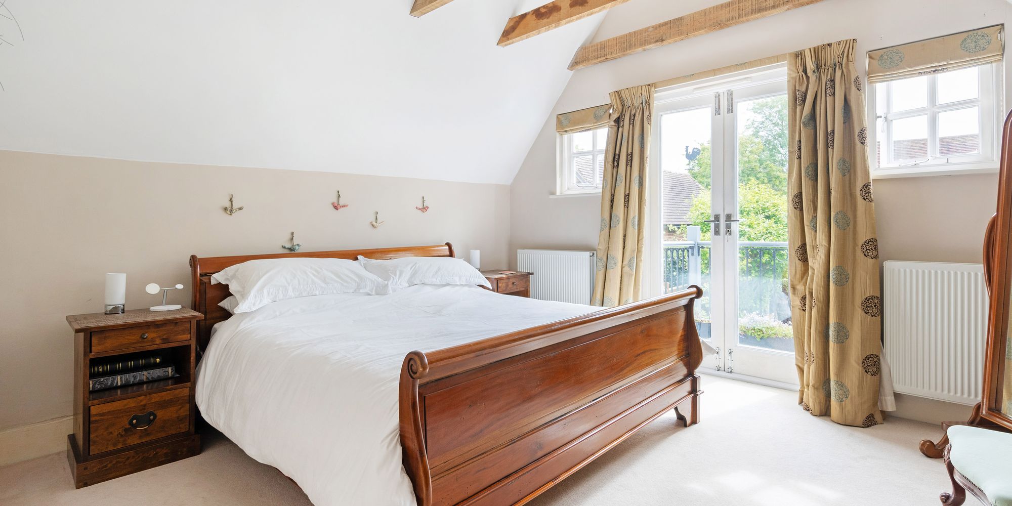 Stairs from the reception hall rise to the FIRST FLOOR where there are THREE DOUBLE BEDROOMS. The PRINCIPAL BEDROOM enjoys a part-vaulted beamed ceiling with a SOUTH-EAST FACING BALCONY, a DRESSING ROOM (or NURSERY/BEDROOM 4) and an EN-SUITE SHOWER ROOM with wash-hand basin. BEDROOM 2 has fitted wardrobes and a fireplace, whilst BEDROOM 3 benefits from a large bay window to the front and fitted wardrobes. The fully tiled FAMILY BATHROOM is equipped with a white suite comprising corner bath, basin and WC.