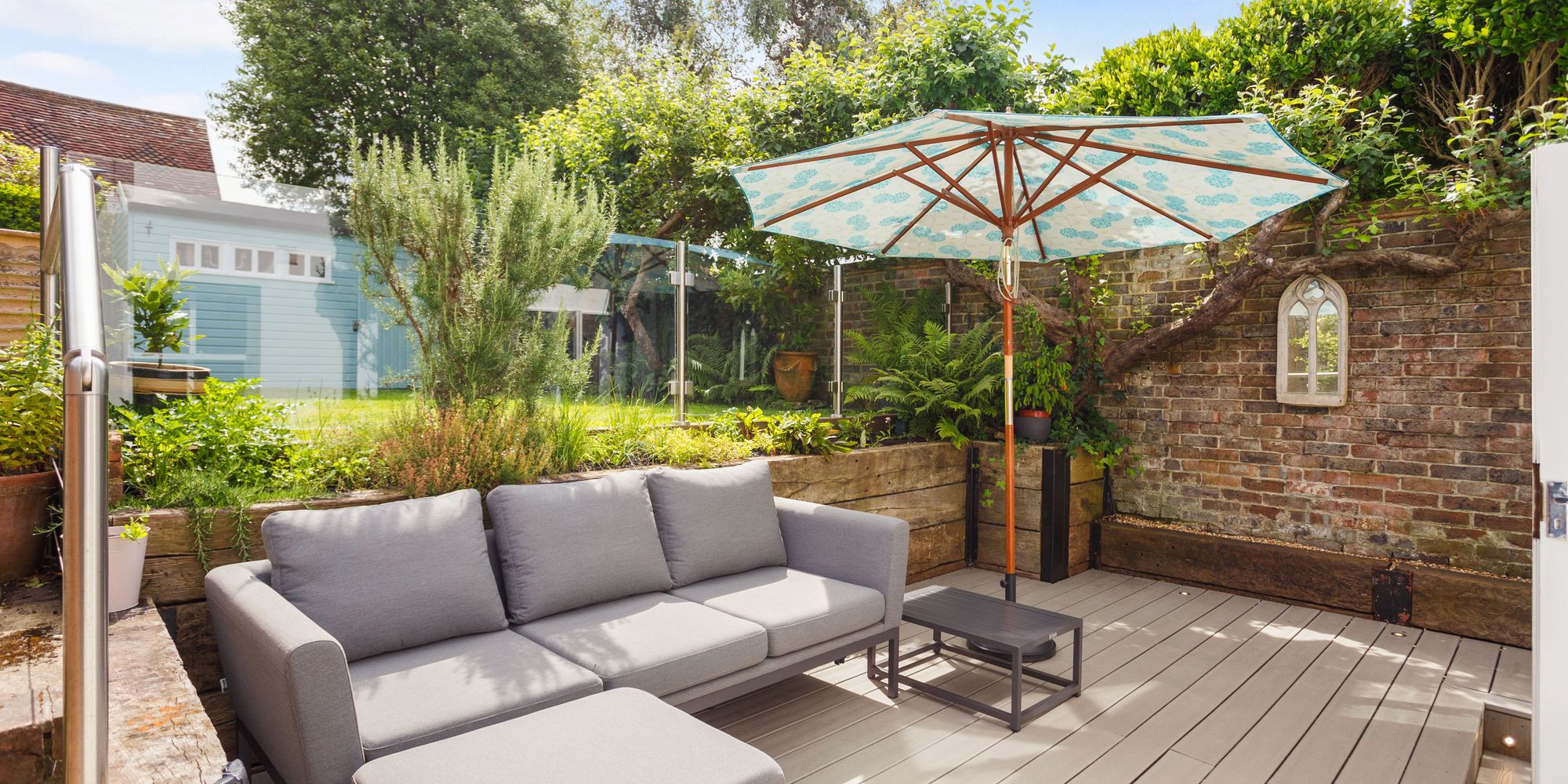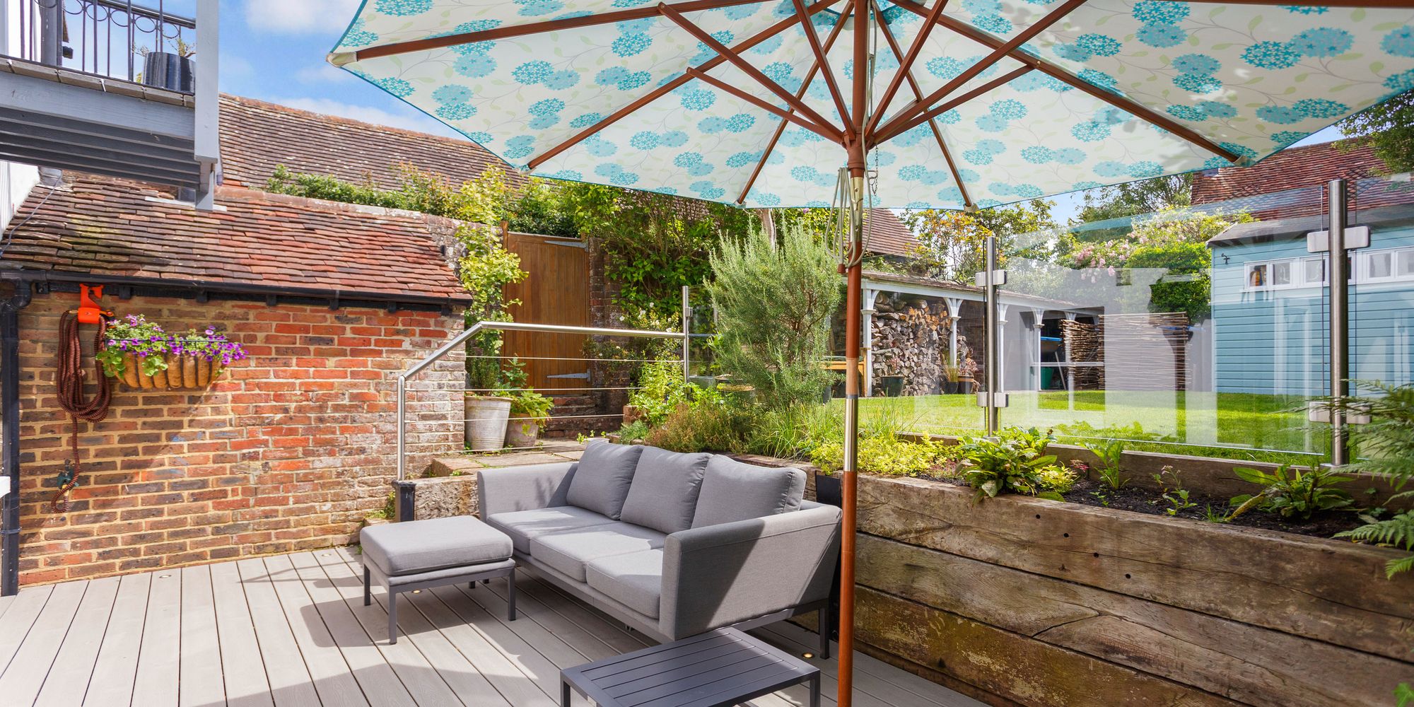 Clever landscaping has created a large, decked sun terrace bordered with raised, planted sleeper beds and balconied by contemporary glass and stainless-steel balustrading being positioned off the dining and family area, forming an ideal space for outdoor dining and entertaining.