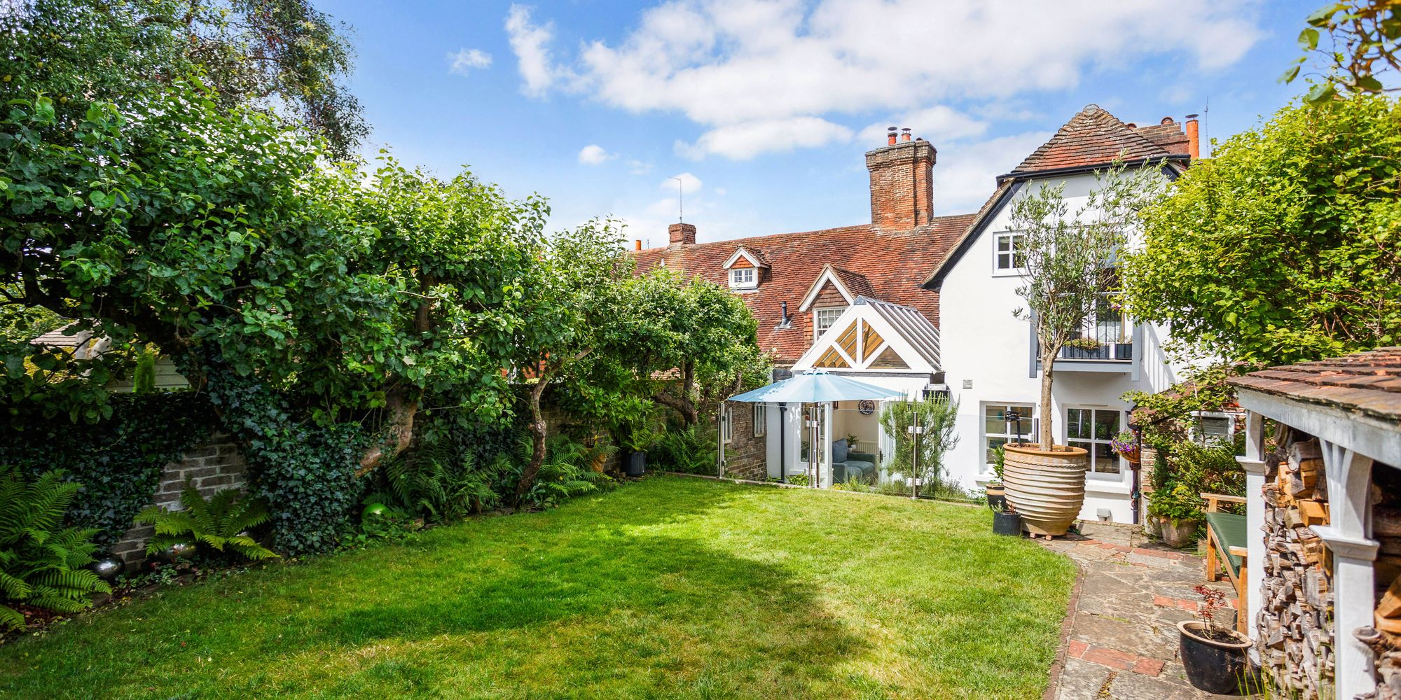 OUTSIDE: The rear garden is a particular feature of the property, with its south-east facing aspect, mature specimen trees and pretty shrubs enclosed by characterful brick walls.
