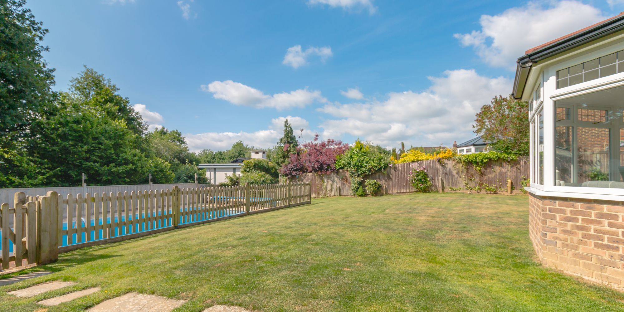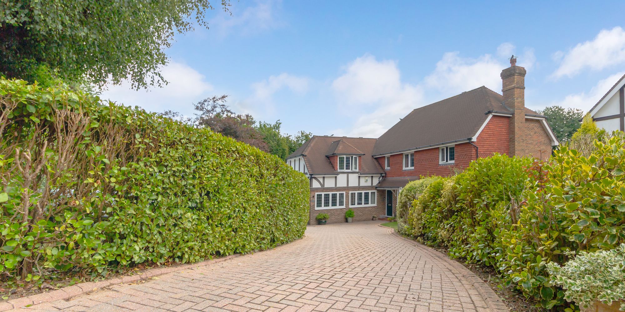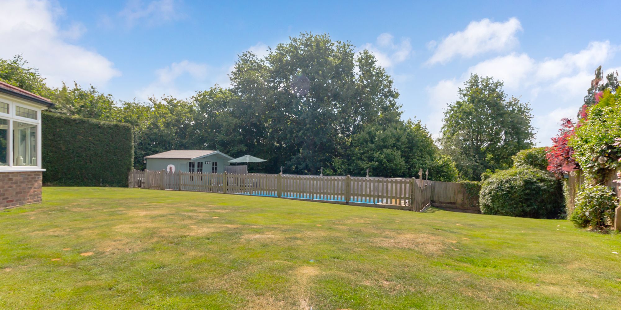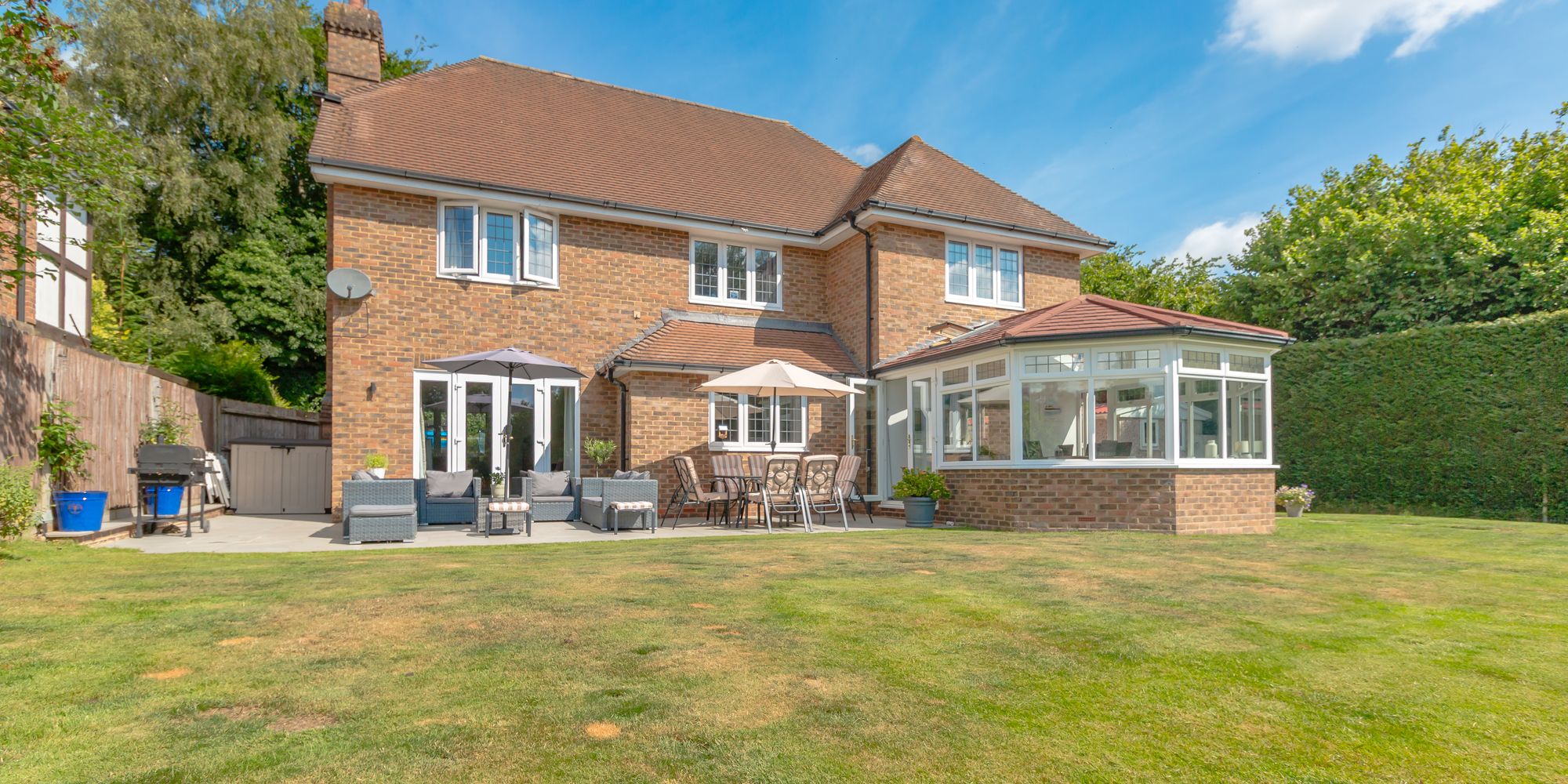 An outstanding and substantial six bedroom five bathroom detached executive style family home occupying a pleasant south facing corner plot with an outdoor heated swimming pool, pool house and detached garage. Situated in a peaceful position adjoining the nature reserve and within walking distance of the town centre.