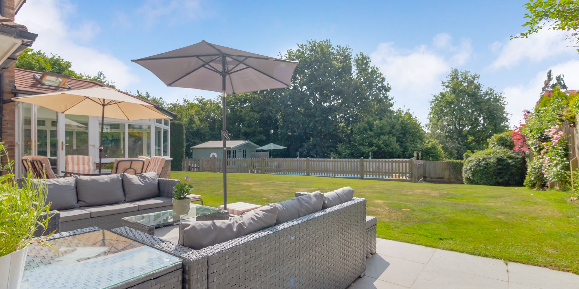 Outside, the front of the property is approached via a brick paved driveway way which in turn leads to the detached tandem length garage. The rear garden is predominantly laid to lawn with a stone seating terrace adjoining the rear of the property. The pool is enclosed by picket style fencing and has a timber pool house to one side. The whole enjoying a southerly aspect and much seclusion.