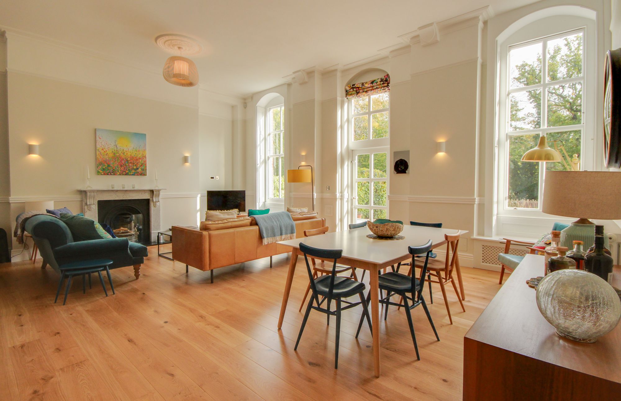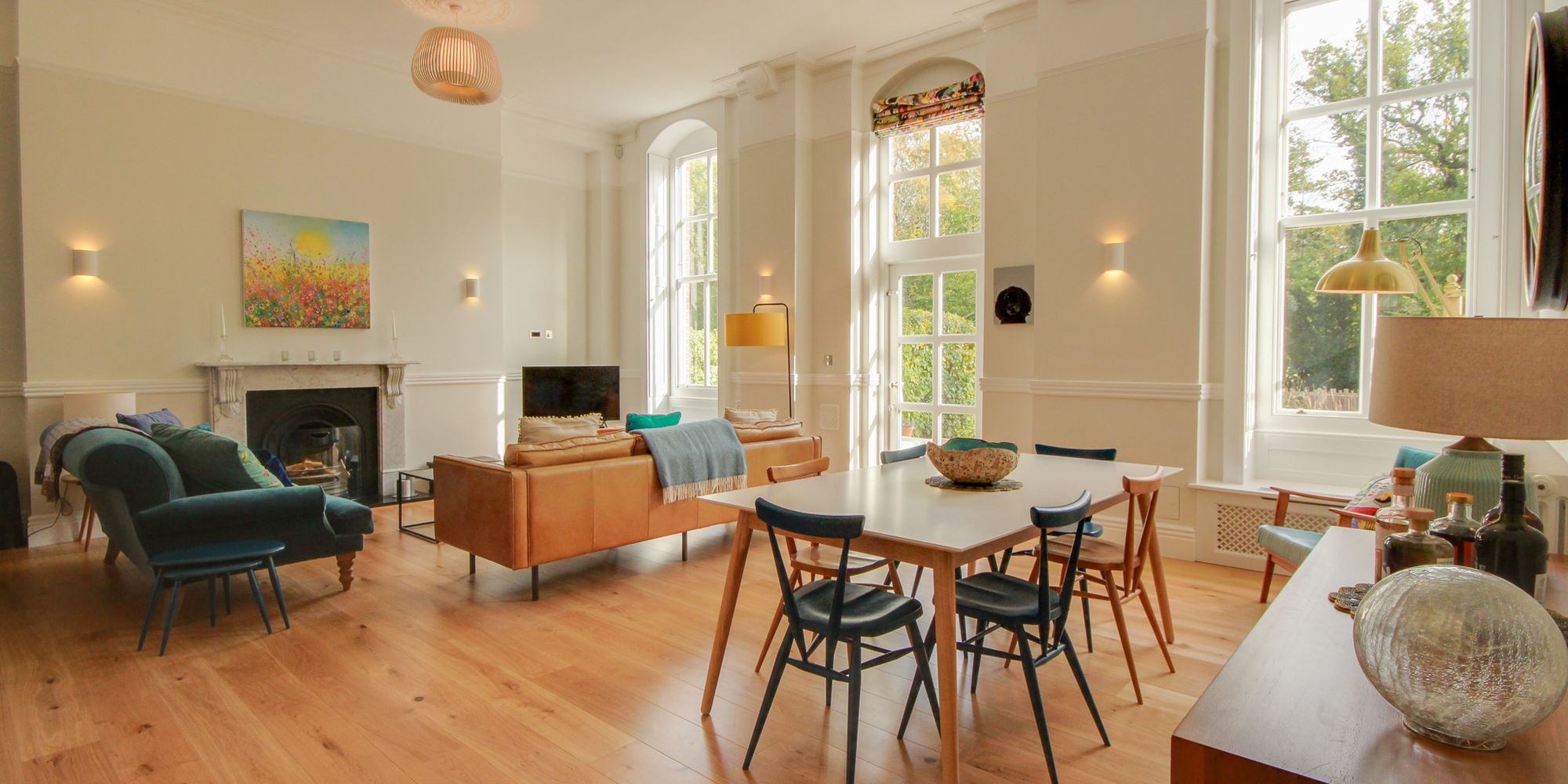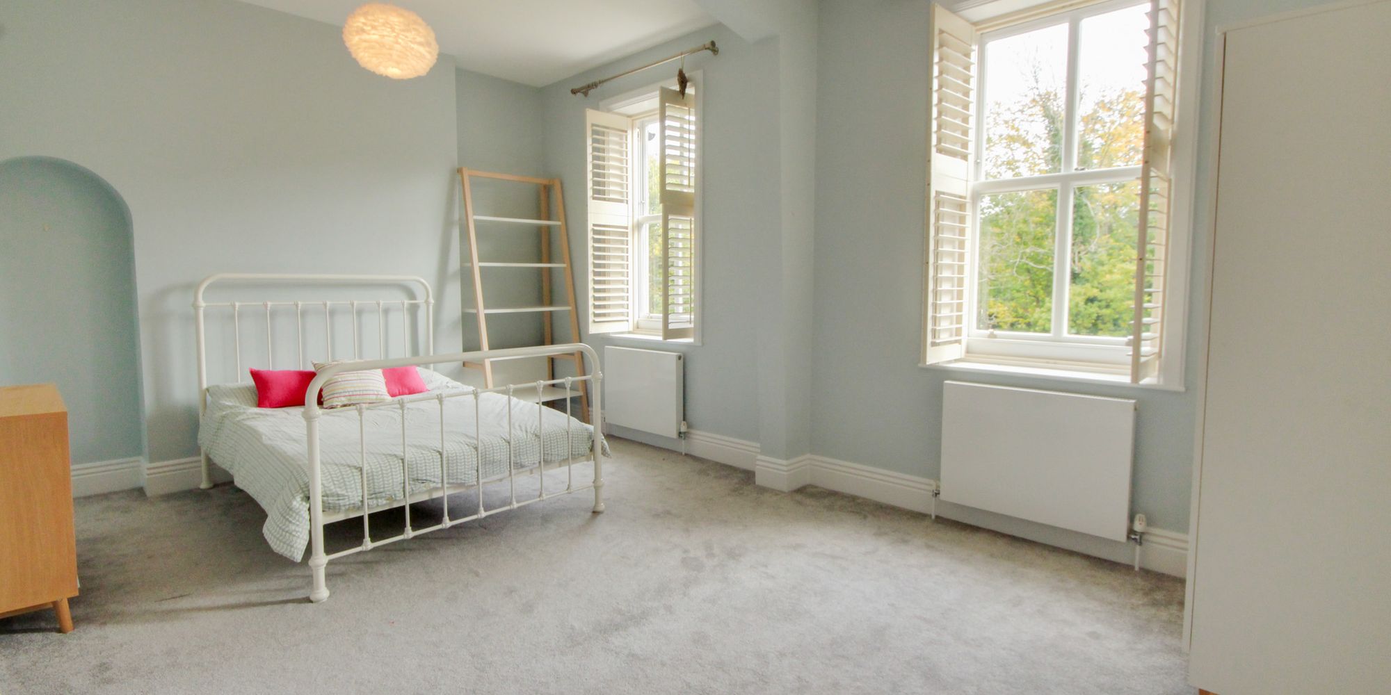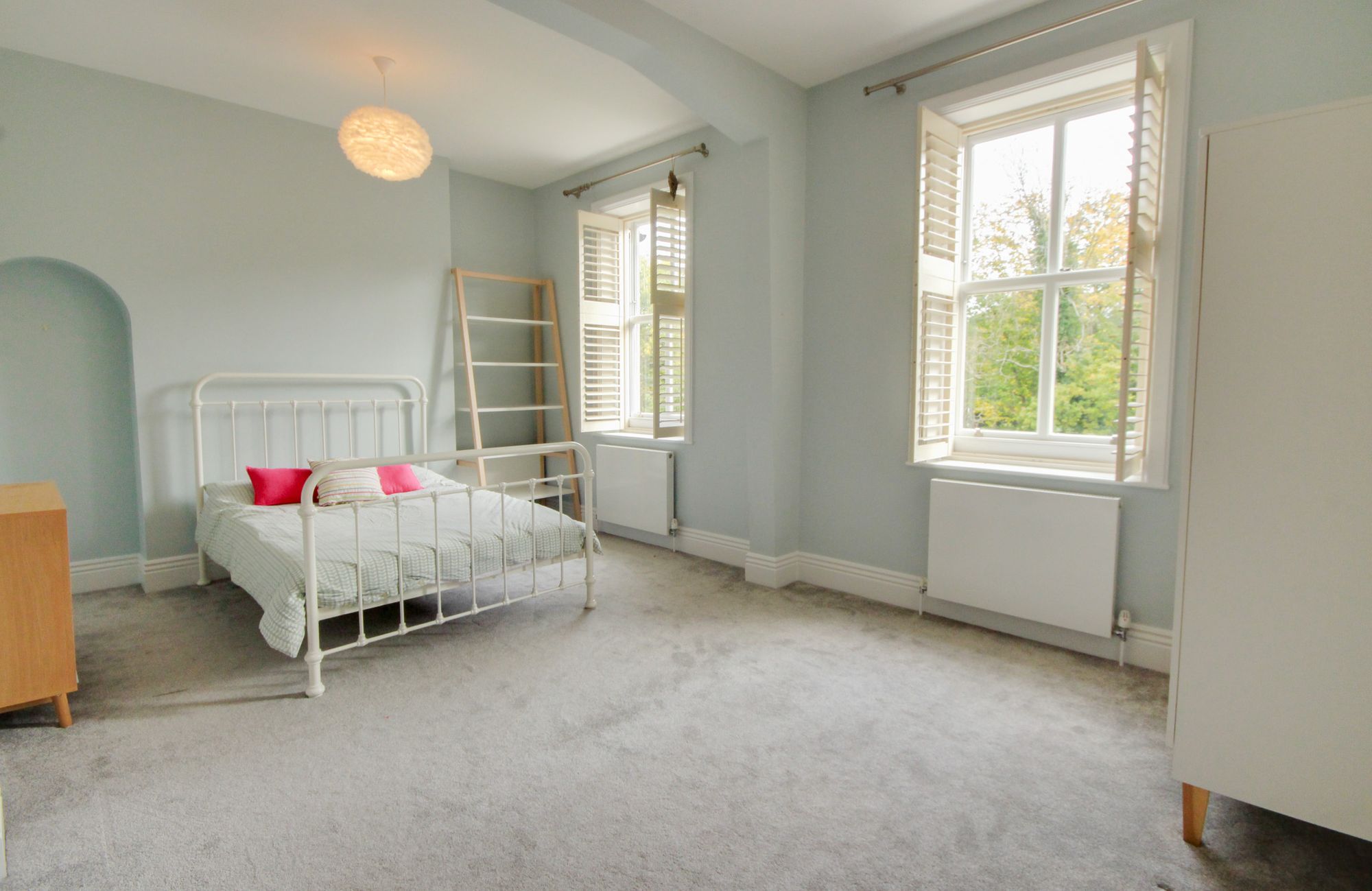 - Open fireplace, high ceilings and tall sash windows with shutters