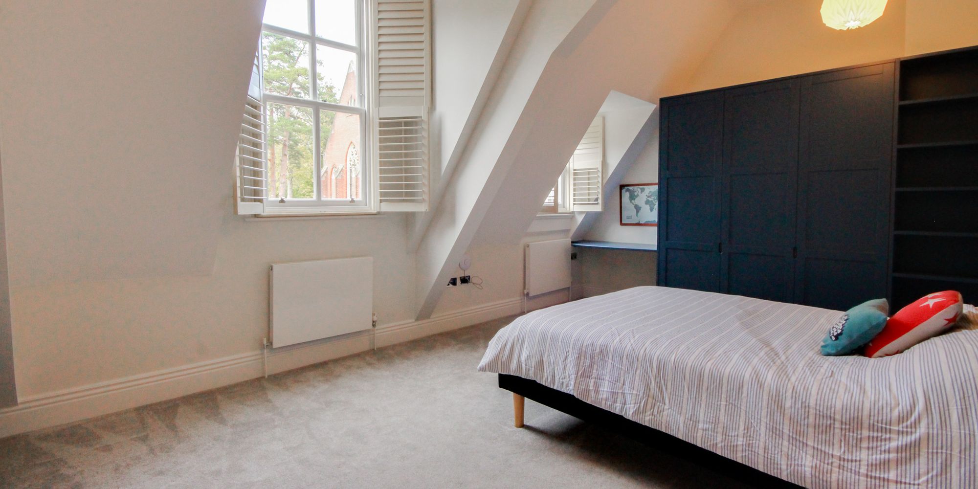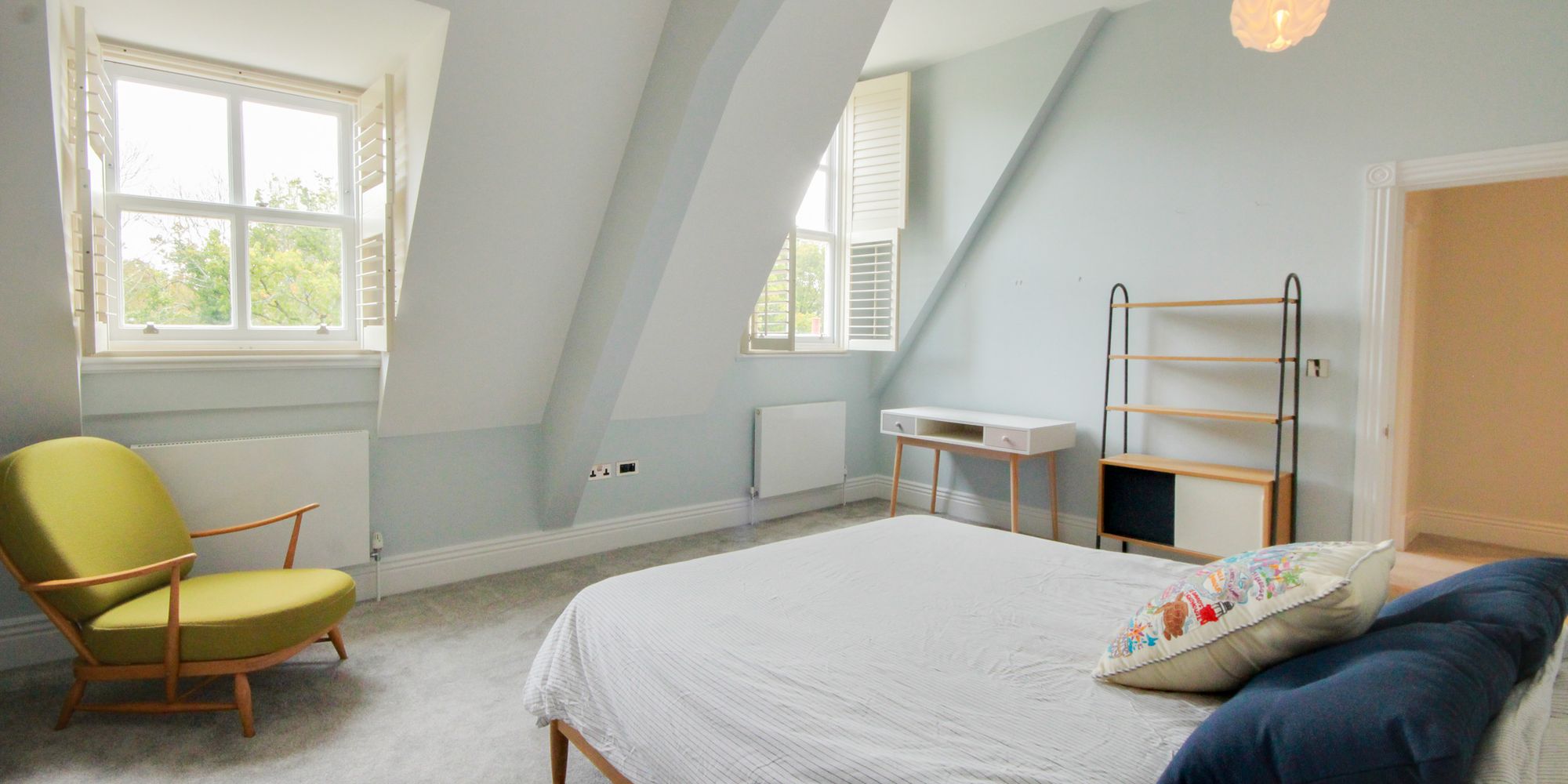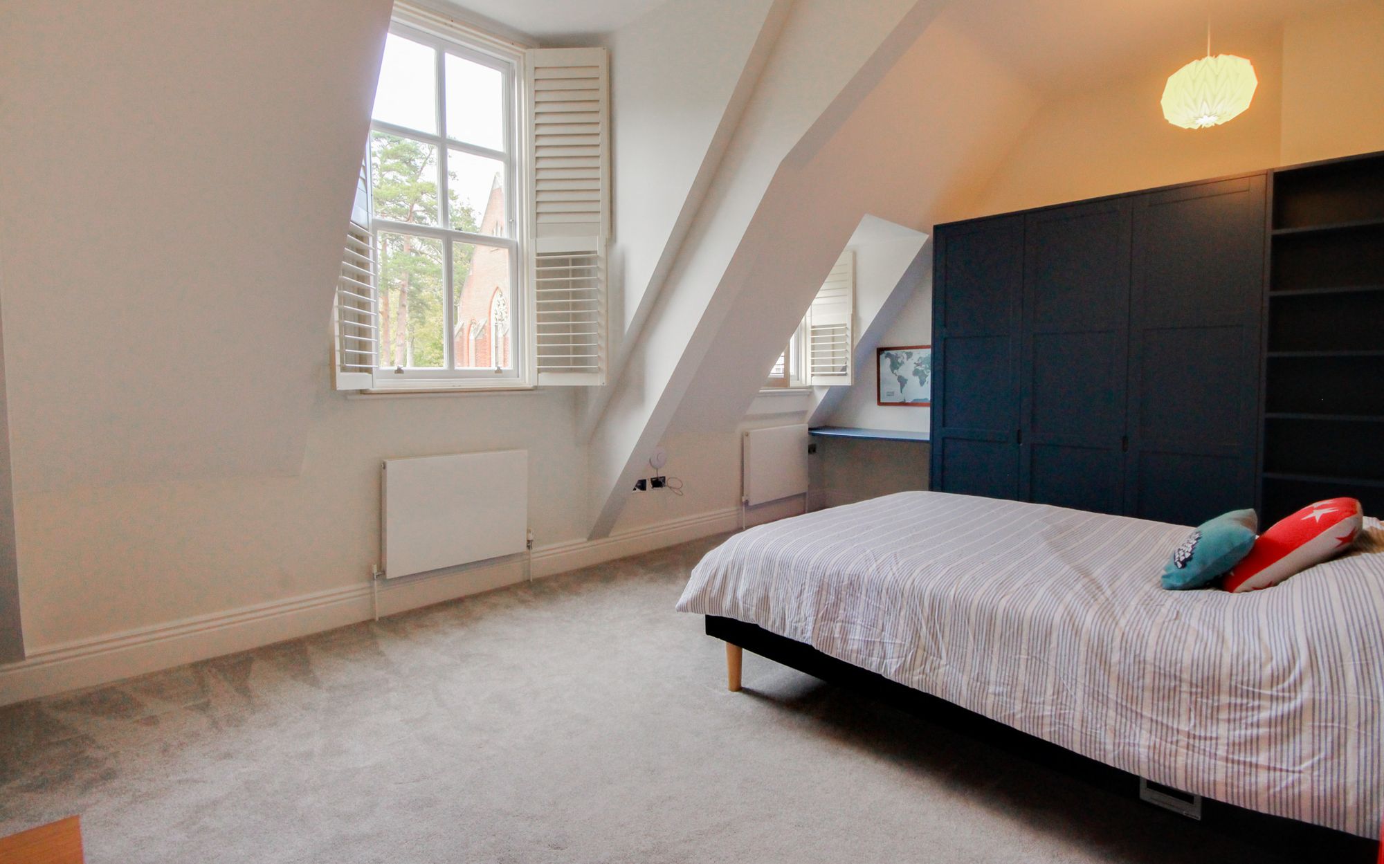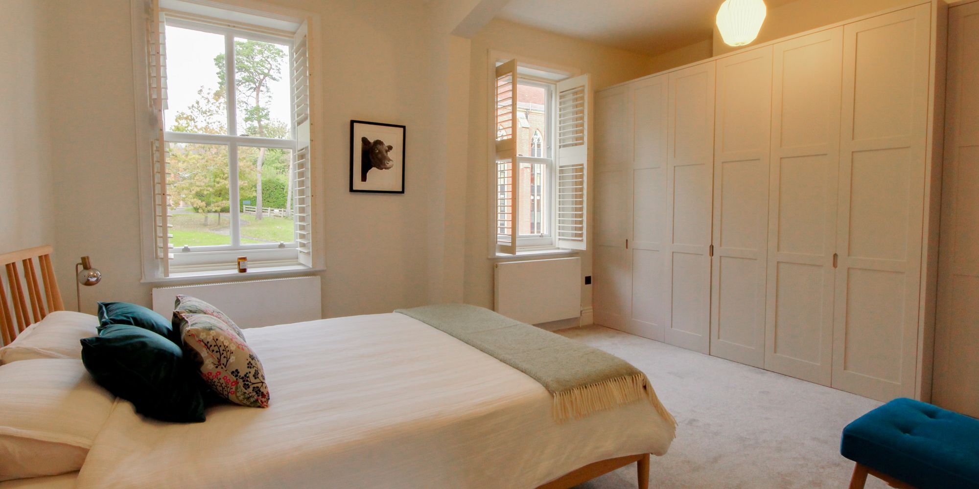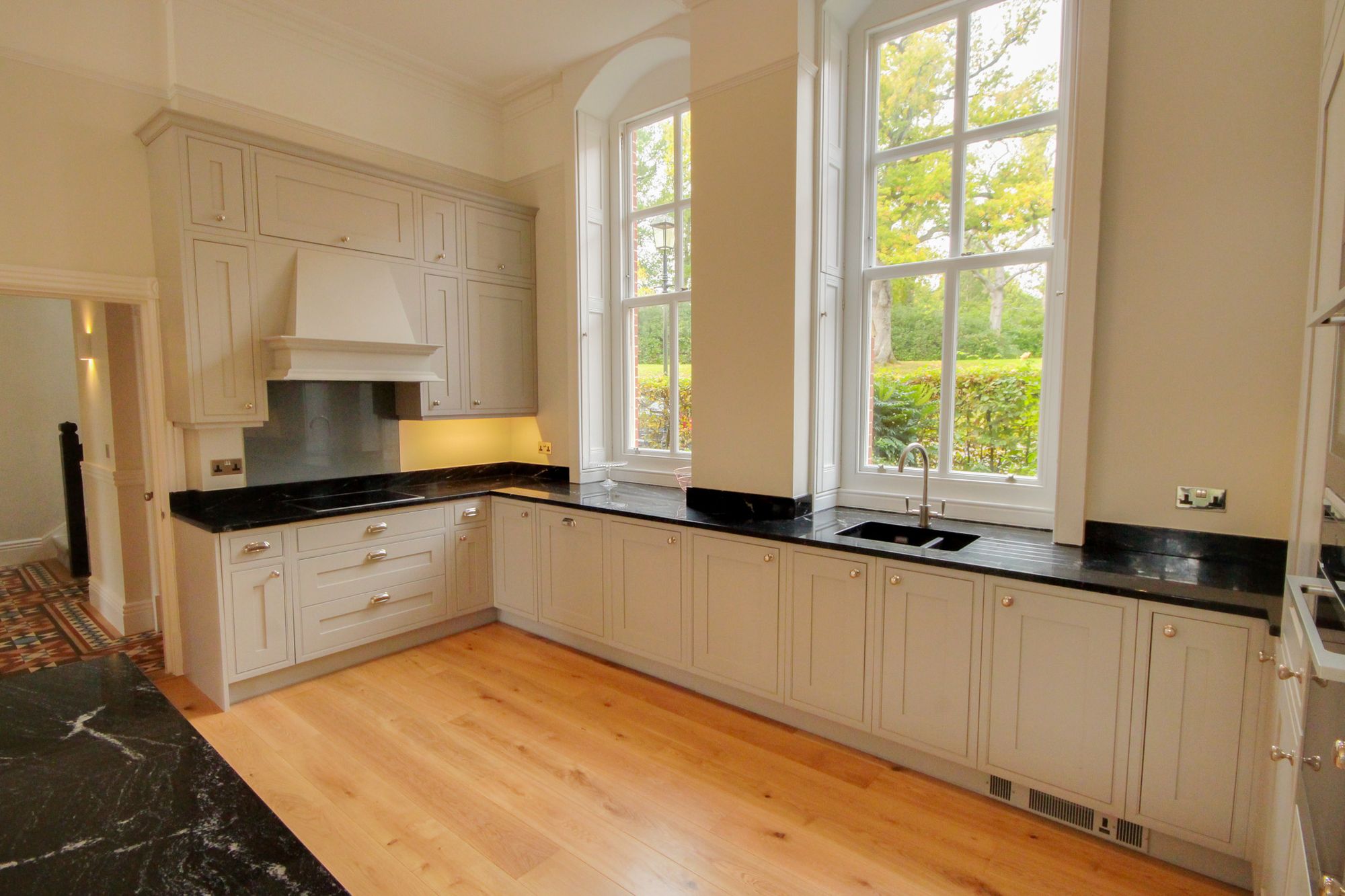 - Open fireplace, high ceilings and tall sash windows with shutters