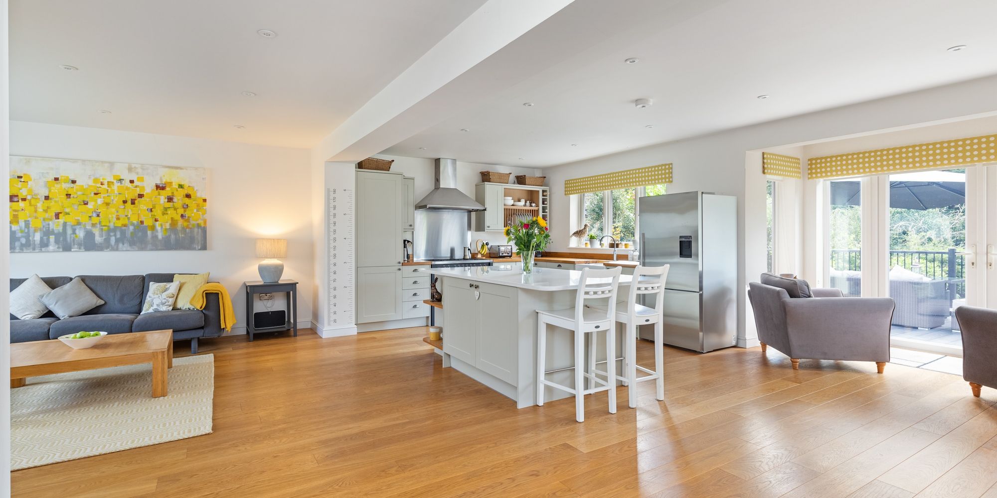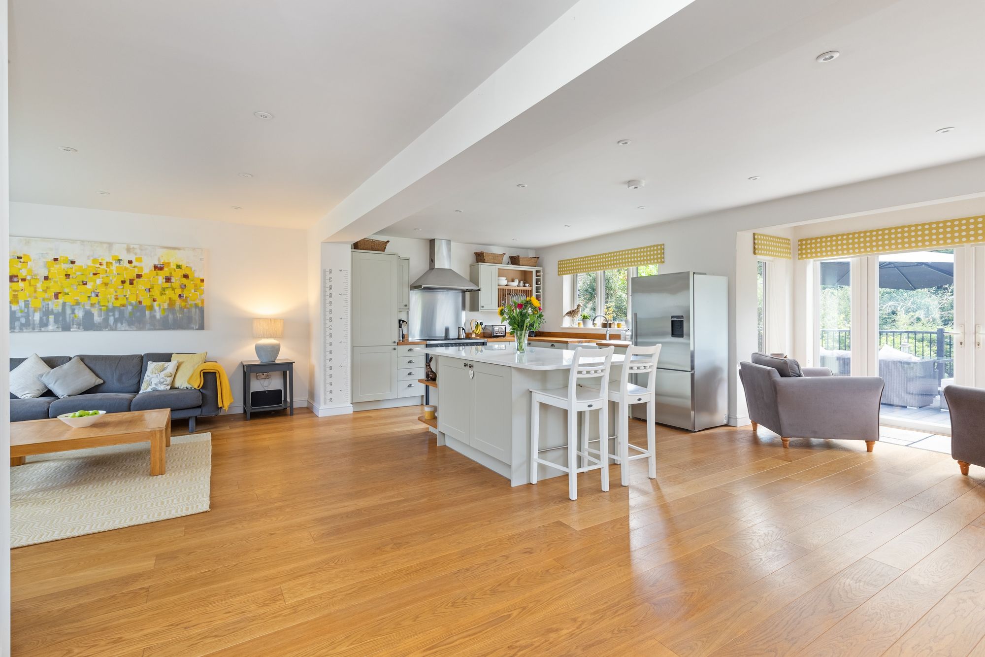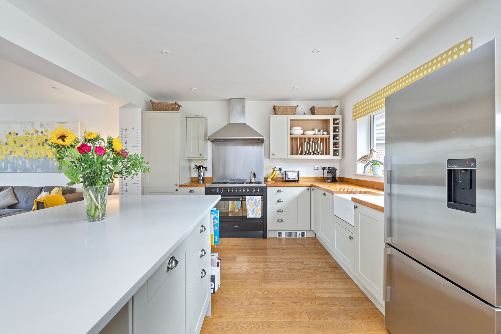 The 33’ 21’ kitchen/breakfast/family room is refitted with an attractive range of Shaker style units, Quartz & Oak work surfaces, integrated appliances, Quooker boiling tap, island that seats 2 and double doors onto the entertaining area. The kitchen flows through into the dining room with doors onto the garden.