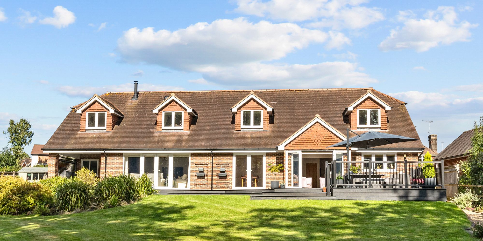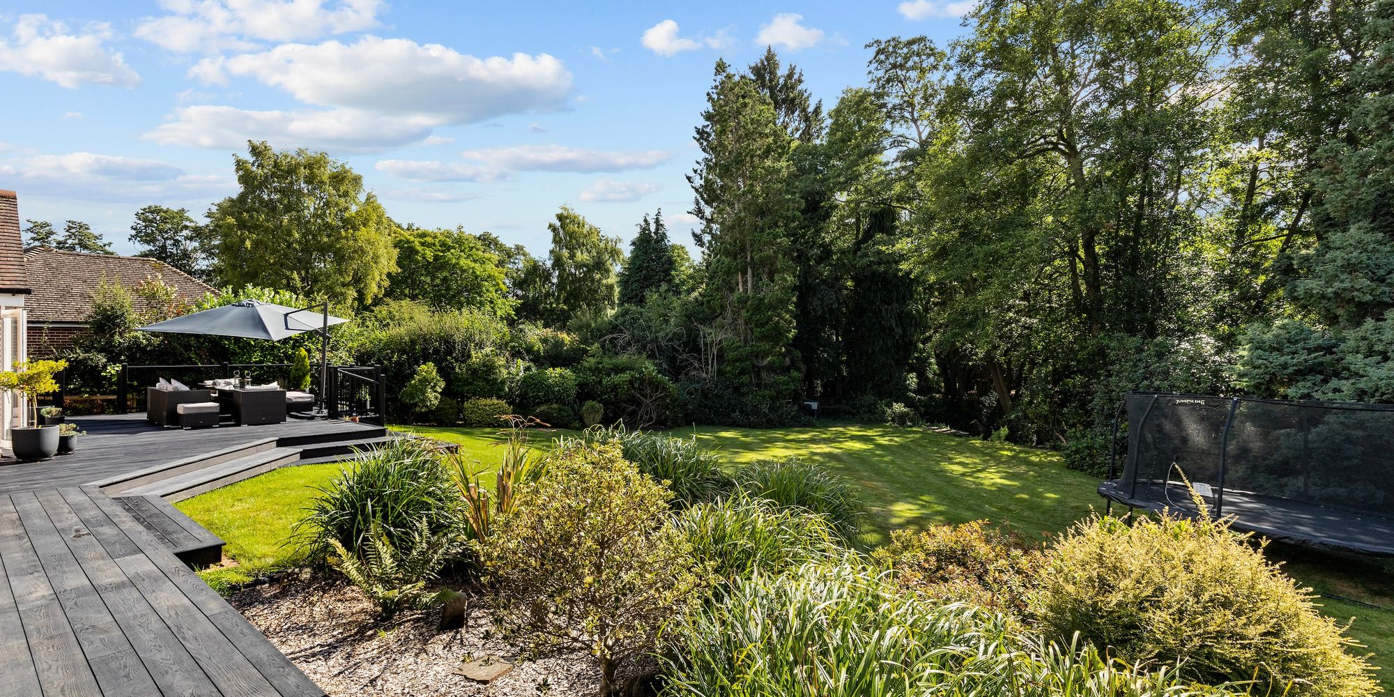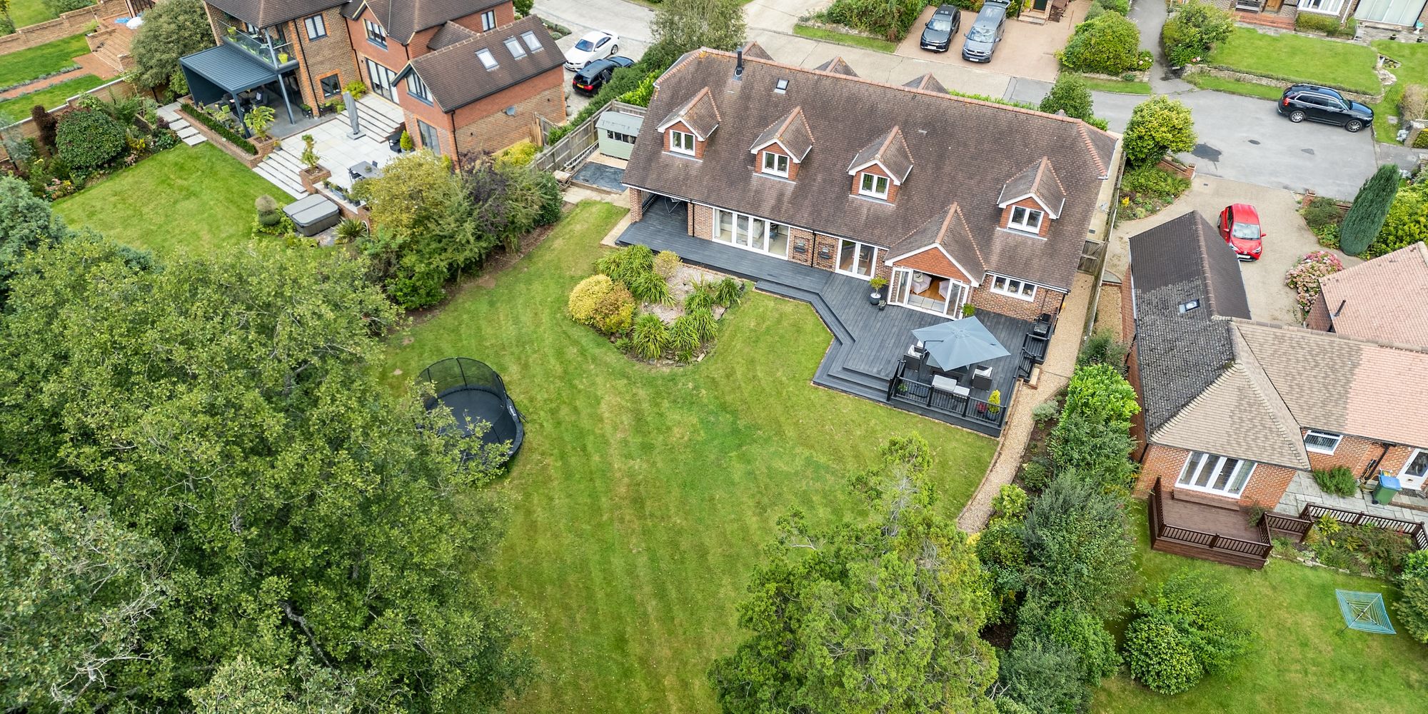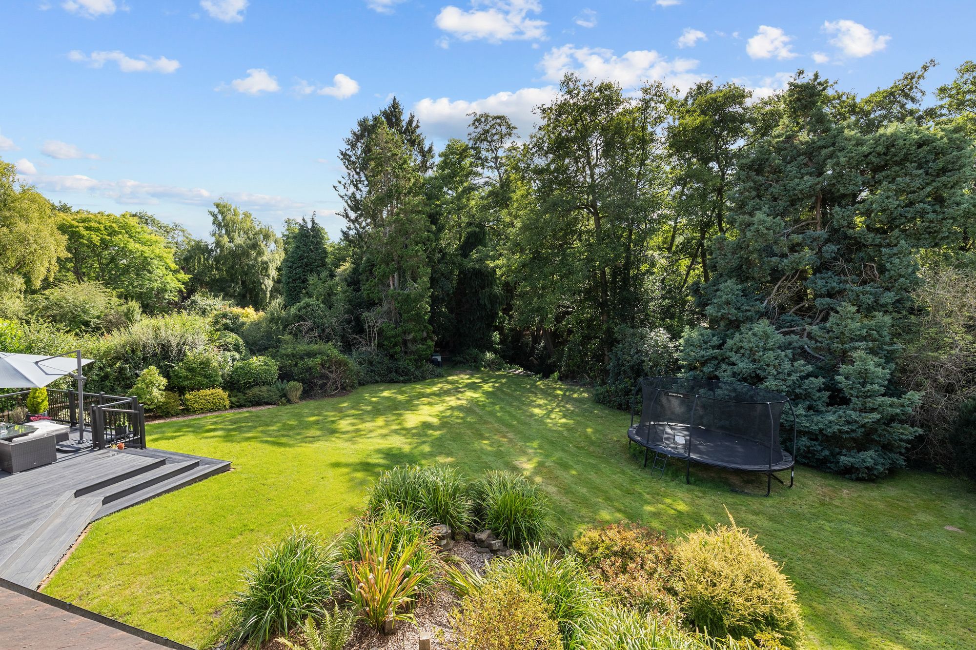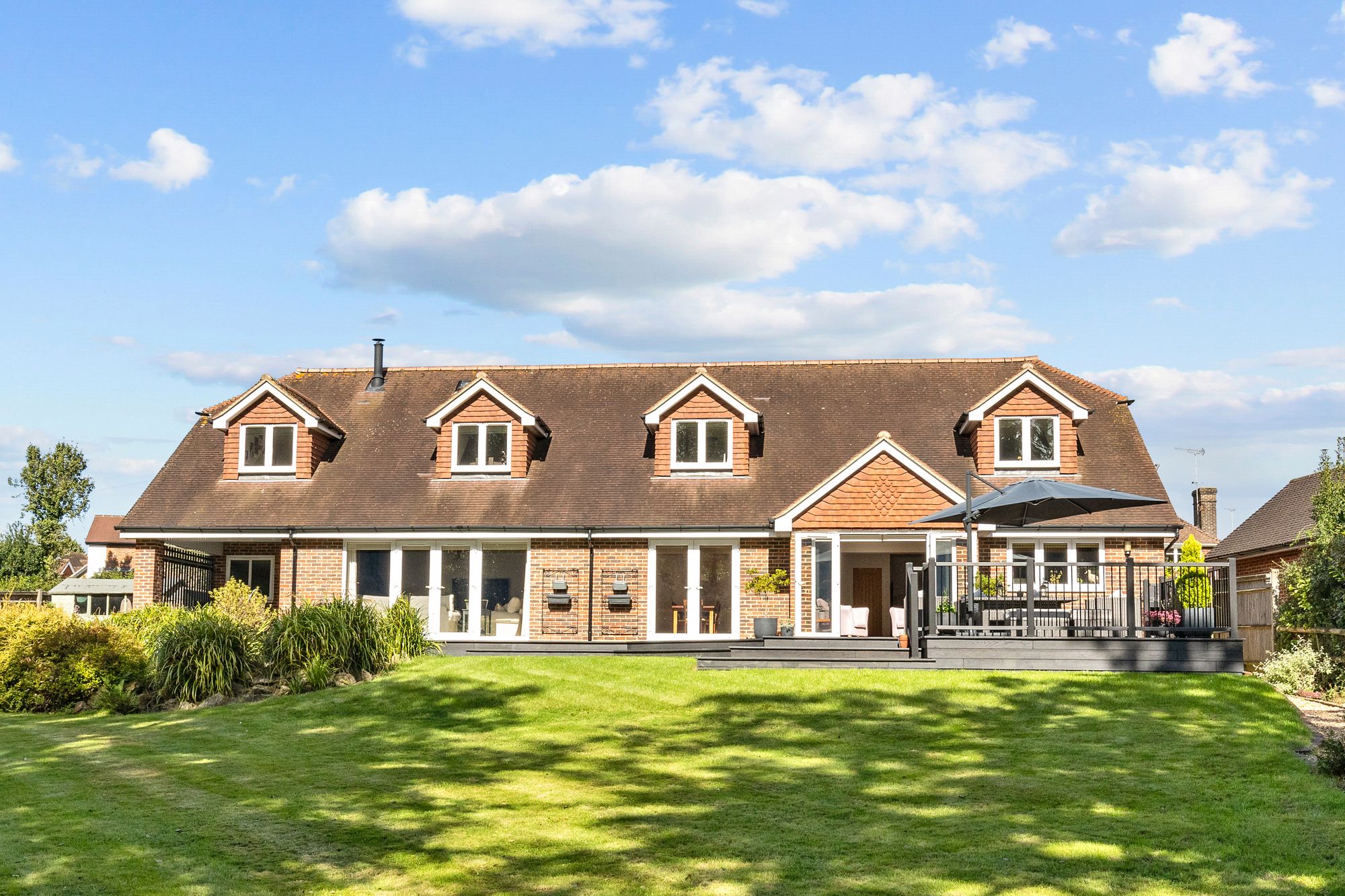The 123’ X 117’ south west facing plot offers a significant amount of privacy and a peaceful environment to relax and entertain in. The garden is predominantly lawned with mature borders, a newly installed and substantial composite decked seating area, loggia and side access.