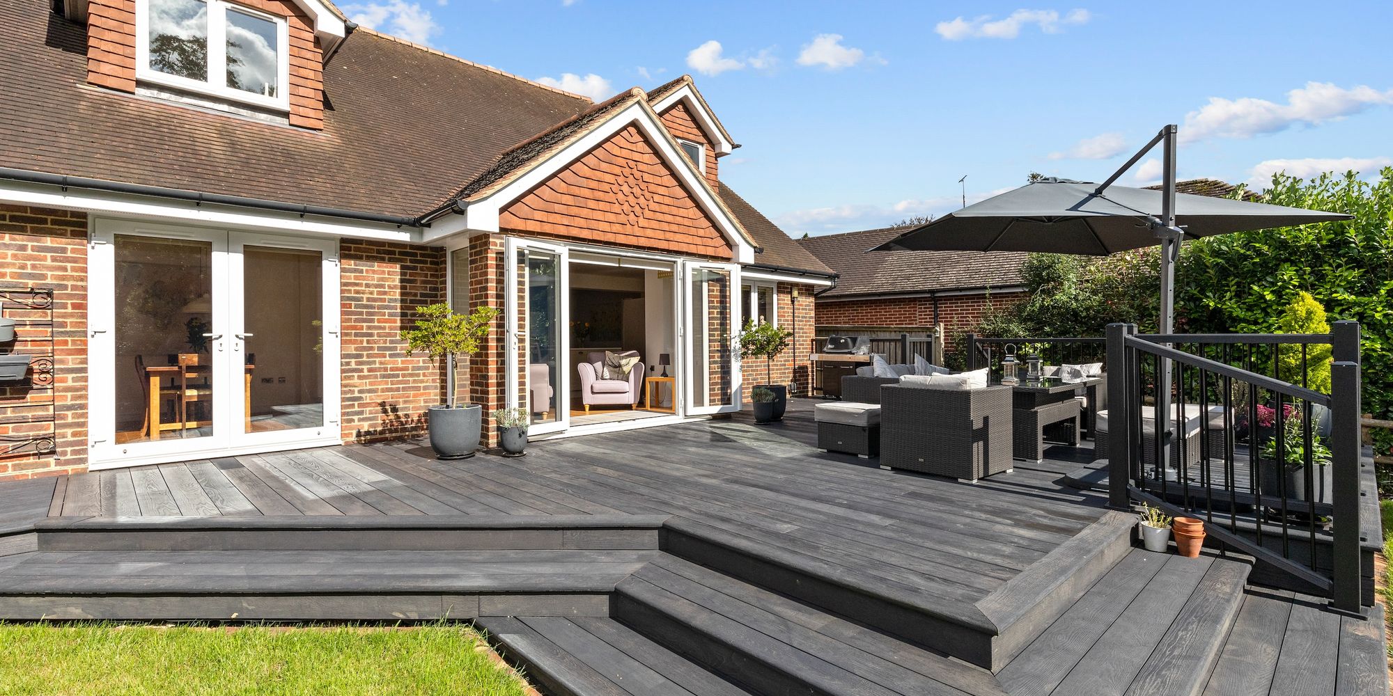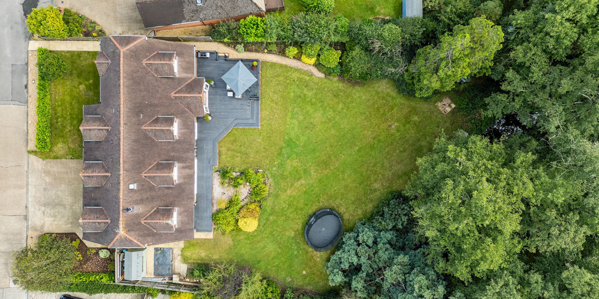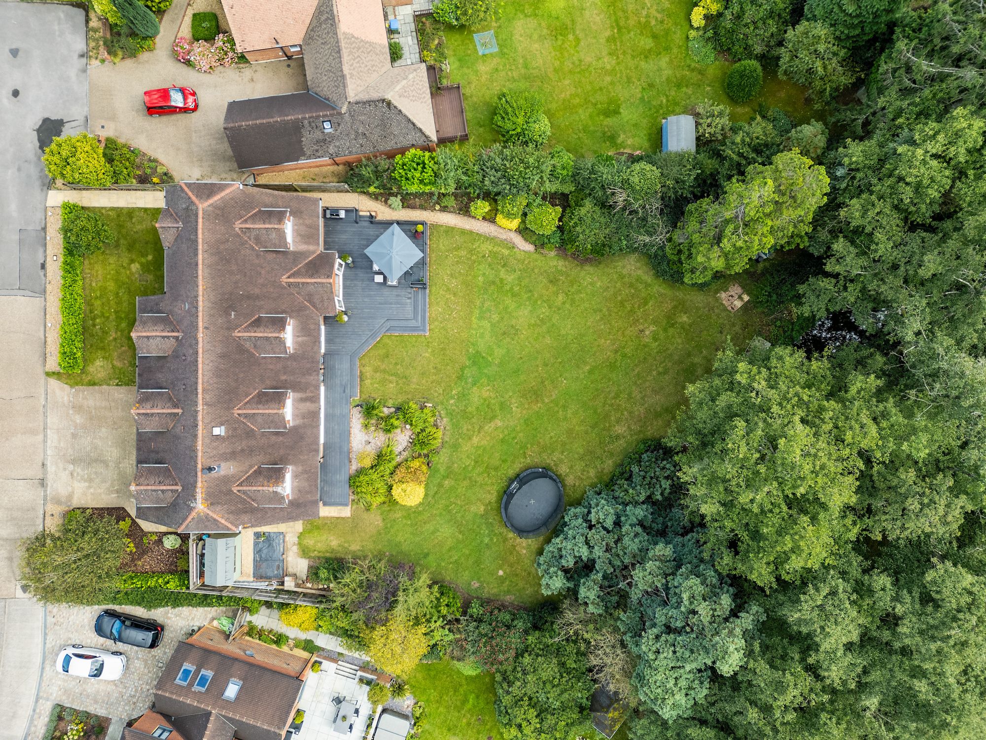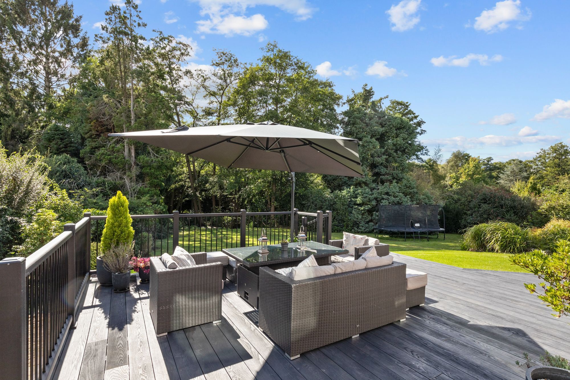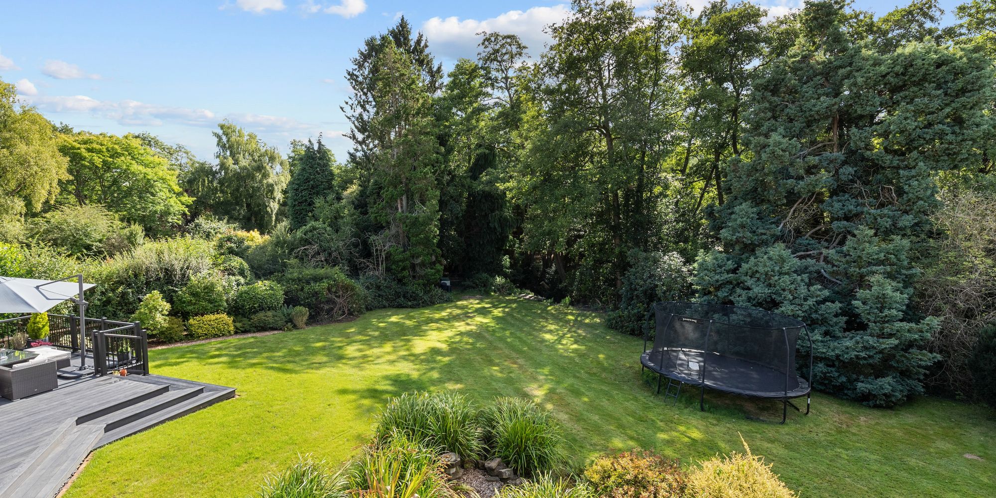The 123’ X 117’ south west facing plot offers a significant amount of privacy and a peaceful environment to relax and entertain in. The garden is predominantly lawned with mature borders, a newly installed and substantial composite decked seating area, loggia and side access.