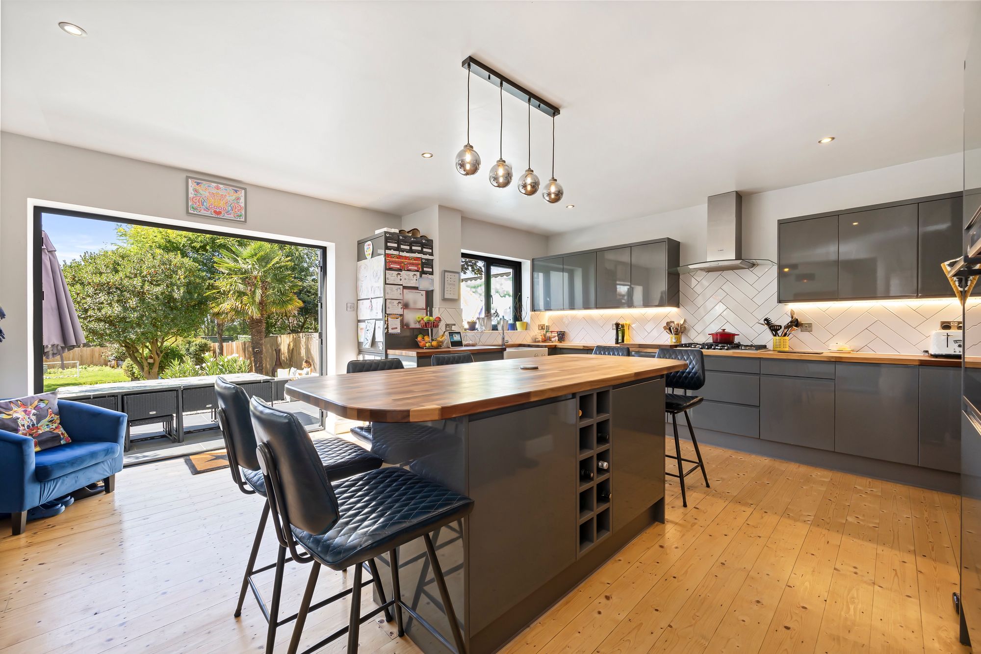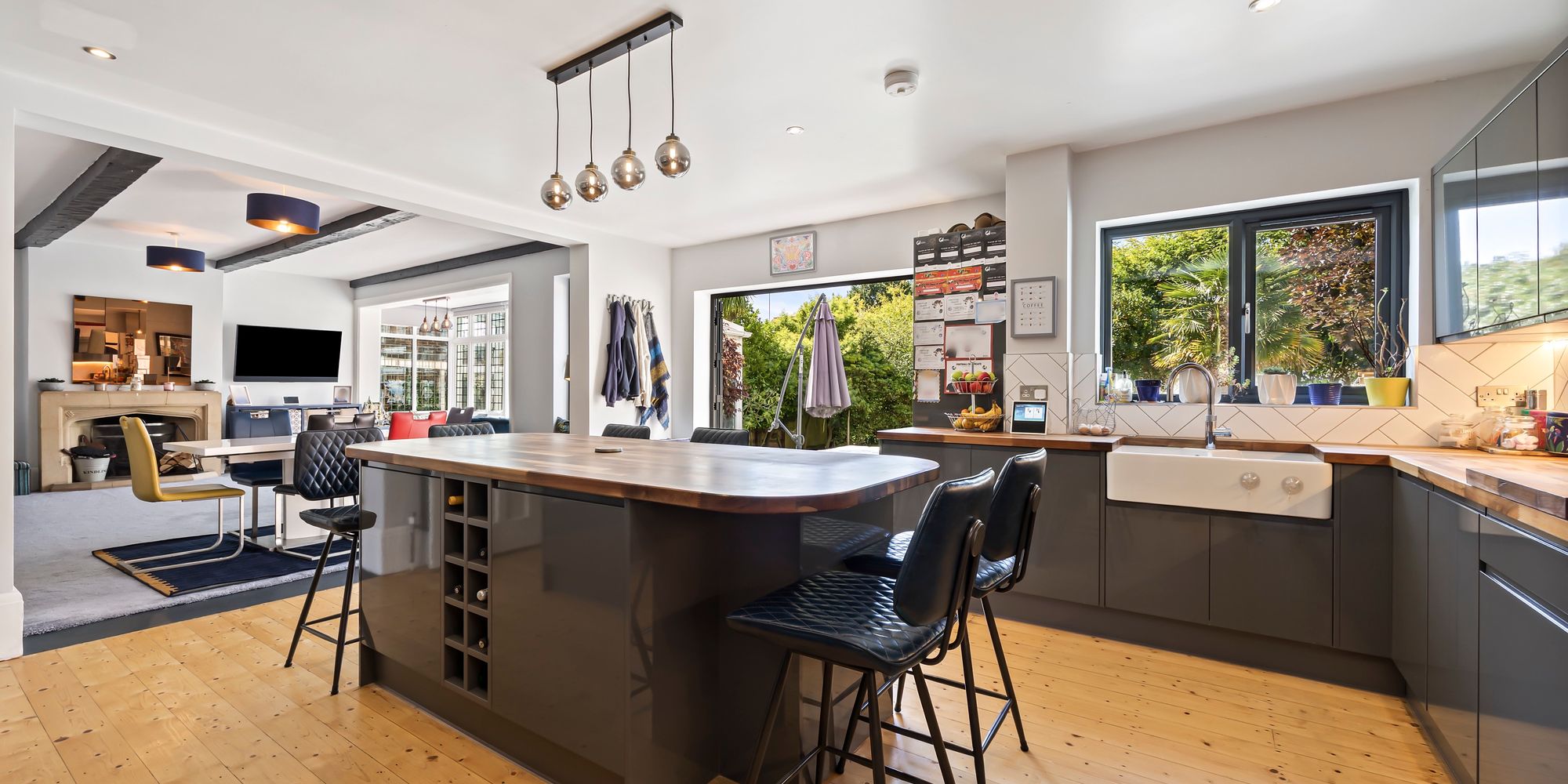 Introducing a stunning property, a gorgeous five double bedroom detached family home. Spanning over 3,100 square feet across three floors, this residence exudes elegance and comfort. Upon entry, you are greeted by a plush open plan kitchen featuring a striking feature island, built-in appliances, and a separate utility room, catering to the needs of a modern family.