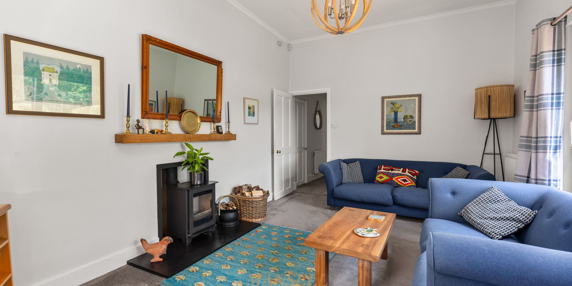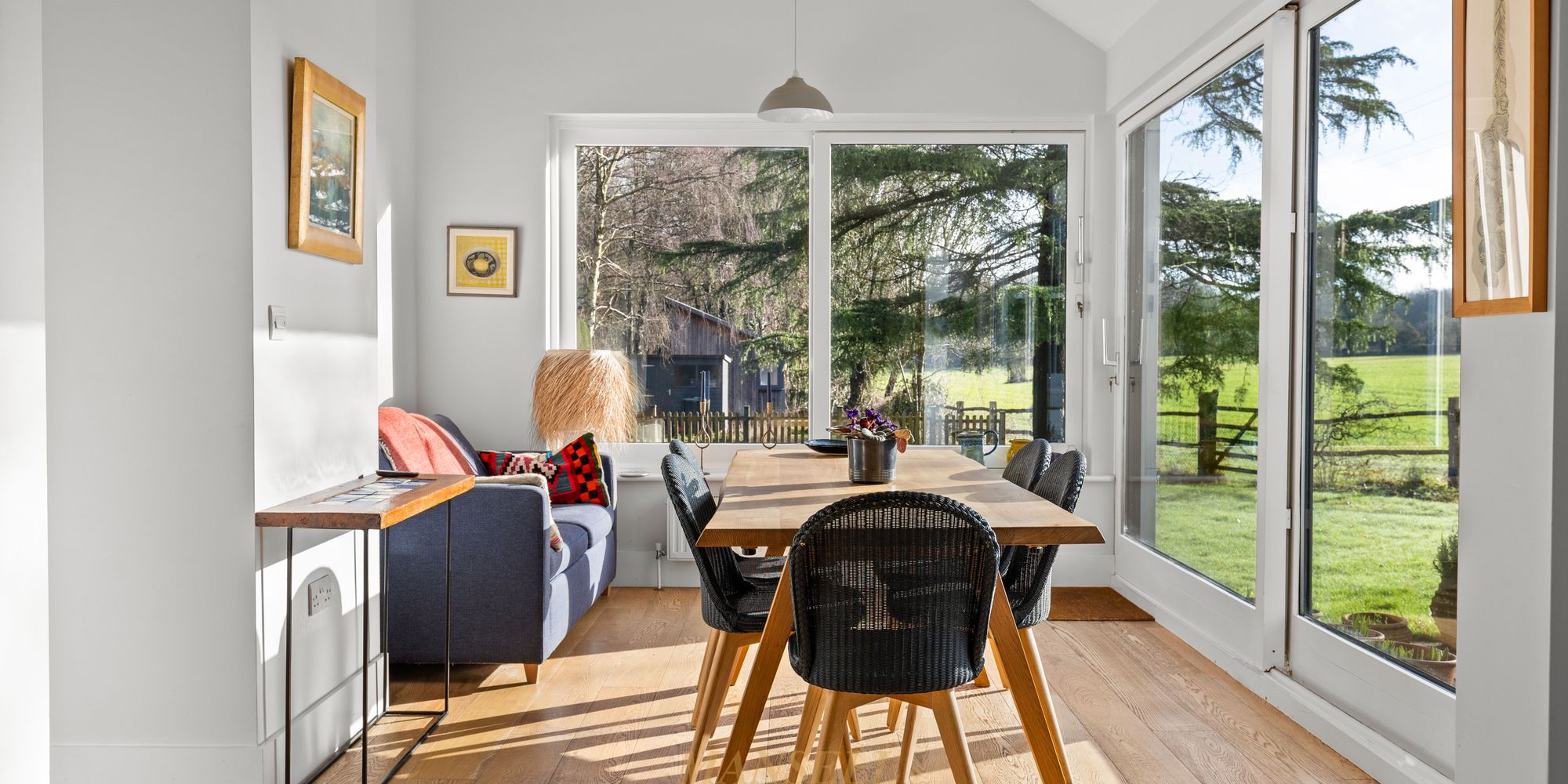 Upon entering, you are greeted by a welcoming hallway leading to a conveniently located downstairs cloakroom and stairs leading to the first floor. Continuing down the hallway is the dual aspect living room, bathed in natural light and features patio doors opening to the beautiful rear garden with stunning views beyond, as well as an inviting inset log burner with a solid oak mantle, creating a cosy atmosphere.