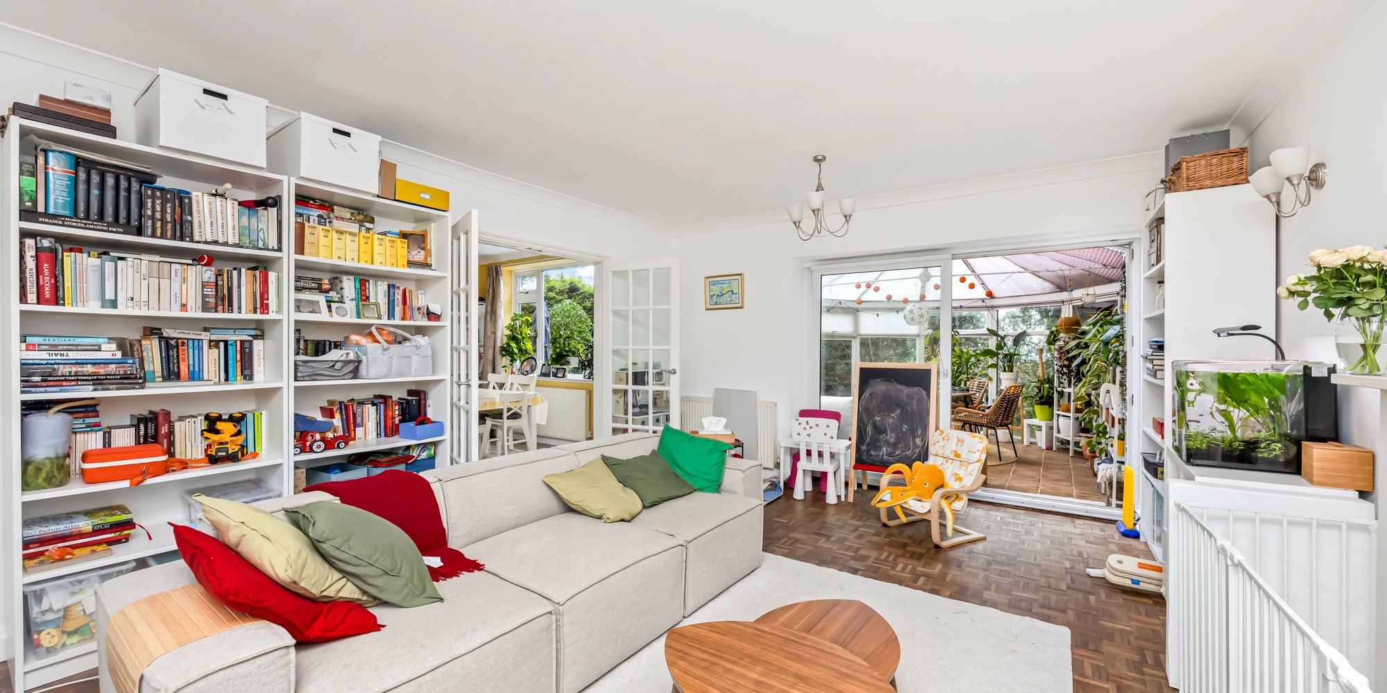 Upon entry, residents are greeted by the spacious hallway with access to the conveniently placed w/c and a handy storage cupboard providing space for shoes and coats. Heading right, the dual-aspect living room creates a bright and inviting space to relax and unwind taking centre stage around the feature fireplace whilst parquet flooring runs underfoot. The conservatory leads from the rear offering a panoramic view of the garden enhanced by the favourable South-facing orientation - adding an excellent sunroom, playroom or additional seating area.