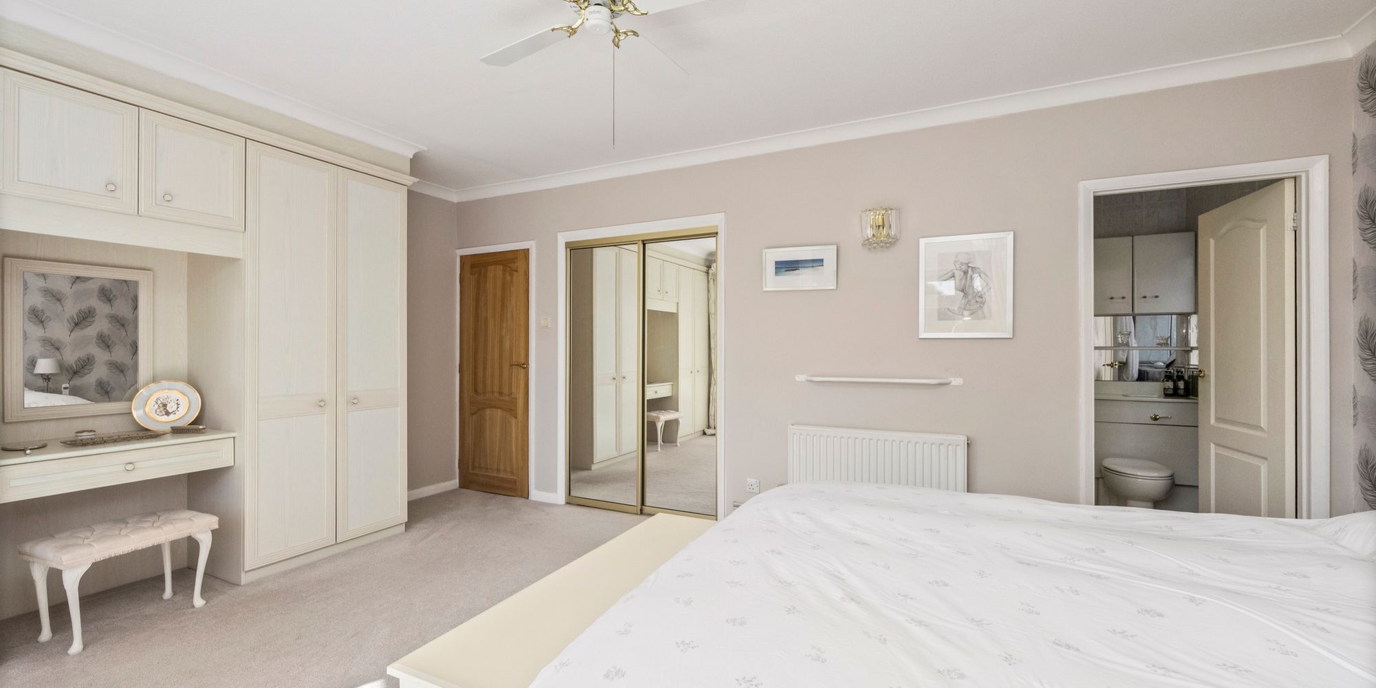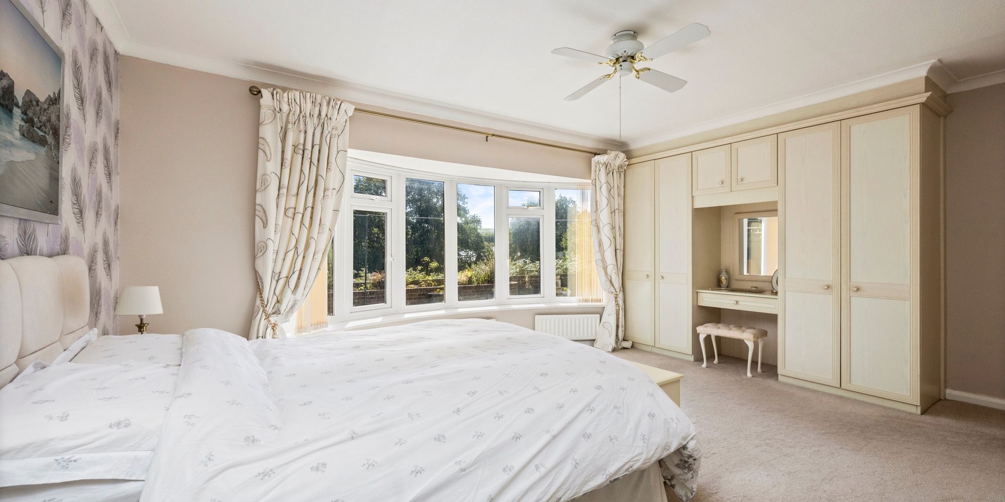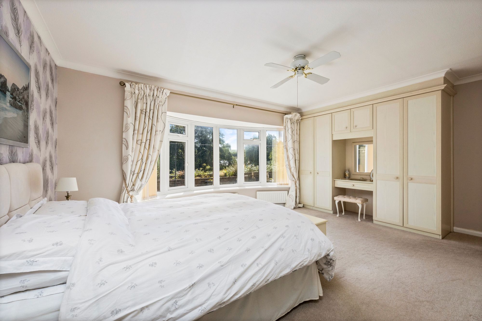 Master Bedroom: uPVC double glazed curved bay window to rear, built in and fitted wardrobes, fitted carpet, door to:-