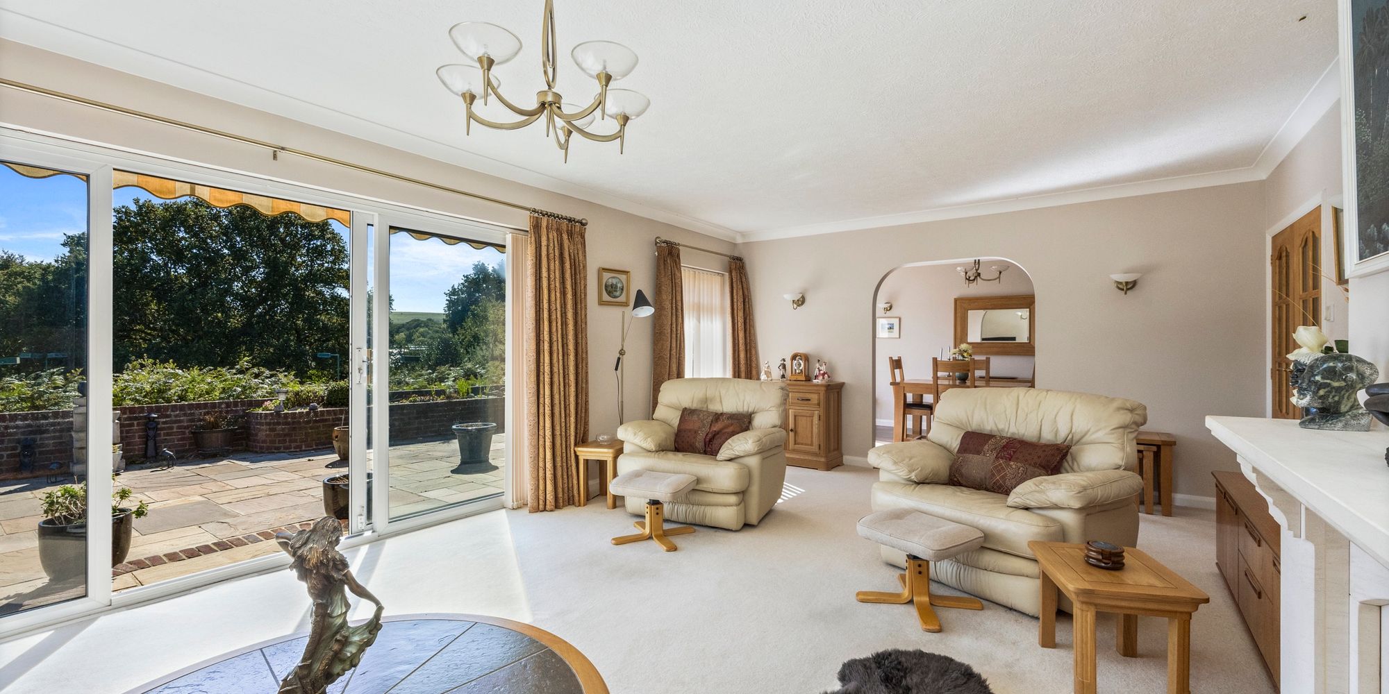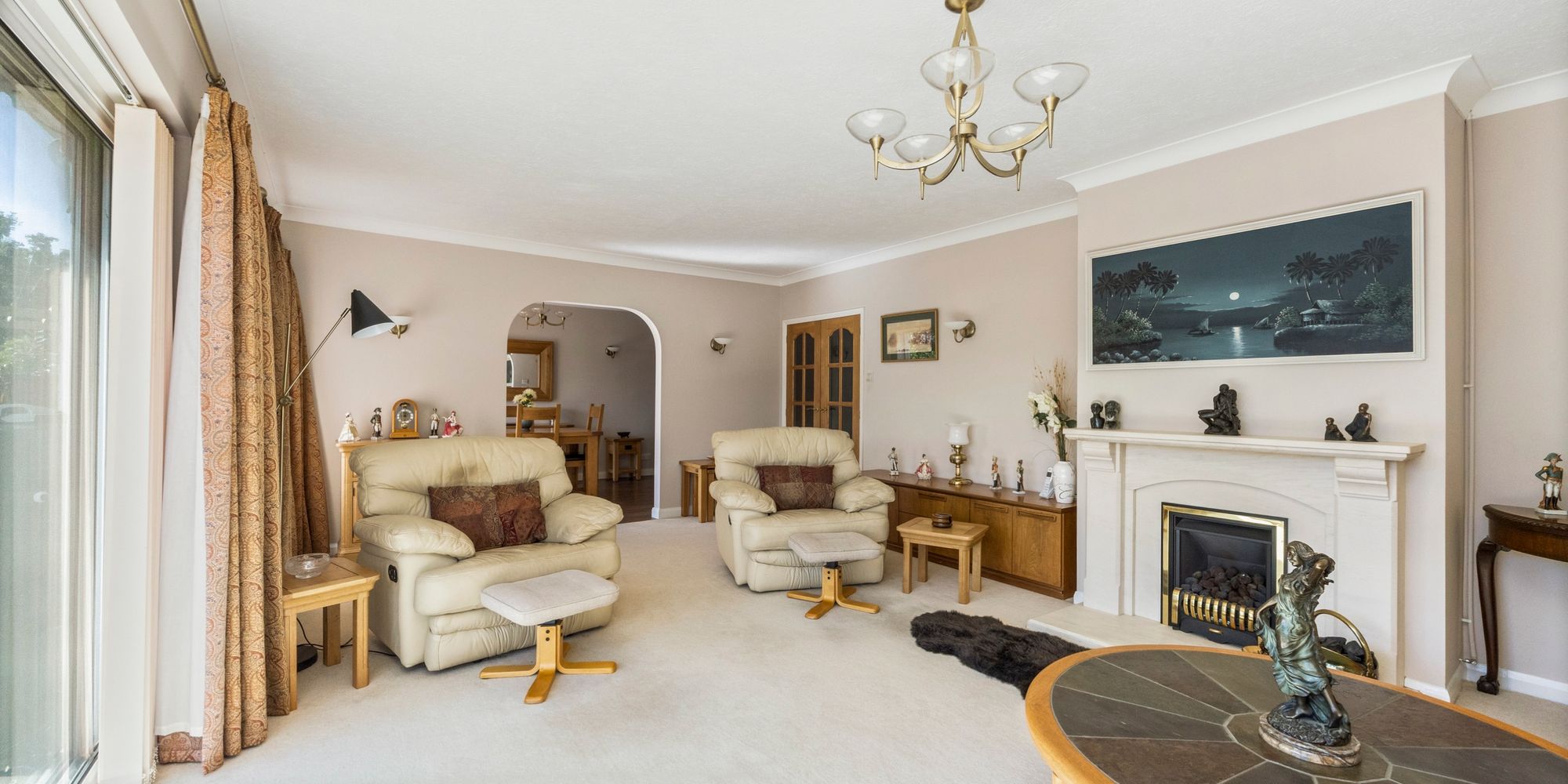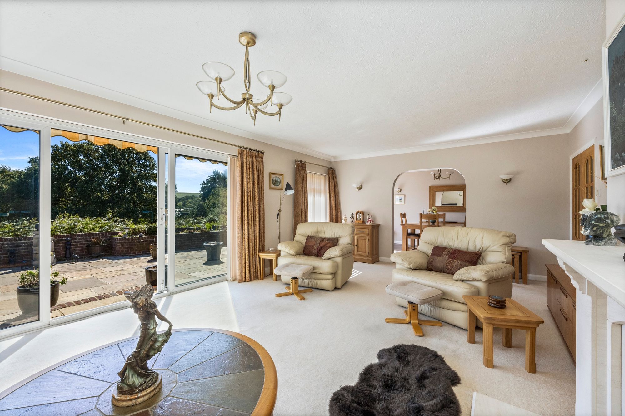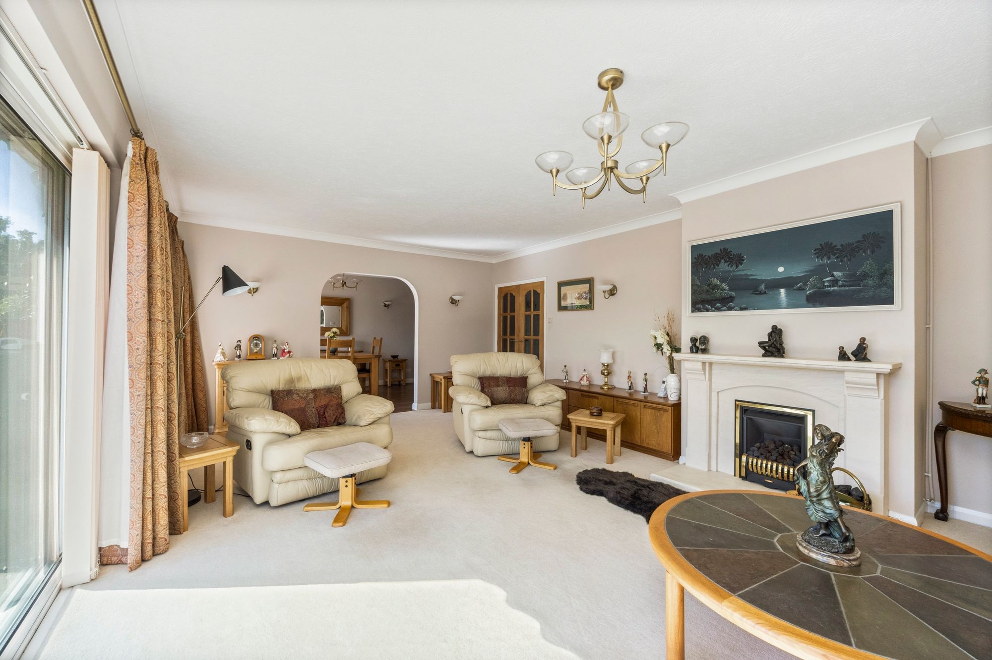 Sitting Room: fitted carpet, feature fireplace with fitted flame effect gas fire, uPVC double glazed window and wide set of patio doors facing South, archway to:-