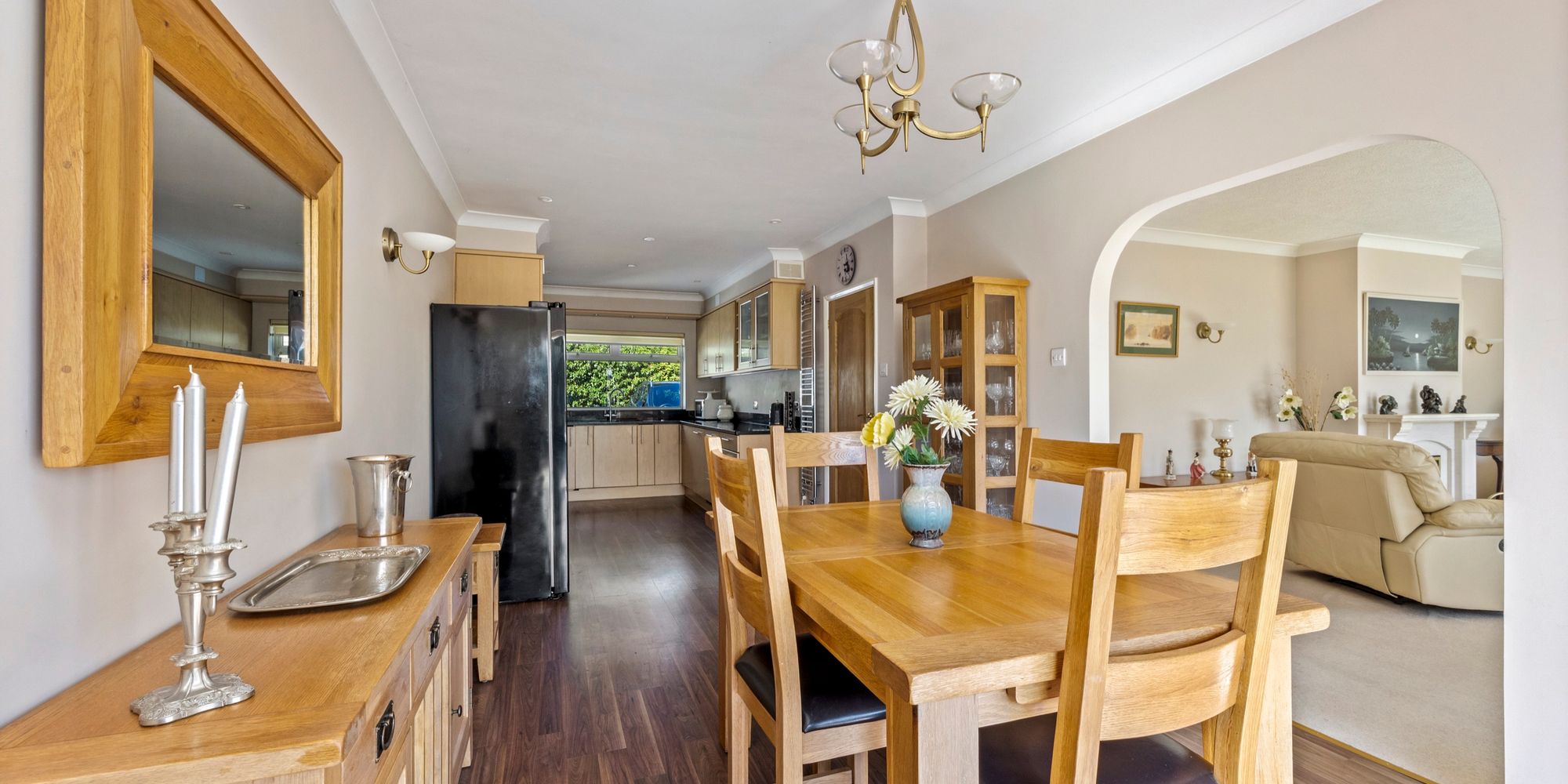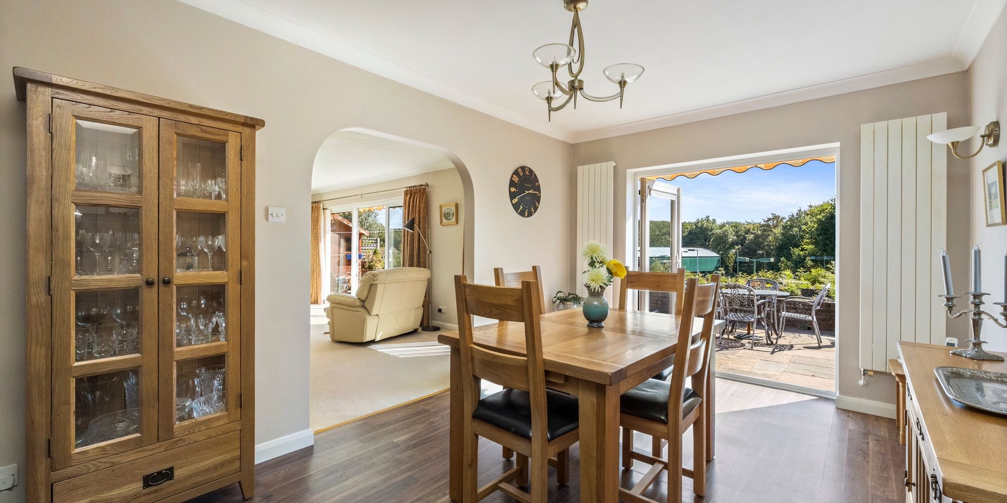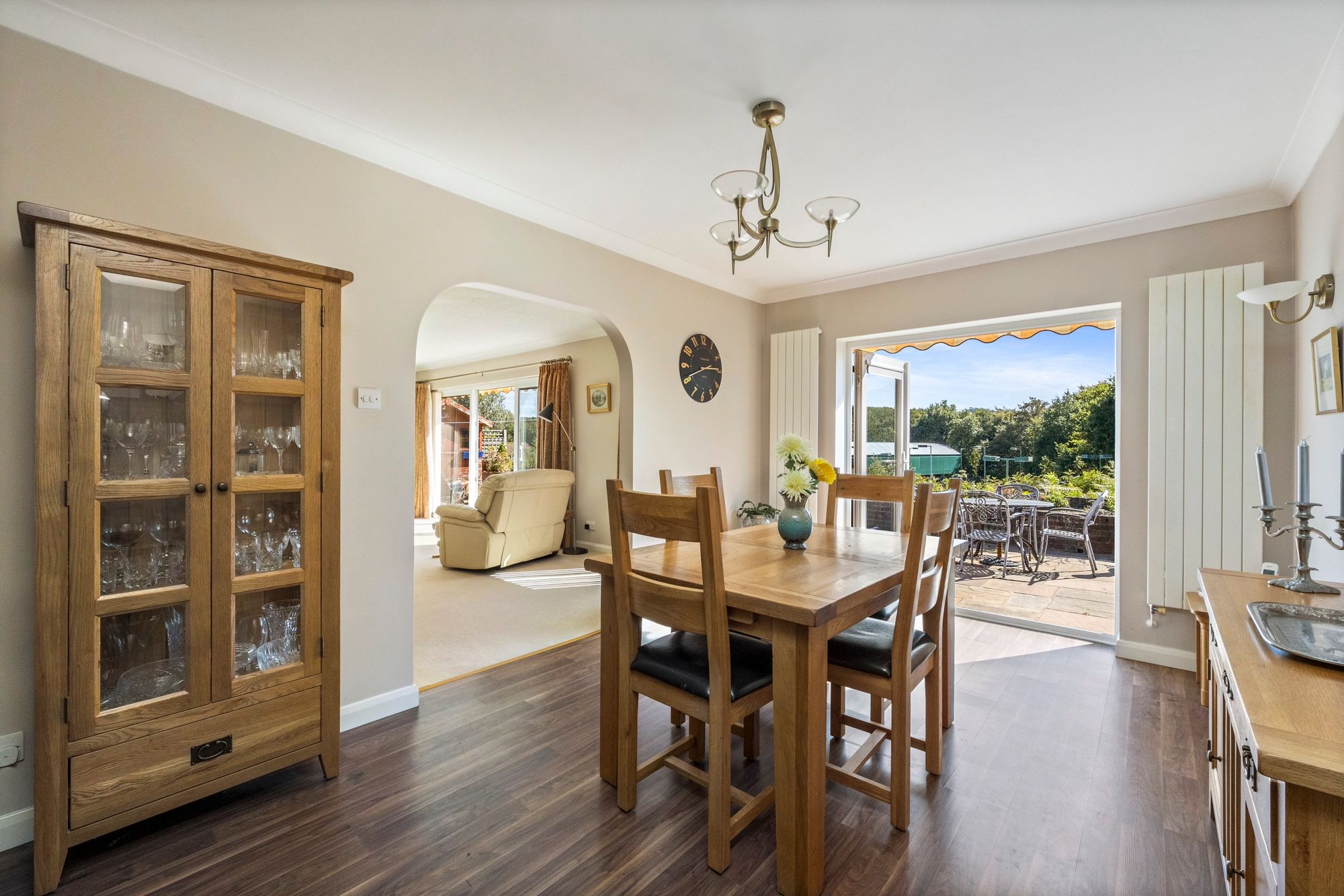 Dining Area: wood laminate floor, door to hall, arch to sitting room, uPVC double glazed double doors to South facing rear garden.