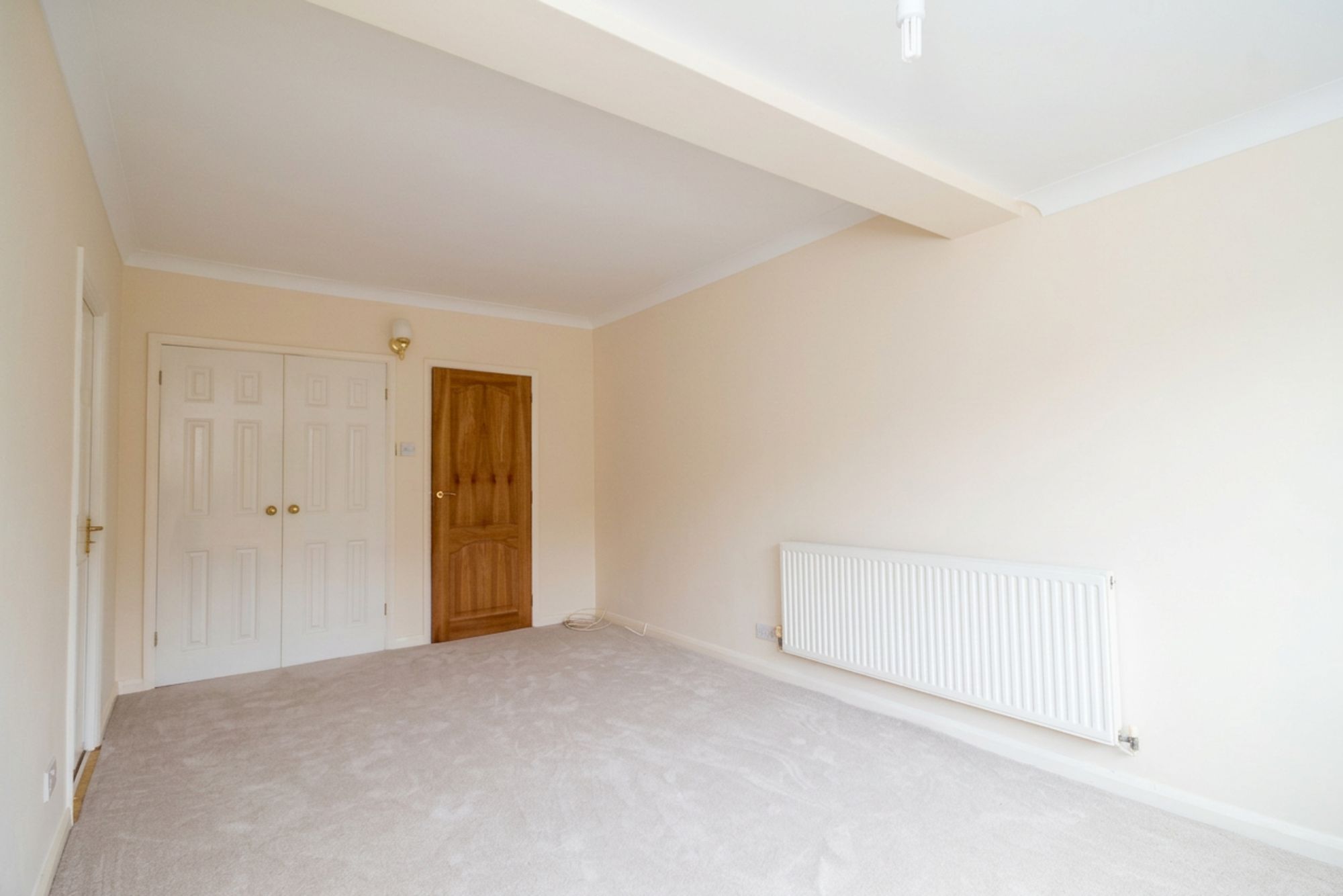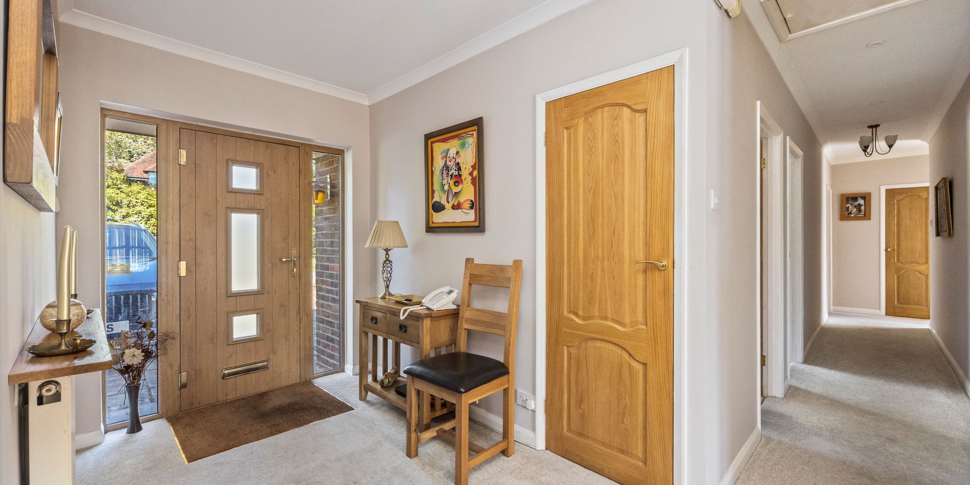 Hall: fitted carpet and two built in storage cupboards, loft hatch with pull down ladder, doors to all principal rooms, panelled glazed double doors to:-
