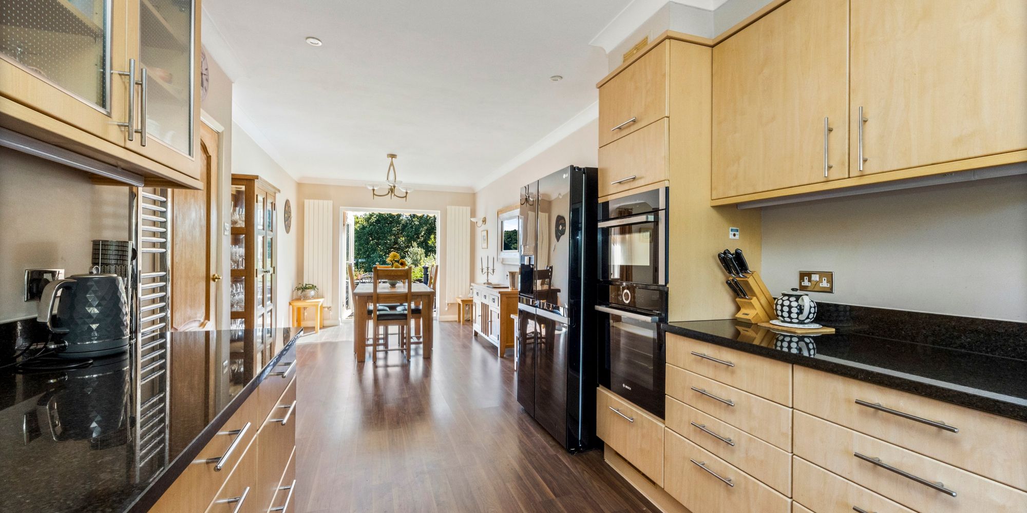 Kitchen Area: light beech wood effect wall and base units with chrome door furniture, Black granite worktops and returns, integrated stainless steel 1 and quarter basin sink unit, ‘AEG’ induction hob with concealed hood over, Integrated ‘Bosch’ multi function oven, further ‘Bloomburg’ oven/grill, integrated ‘Bosch’ dishwasher, integrated ‘Bloomberg washing machine, space for American fridge freezer, wood laminate floor, uPVC double glazed window to front.