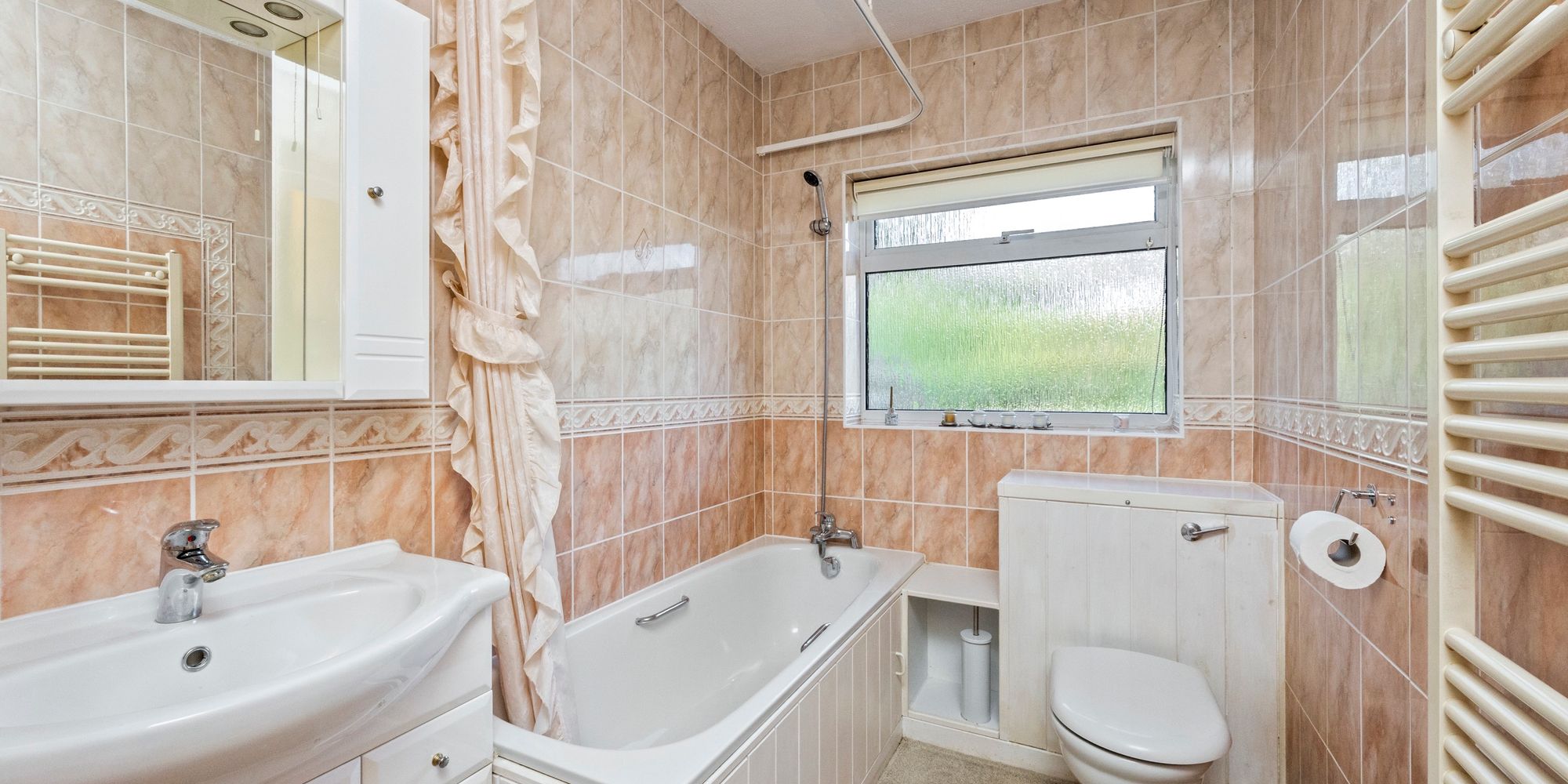 Family Bathroom: White suite, panel enclosed bath, low level WC, vanity unit with onset wash hand basin, fitted carpet, tiled walls, uPVC double glazed window to front.