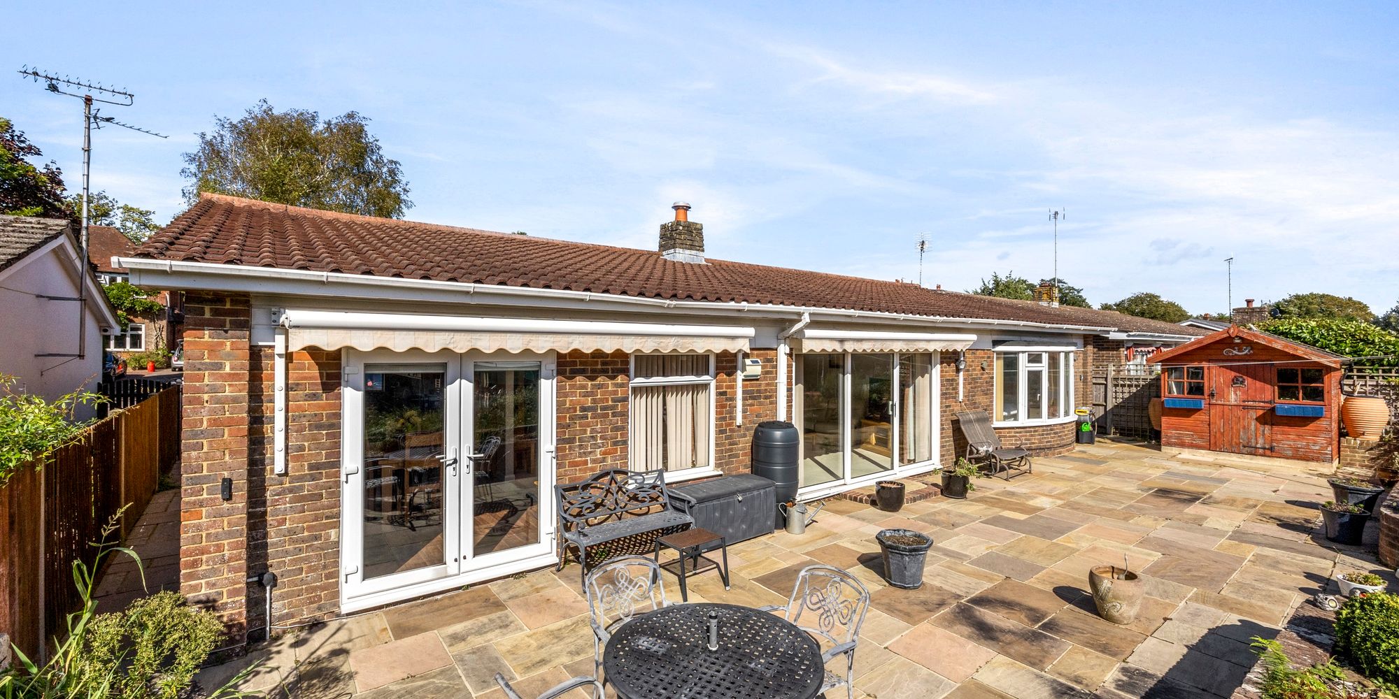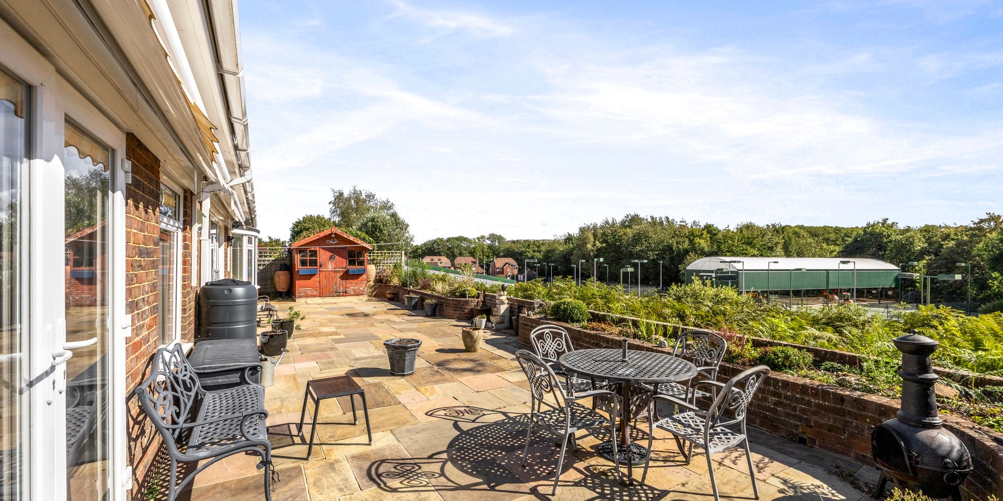 South Facing Low Maintenance Garden: Indian sand stone paving, raised brick planters, timber shed, two electric sun awnings, gated access each side, views over tennis club to South Downs National Park and Jack and Jill windmills.