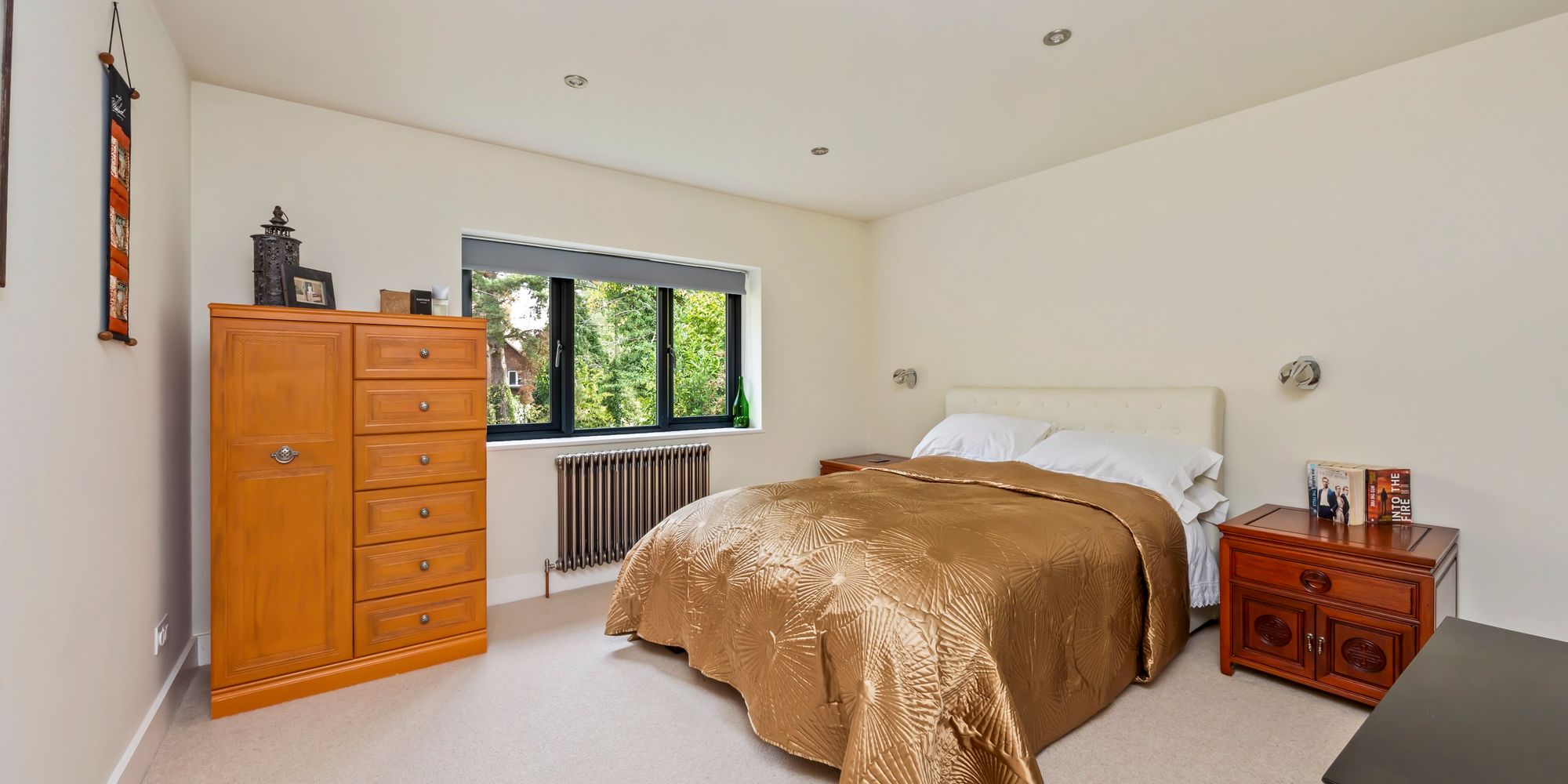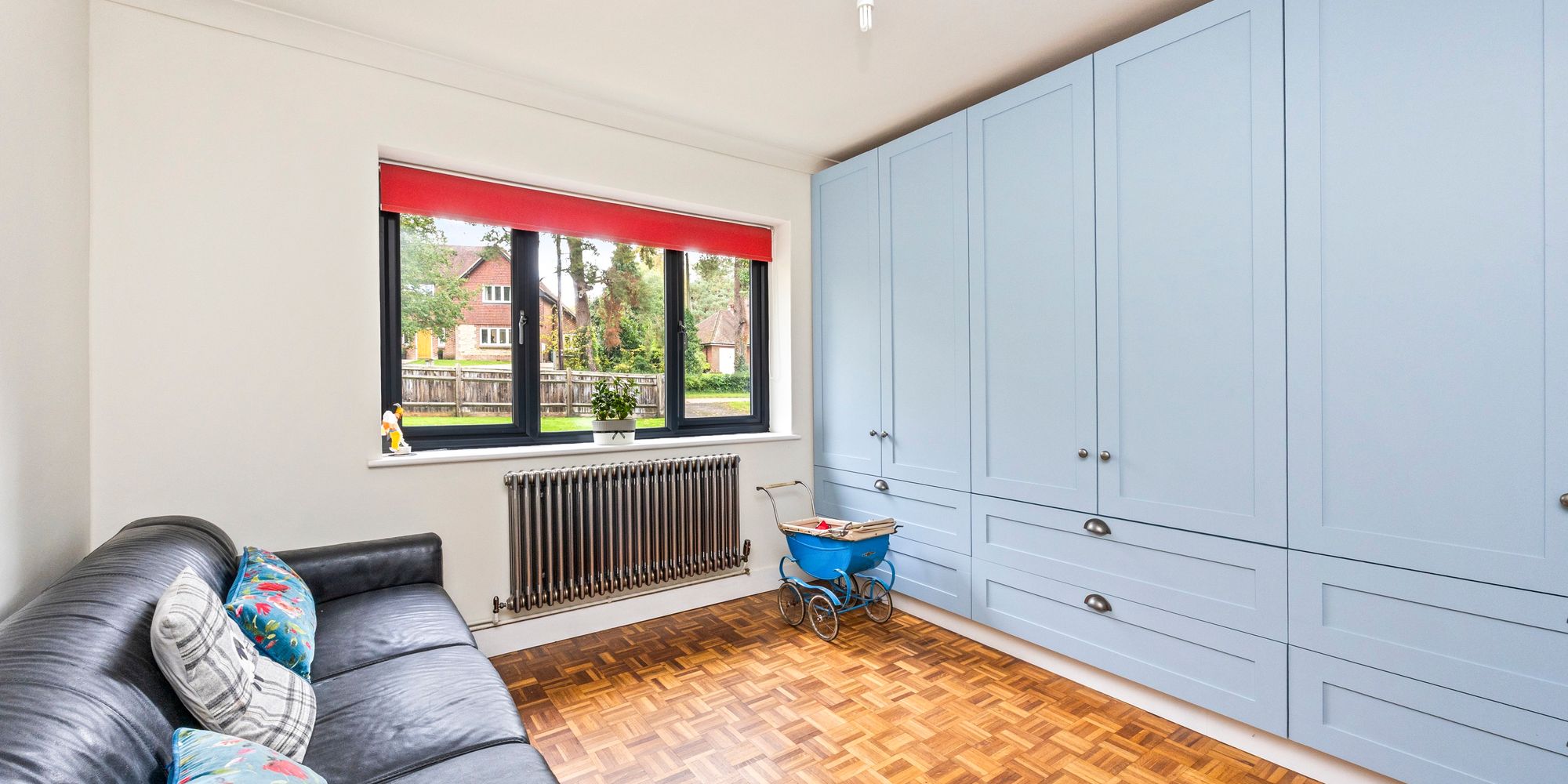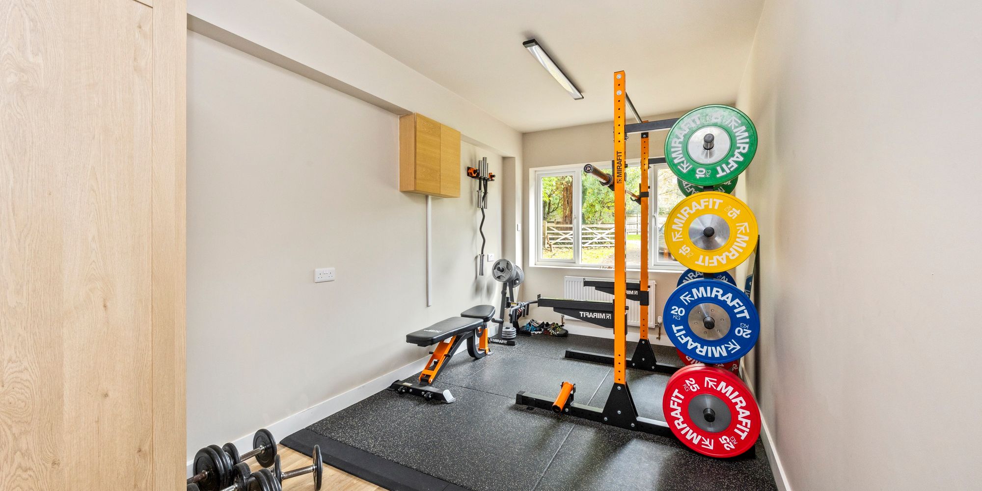 The ground floor also houses a family room with a charming bay window and wood-burning stove, a triple aspect sitting room with bi-folding doors, and an additional reception room boasting built-in storage and currently utilised as a home office but versatile as a fifth bedroom. Previously the garage, this space has been converted into a superb home gym but offers the potential for alternative configurations.