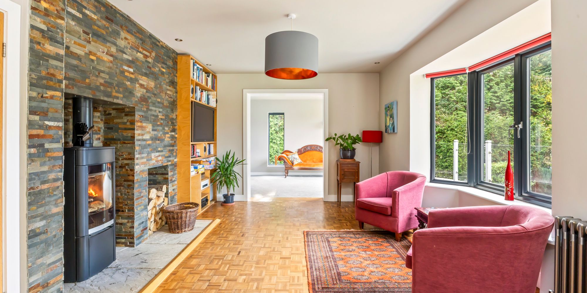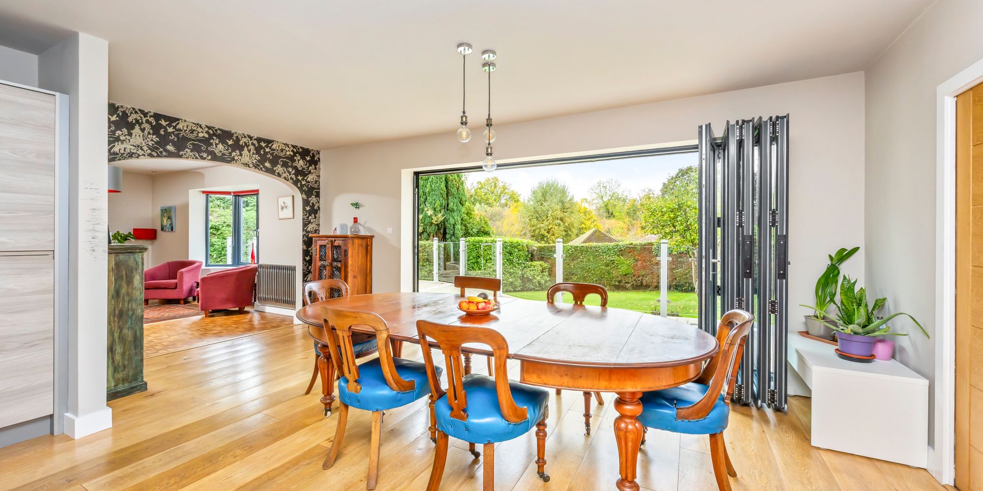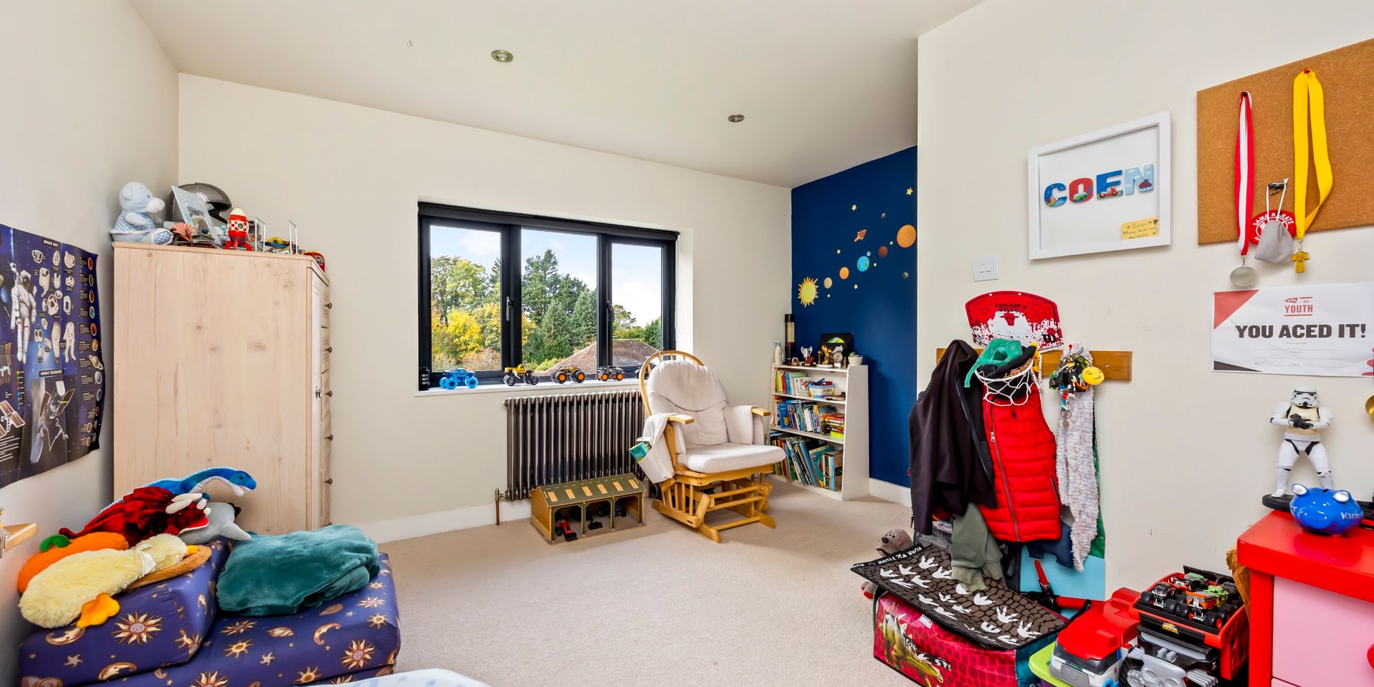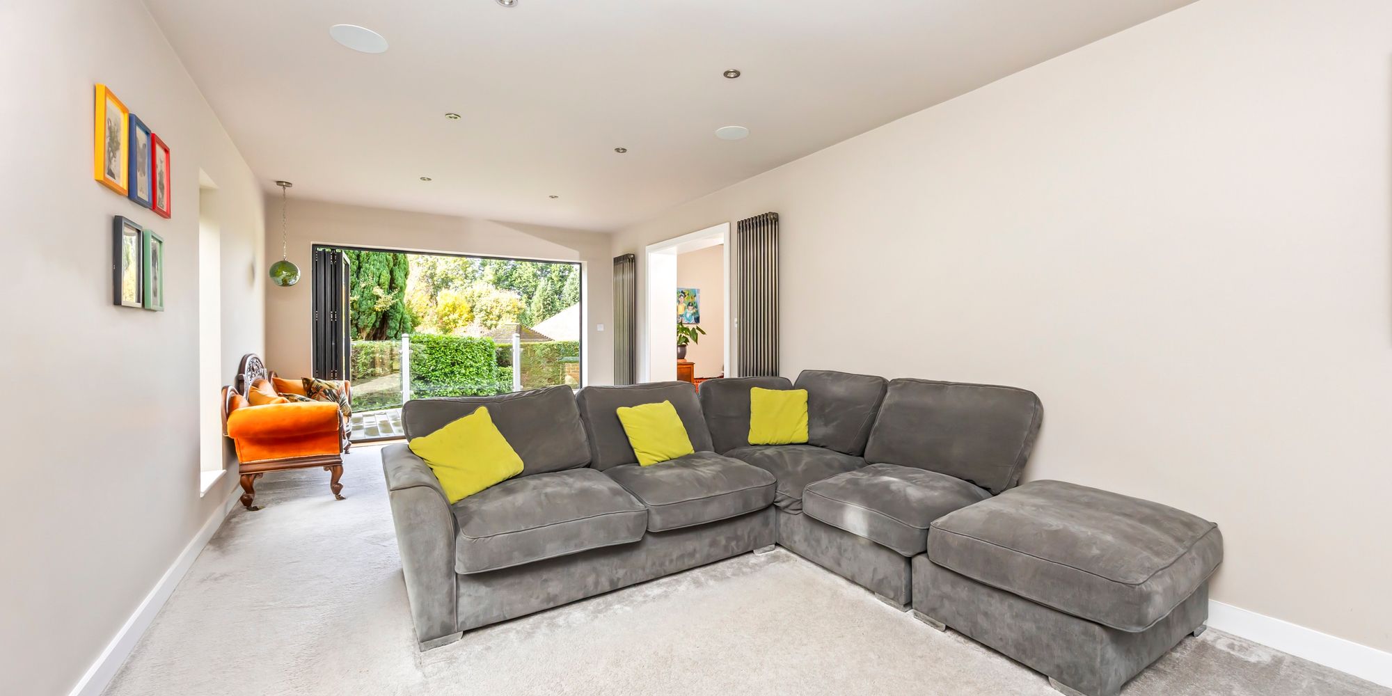 The ground floor also houses a family room with a charming bay window and wood-burning stove, a triple aspect sitting room with bi-folding doors, and an additional reception room boasting built-in storage and currently utilised as a home office but versatile as a fifth bedroom. Previously the garage, this space has been converted into a superb home gym but offers the potential for alternative configurations.