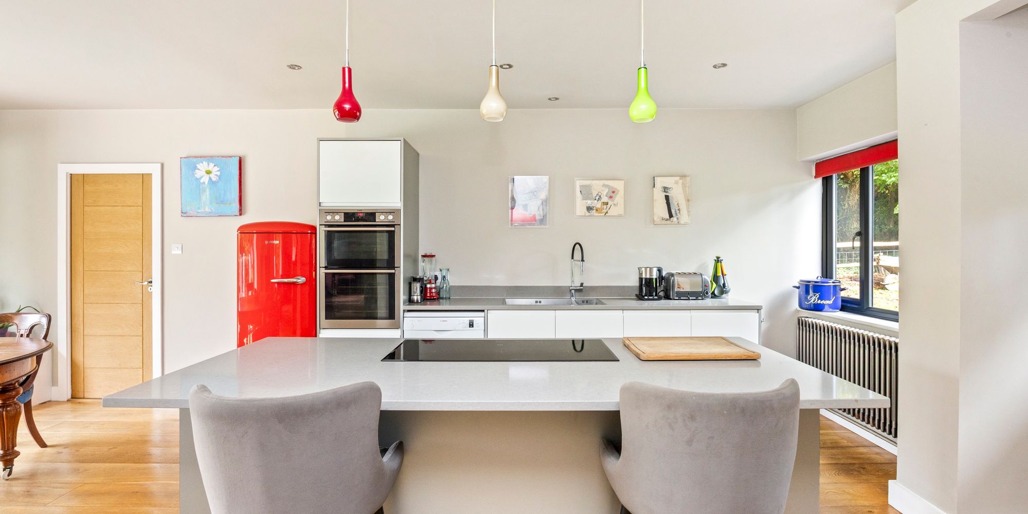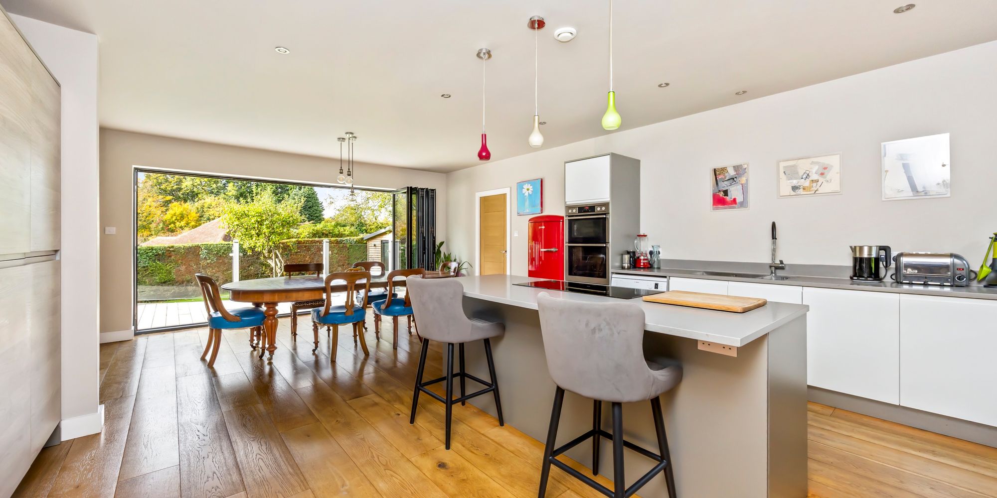 Once inside, the entrance hall welcomes you with parquet flooring, fitted storage for coats and shoes, and a convenient separate cloakroom. The heart of this home lies in the showstopping kitchen/dining/family room, featuring modern fitted units, a central island, and ample space for a large dining table, complemented by bi-folding doors leading out to the garden. The kitchen comes fully equipped with integrated AEG appliances and provisions for freestanding ones, while a separate utility room provides added convenience with access to the garden.