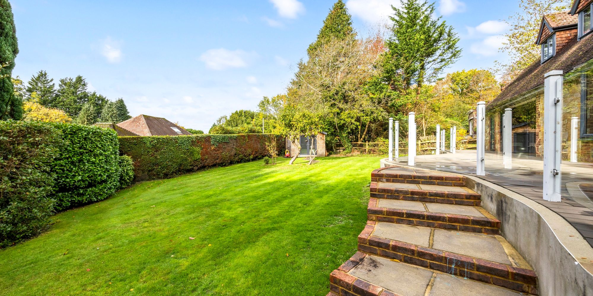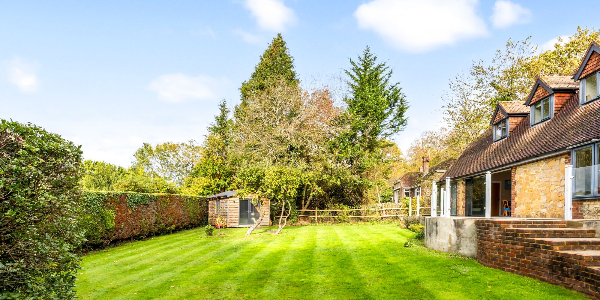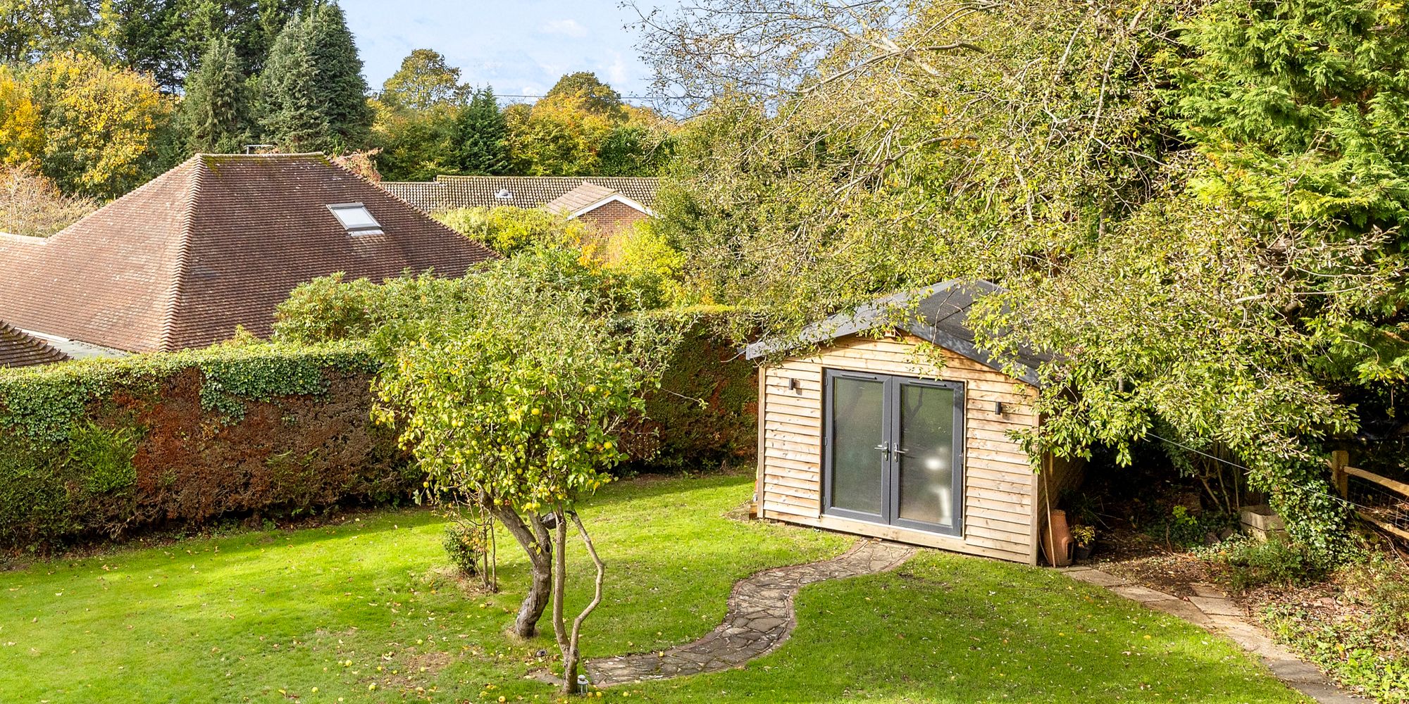 Outside, a raised decked patio, secured by glass balustrades, provides an idyllic setting for outdoor entertainment, leading to a sprawling lawn adorned with mature shrubs, hedgerows, and trees offering privacy, complete with a charming treehouse. An outbuilding with power presents versatile options for additional living space or a workshop.