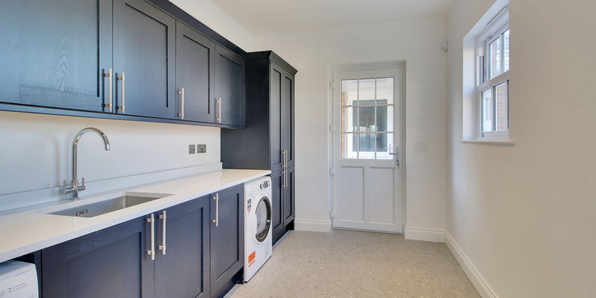 The Kitchen: Very much the most distinguishing room of the property, beautifully fitted with bespoke units to eye and base level with a range of Neff ovens and integrated appliances. The central island has a matching quartz worksurface with an induction hob and oven. A fully equipped utility room is found nearby with a door leading to a covered entrance to the double garage.