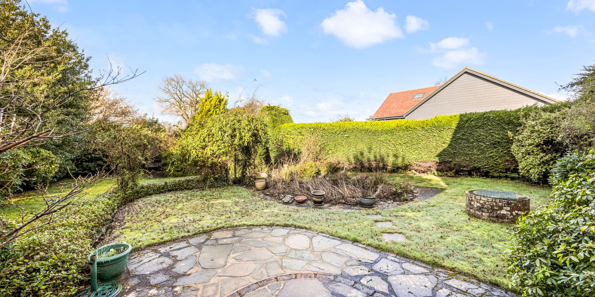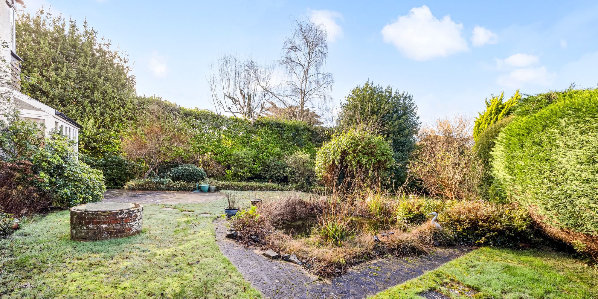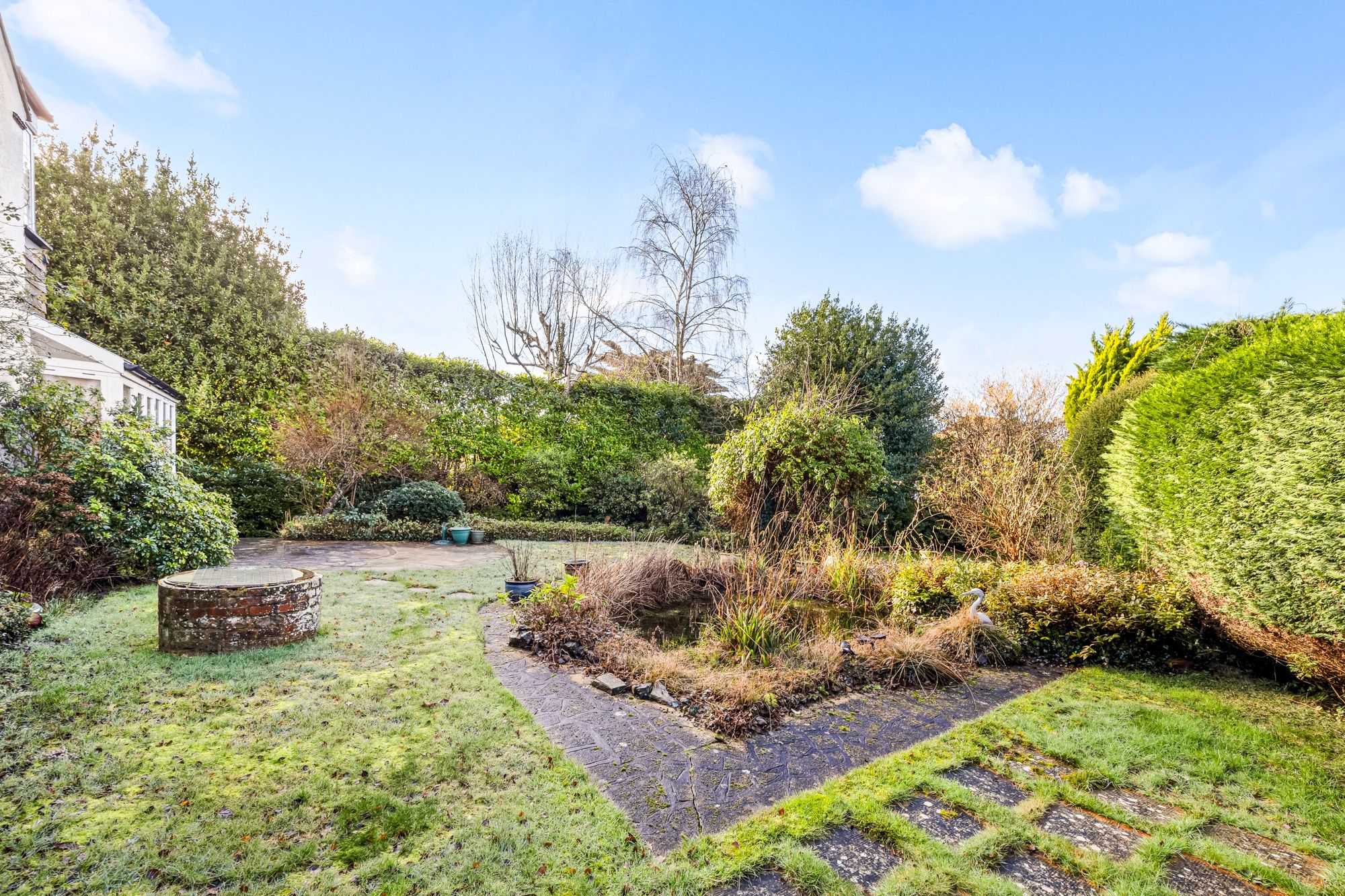 - Secluded mature rear garden with patio and pond