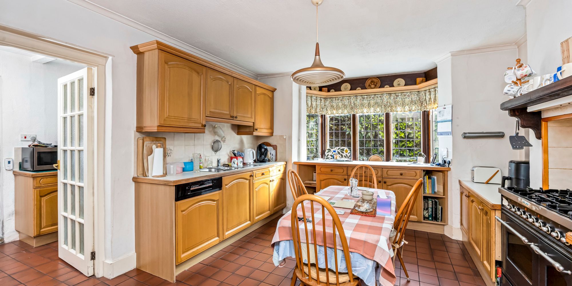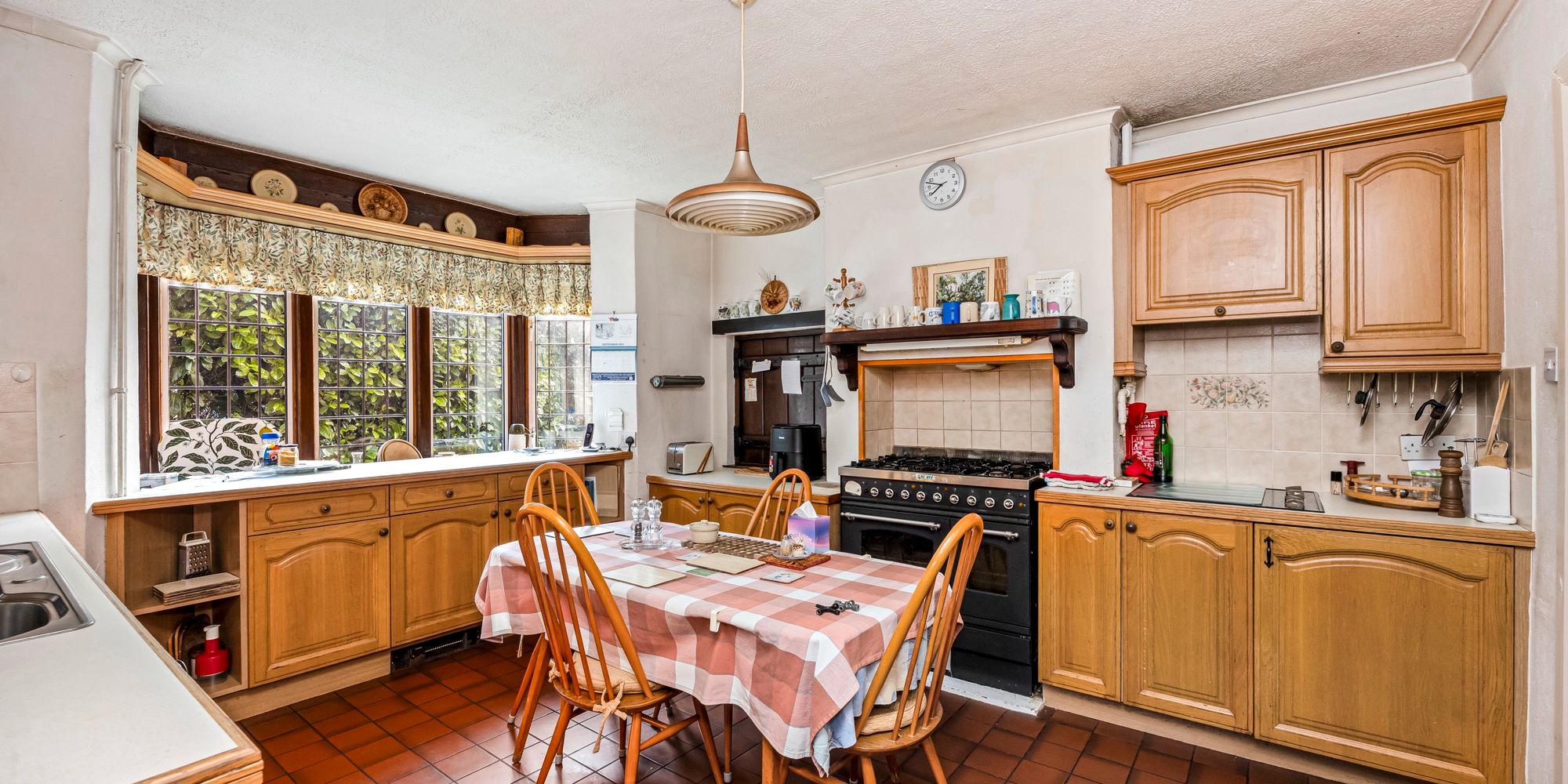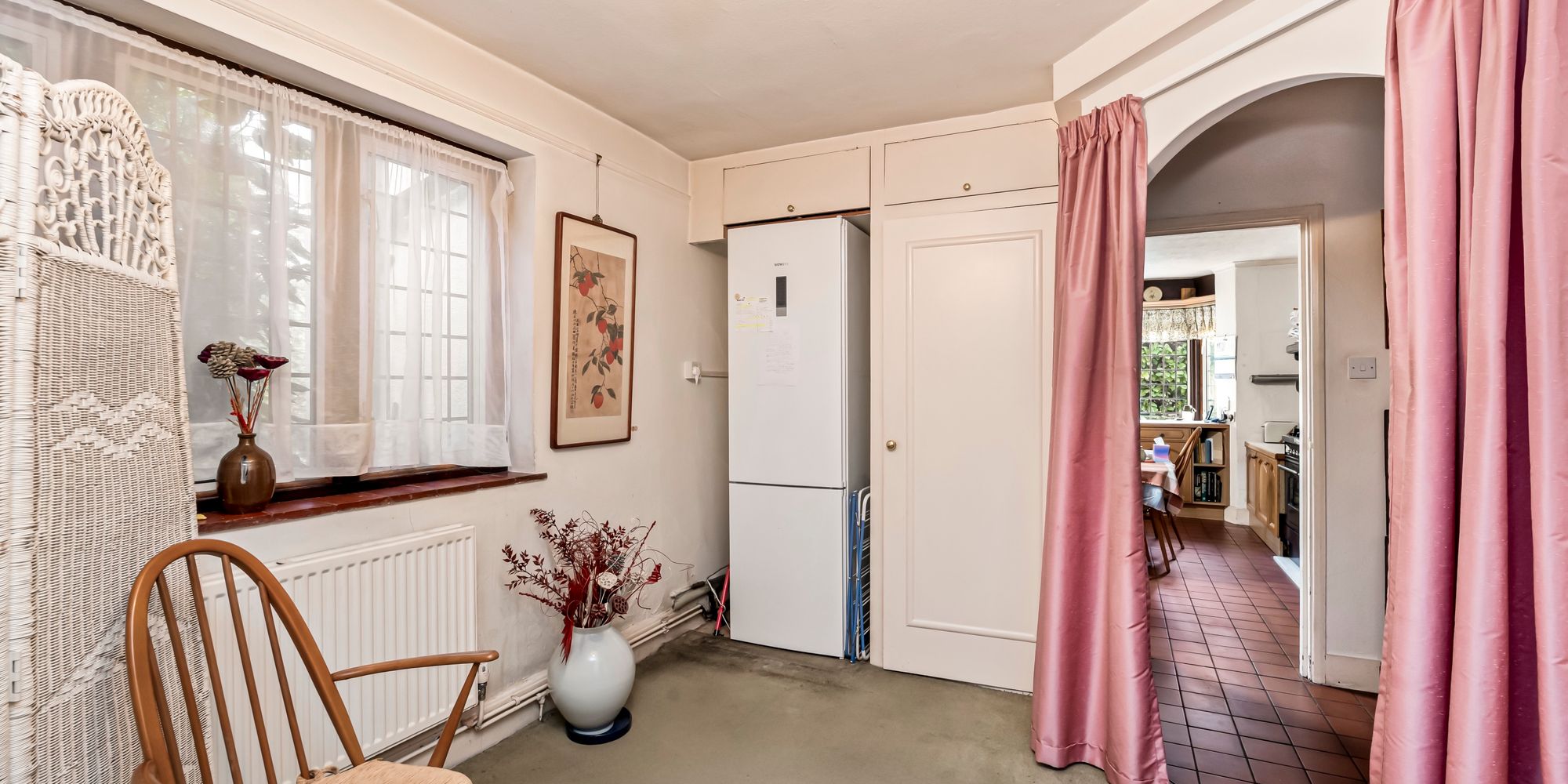 Upon entering, you are welcomed by a generous living room that boasts an open fireplace and a feature bay window, filling the space with natural light and providing an inviting setting for relaxation or entertaining guests. The kitchen is fitted with a selection of wall and base units, integrated appliances and space for additional freestanding appliances, and is complemented by a characterful wooden hatch that opens into the dining room (ideal for serving meals or maintaining a connection between the two spaces). Adjoining the kitchen is a utility room, offering further storage options and convenient access to the side of the property. The charming dining room provides ample space for a sizeable dining table, features its own open fireplace and enjoys a bay window overlooking the front of the home, making it perfect for family gatherings and entertaining. A further reception room leads through double doors to a spacious conservatory, which can be enjoyed all year round and offers a versatile space for relaxing or dining, with views over the garden. In addition, there is a versatile room with built-in storage that could serve as a ground floor bedroom, particularly as it is situated adjacent to a large shower room, making it ideal for guests or multi-generational living.