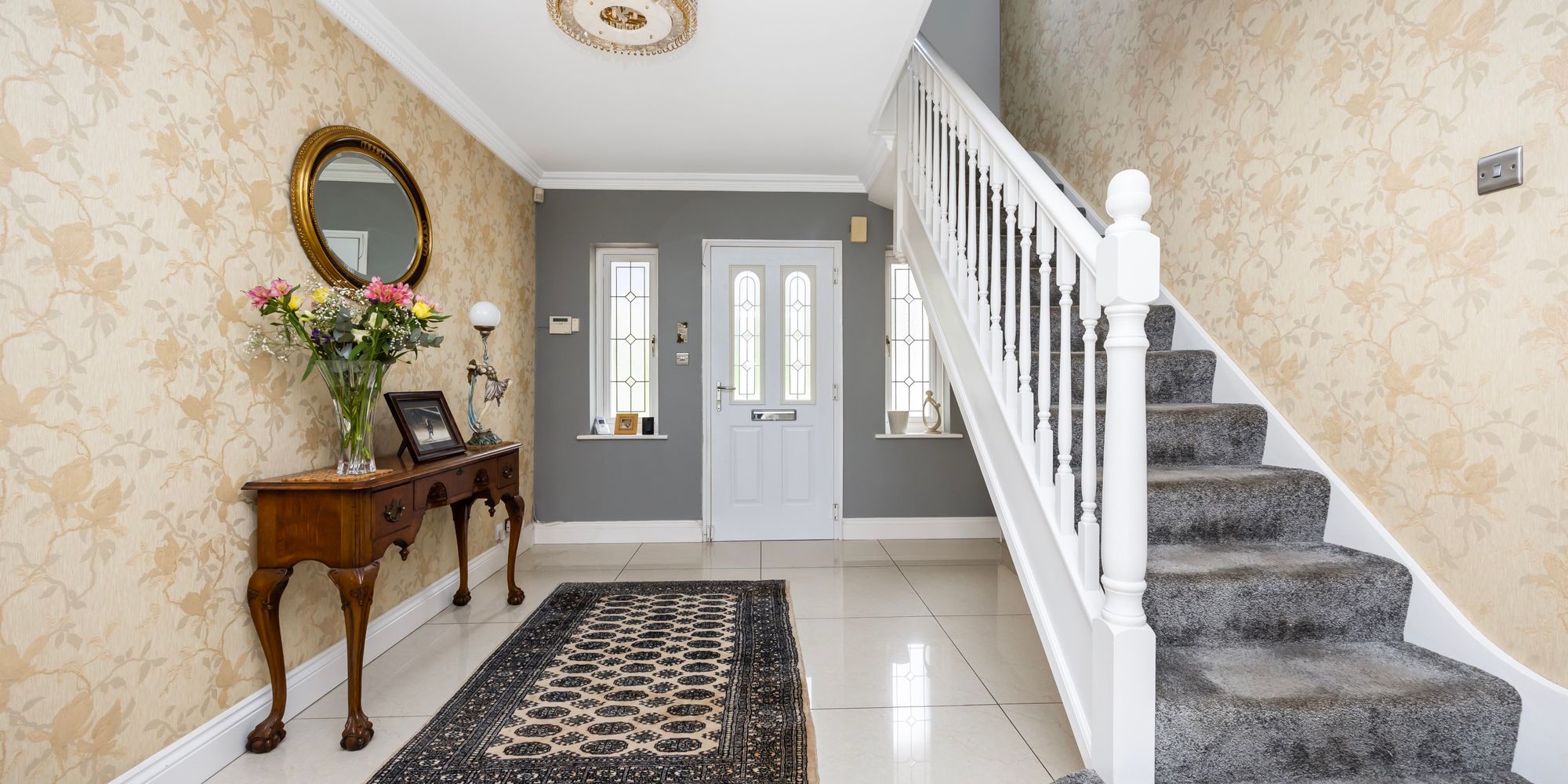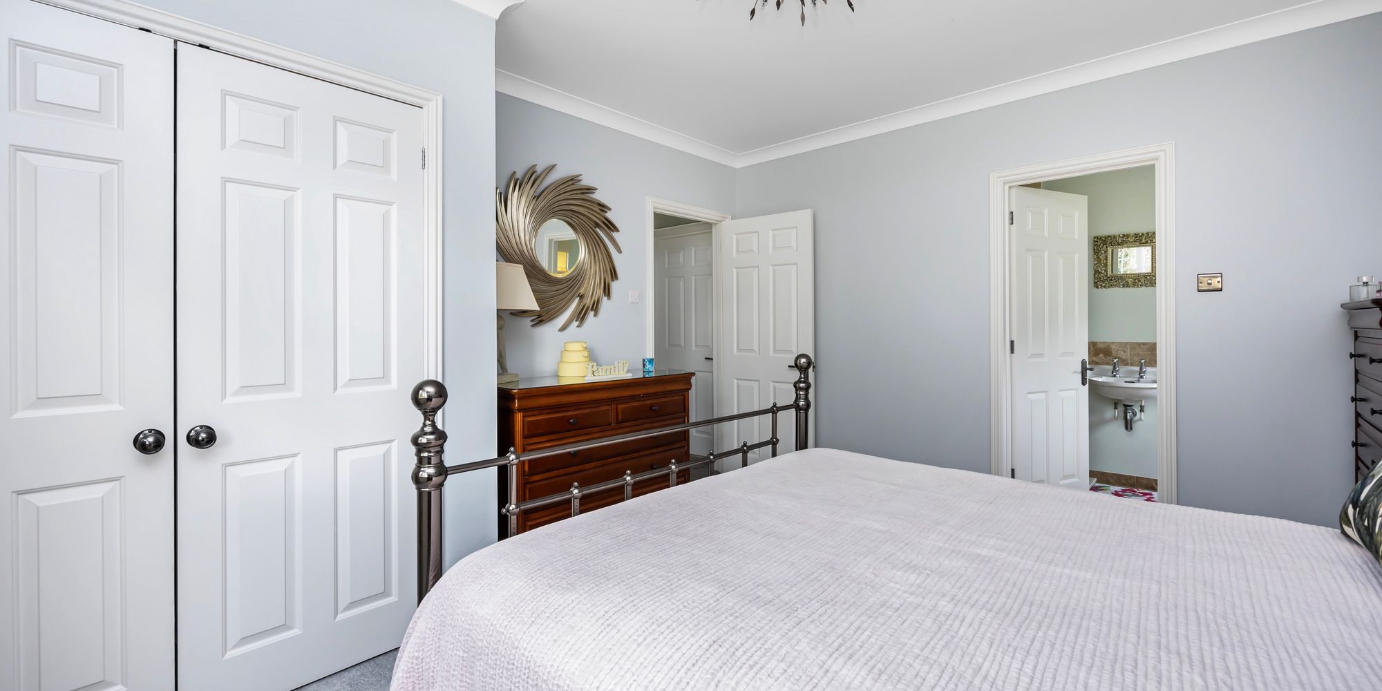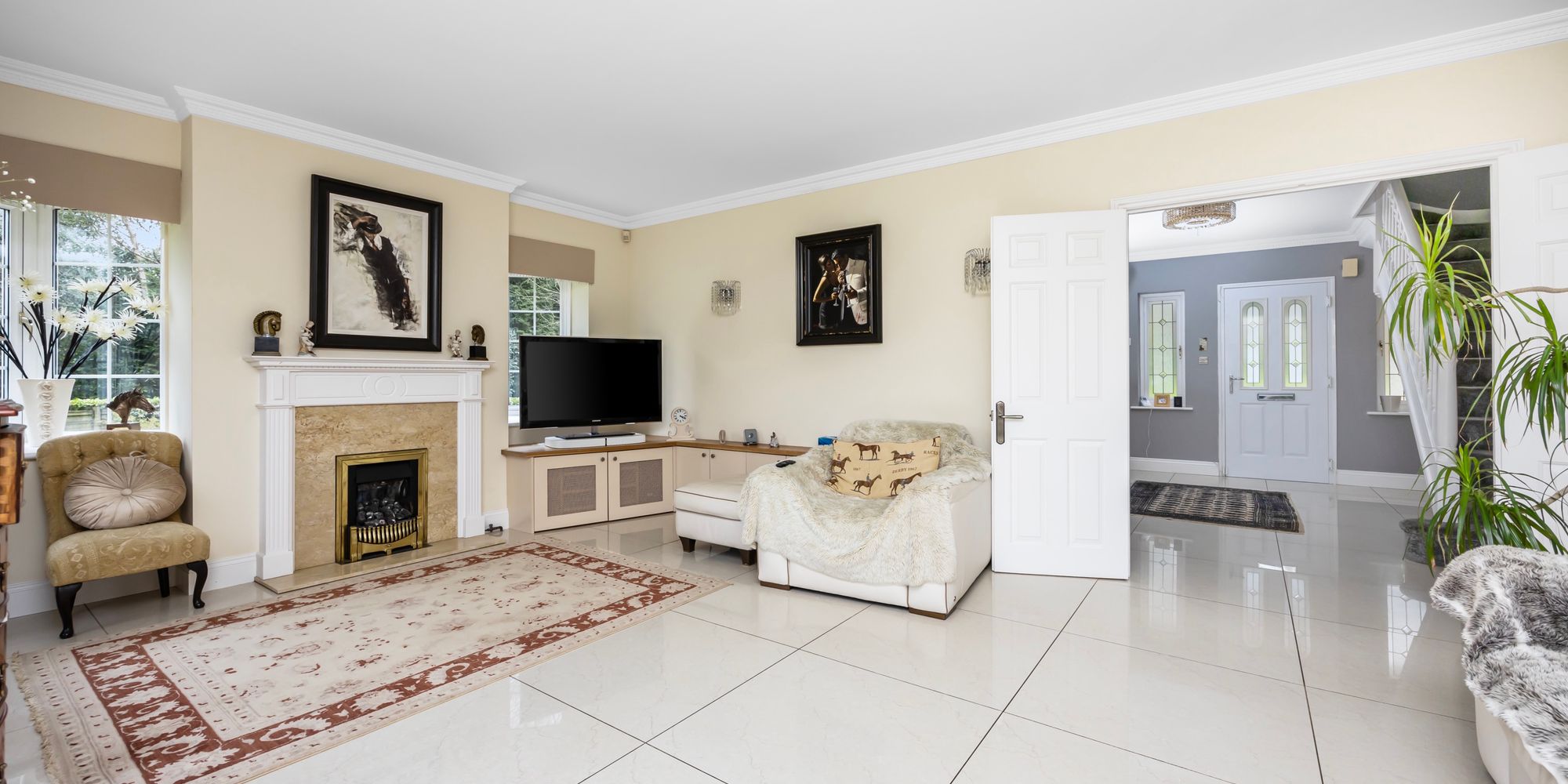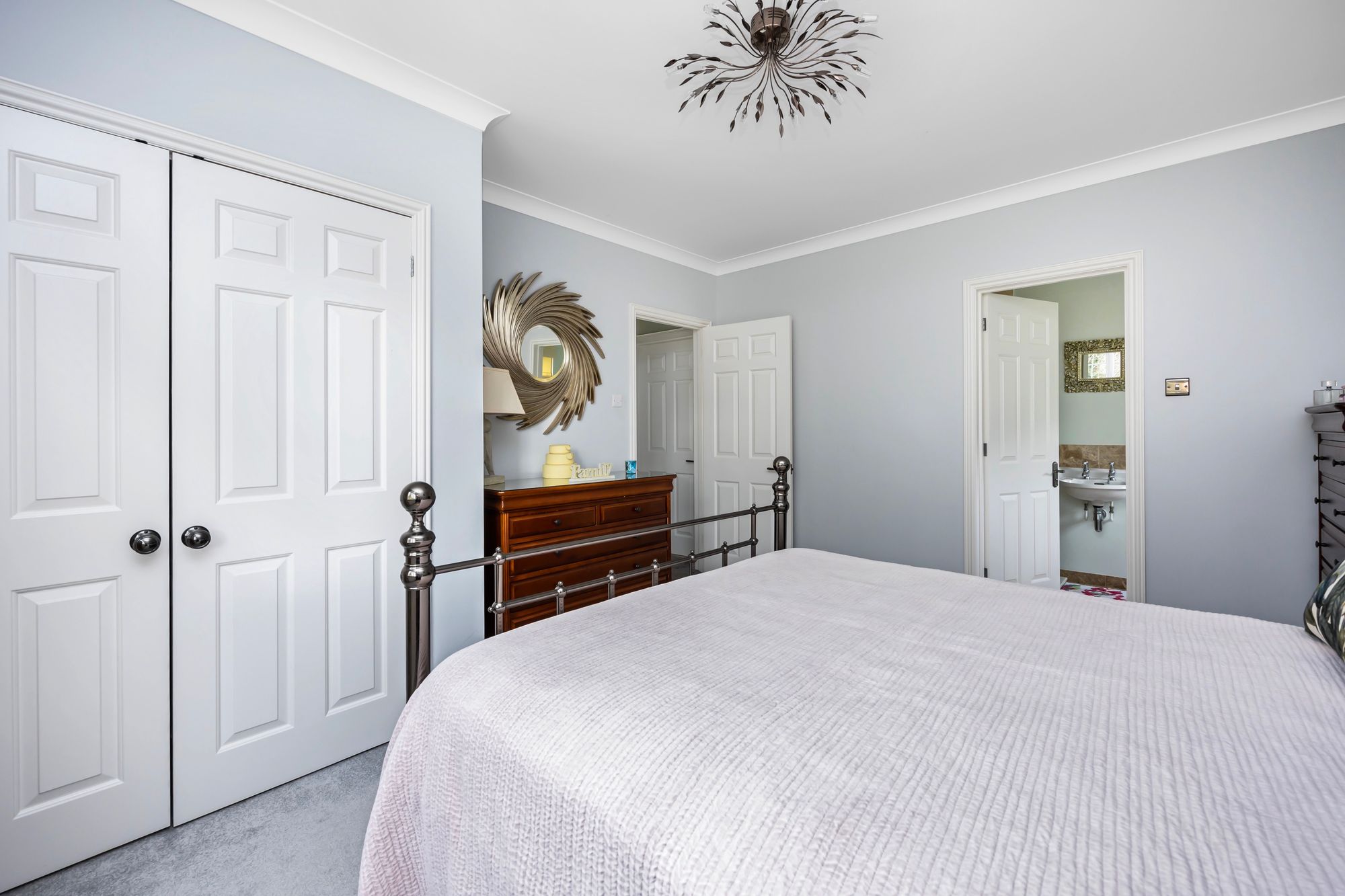 From the entrance hall a staircase rises to the first floor offering; an impressive principle bedroom suite with large en-suite, a range of fitted wardrobes and a dressing area, another en-suite bedroom with fitted wardrobes, a modern family bathroom and two further double bedrooms with built-in wardrobes.