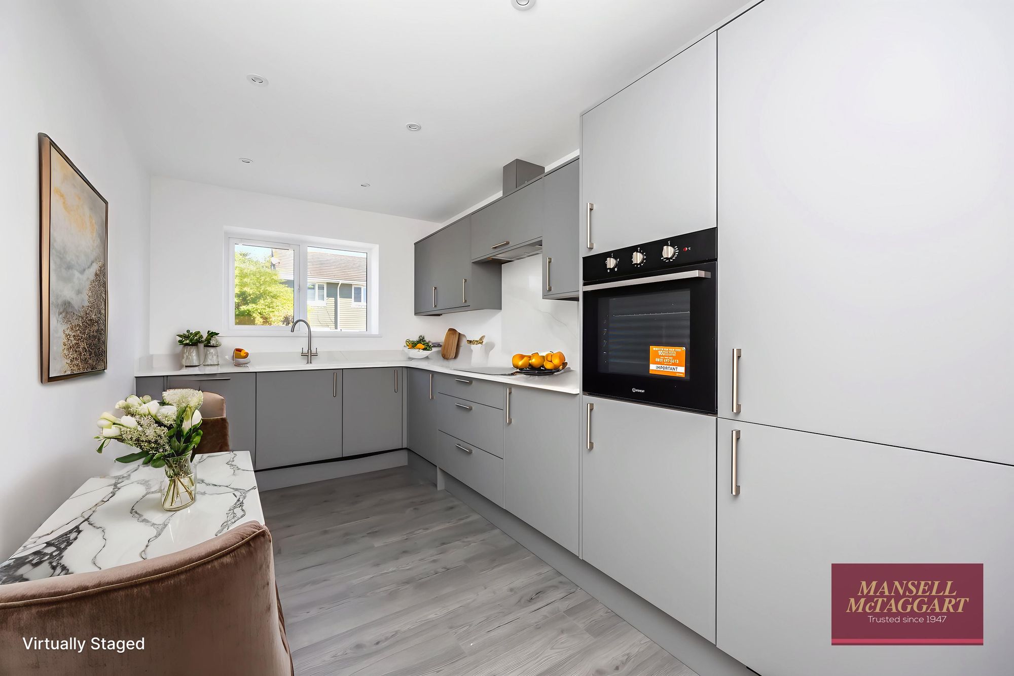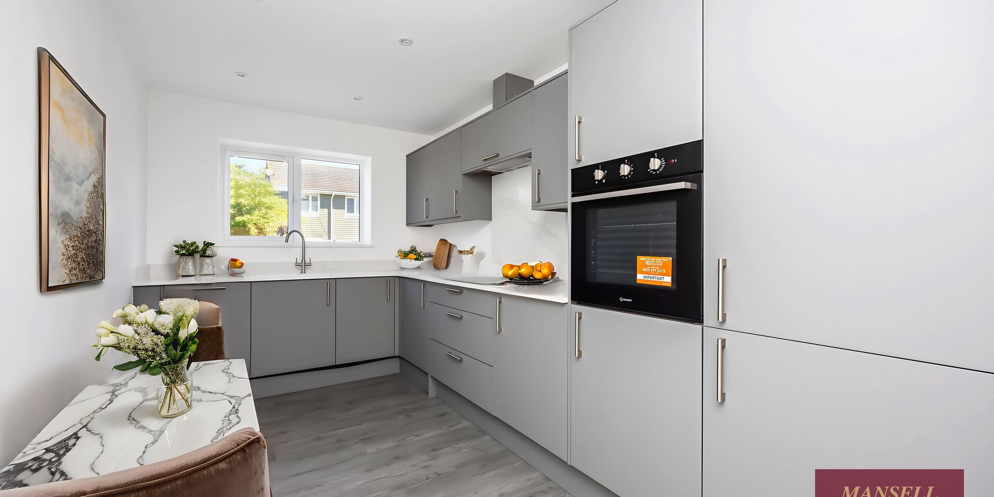 The kitchen is fully equipped with eye level oven, ceramic hob with extractor over, integrated washing machine, dishwasher and fridge/freezer.