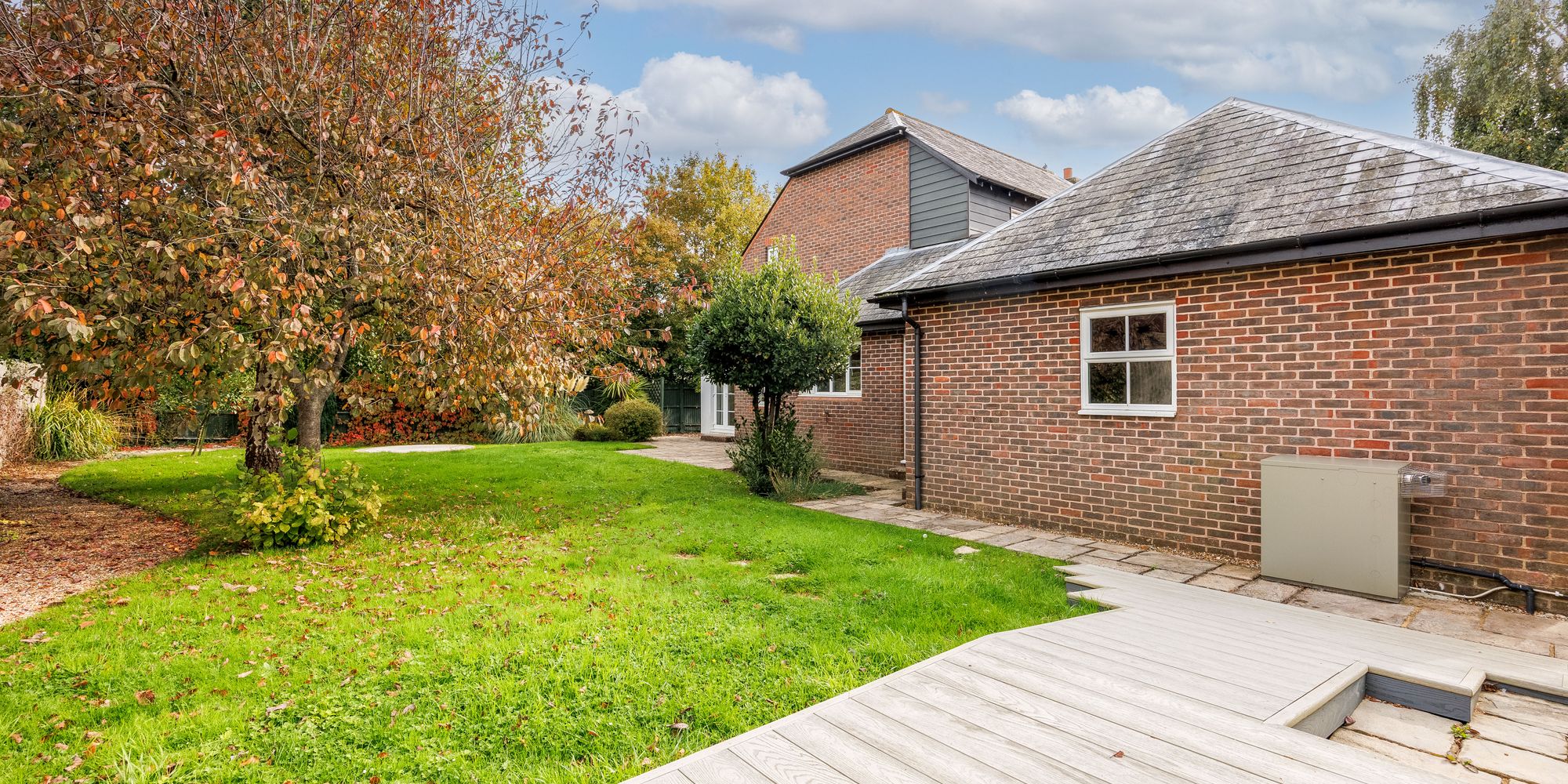 Outside there is a driveway and a DOUBLE GARAGE with twin doors. The gardens wrap around the property with paved terrace, lawn, decking and superb HOME OFFICE.