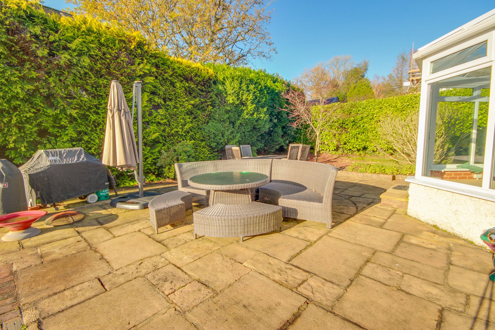 The entire plot extends to 0.4 acres and surrounds the property on all sides and faces south to the rear with various areas of lawn, stocked beds and borders and all enclosed by high mature hedging.