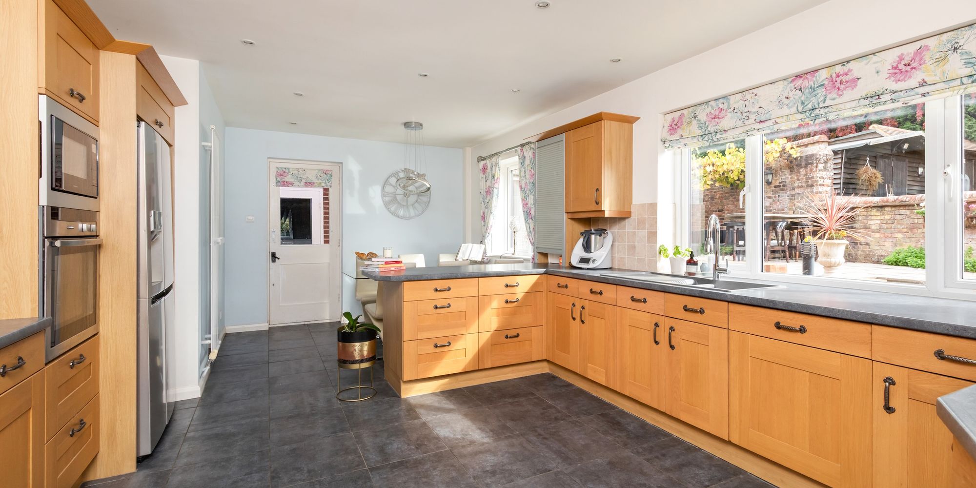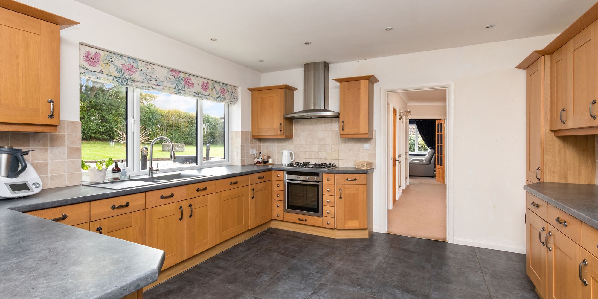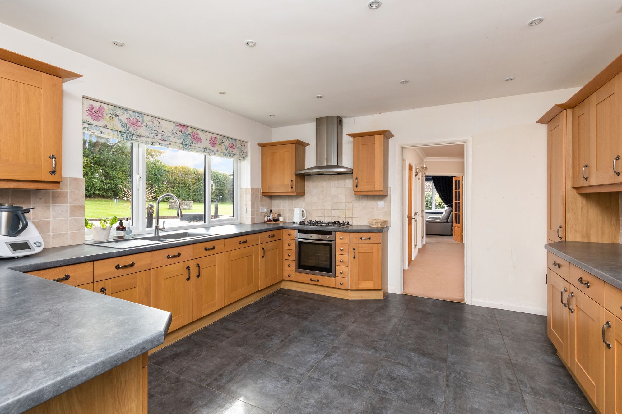 The kitchen/breakfast room is fitted with an attractive range of units with some integrated appliances and door to side.