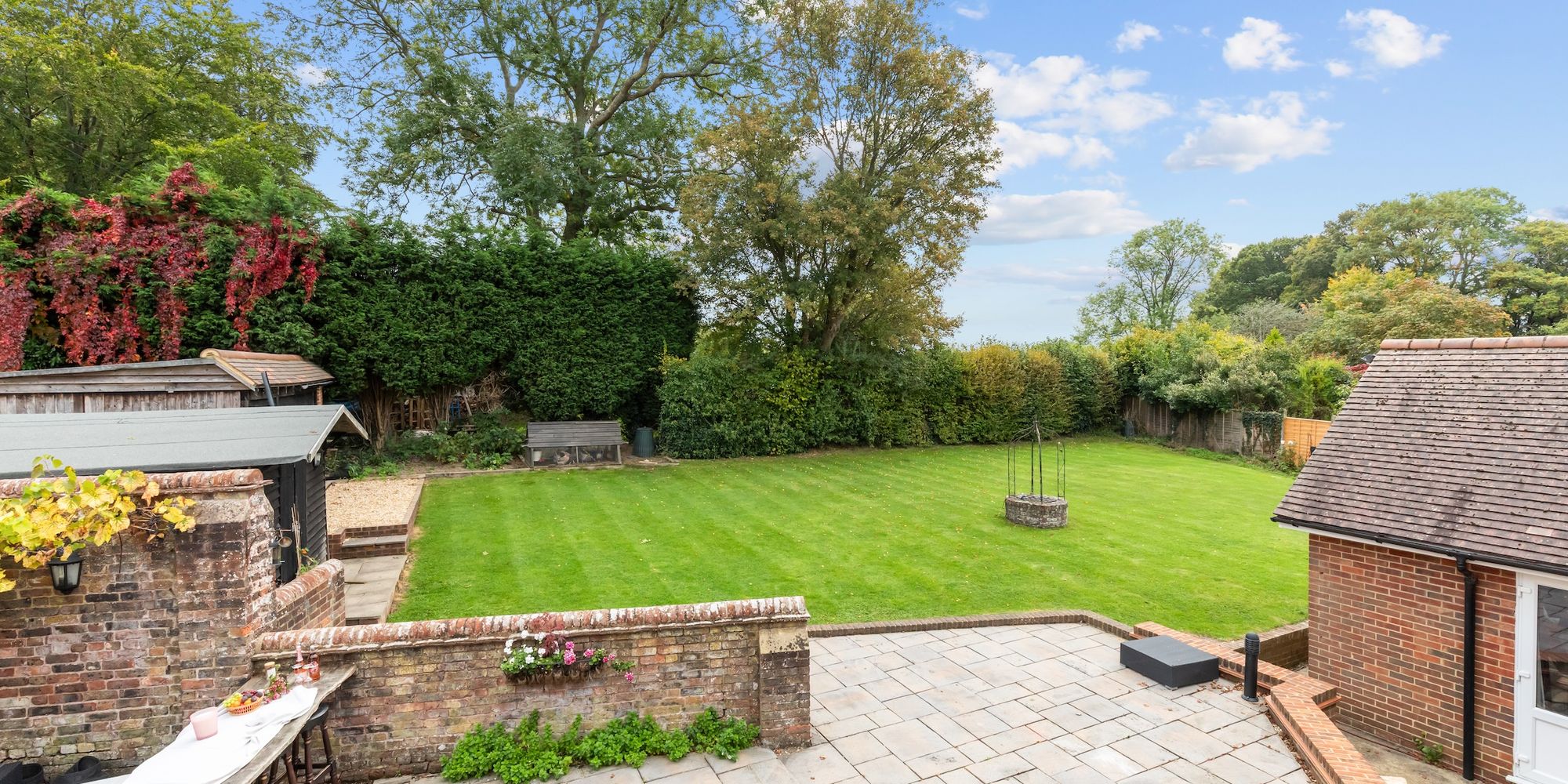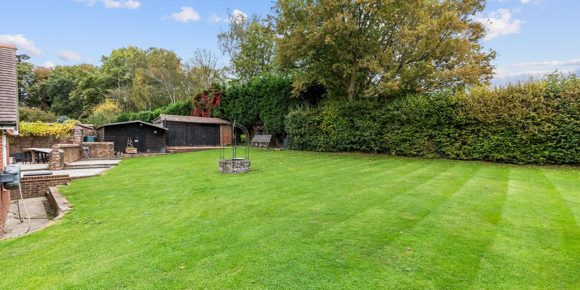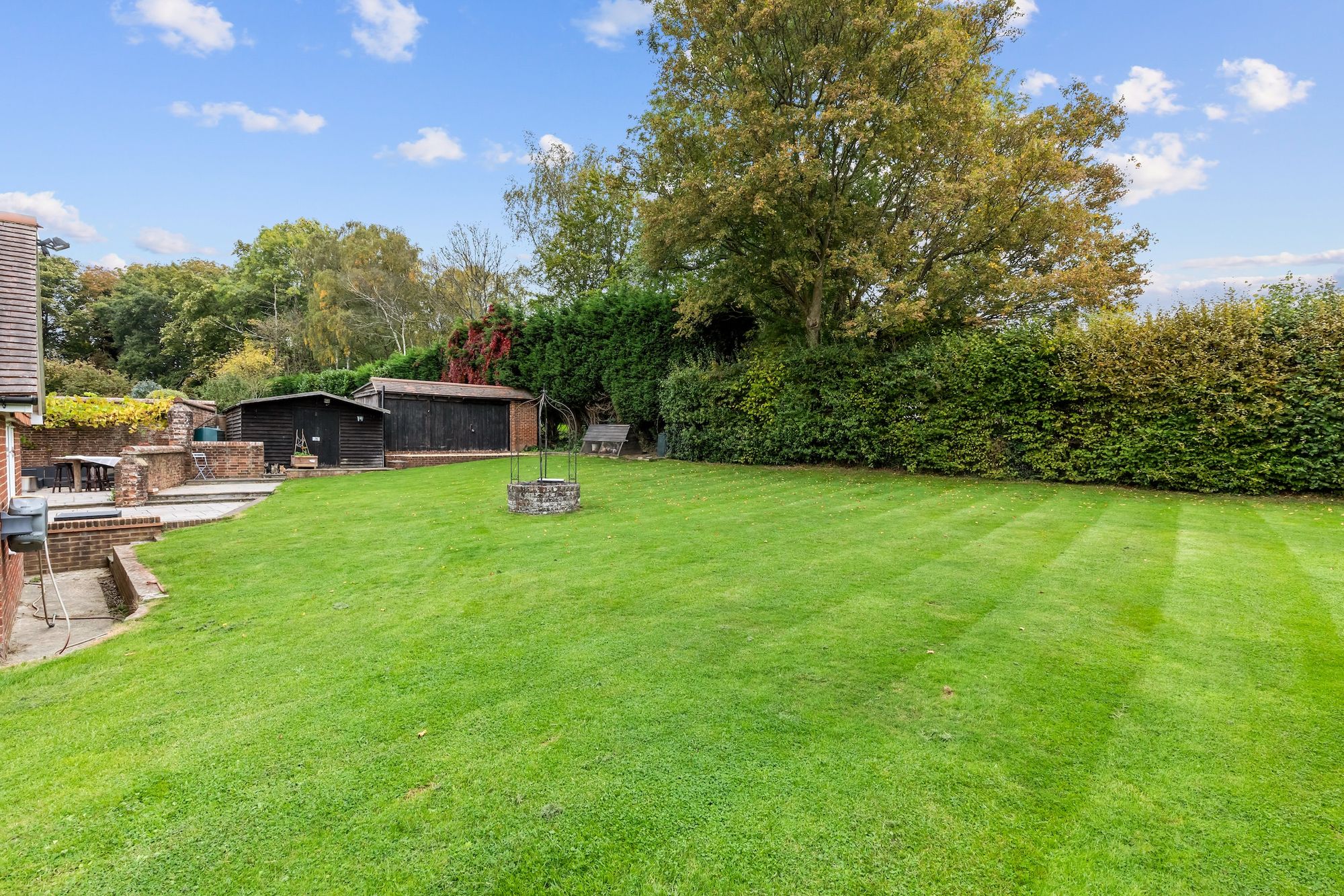 The part walled 0.39 acre south east facing garden offers an excellent degree of privacy and is ideal for entertaining. The 107’ wide by 74’ rear garden is predominantly lawned with well established borders, substantial paved patio and 2 outbuildings.