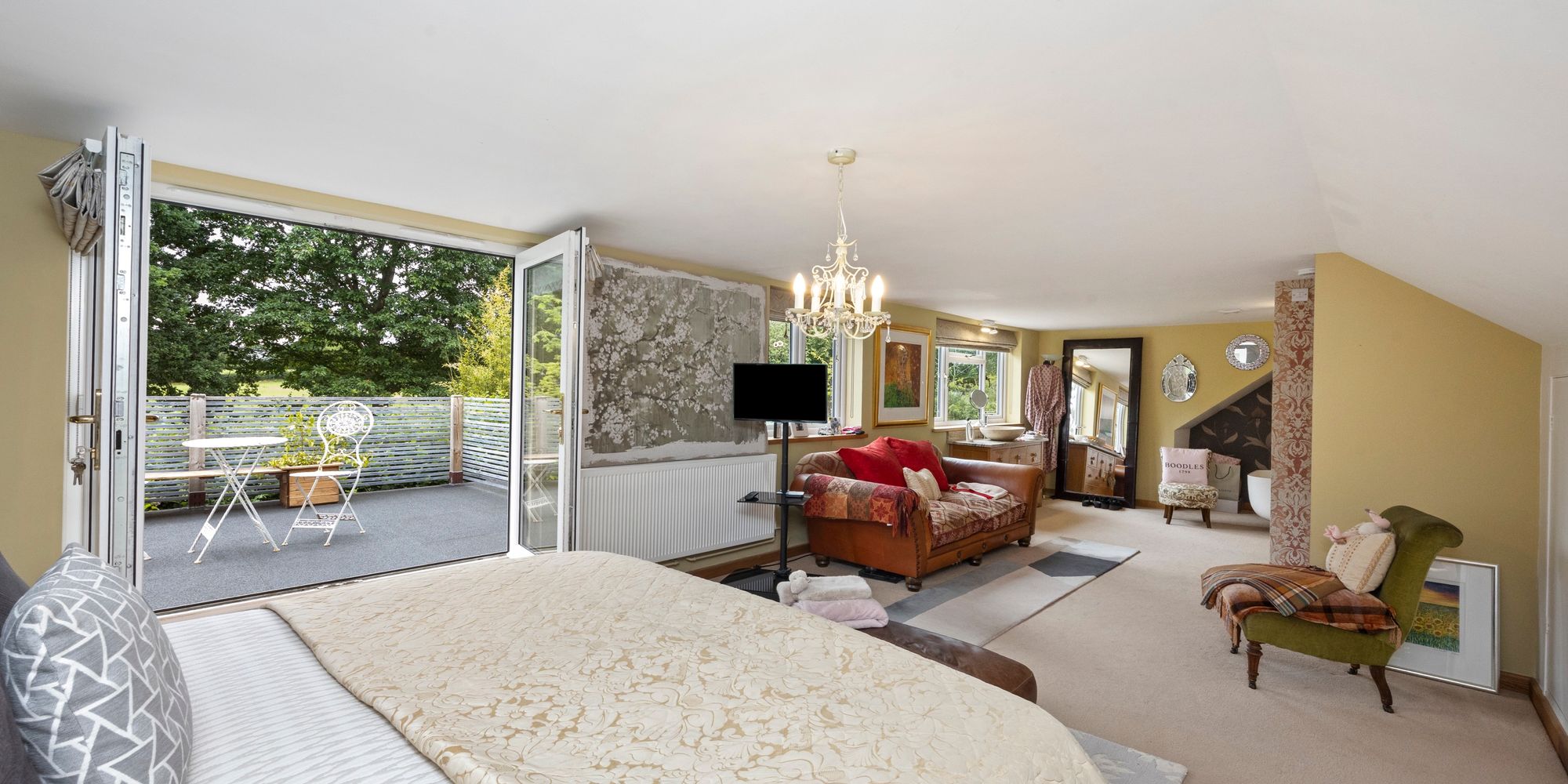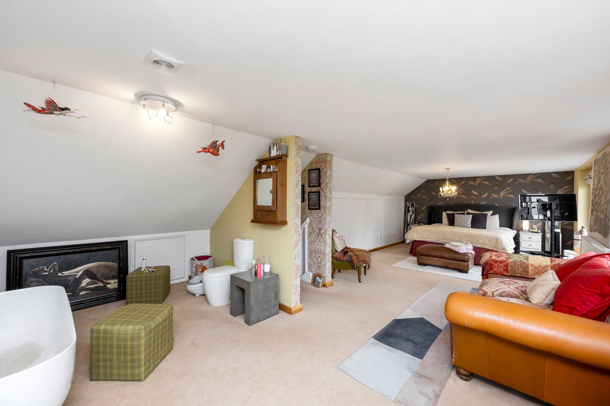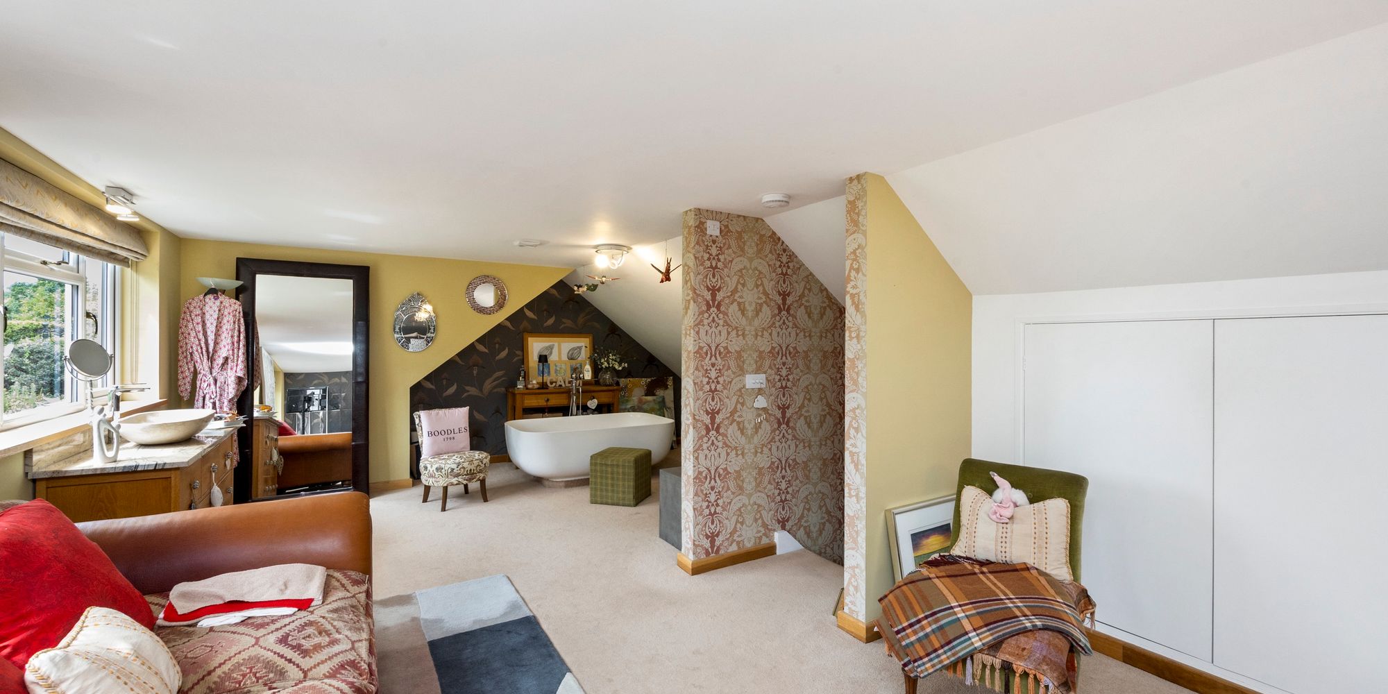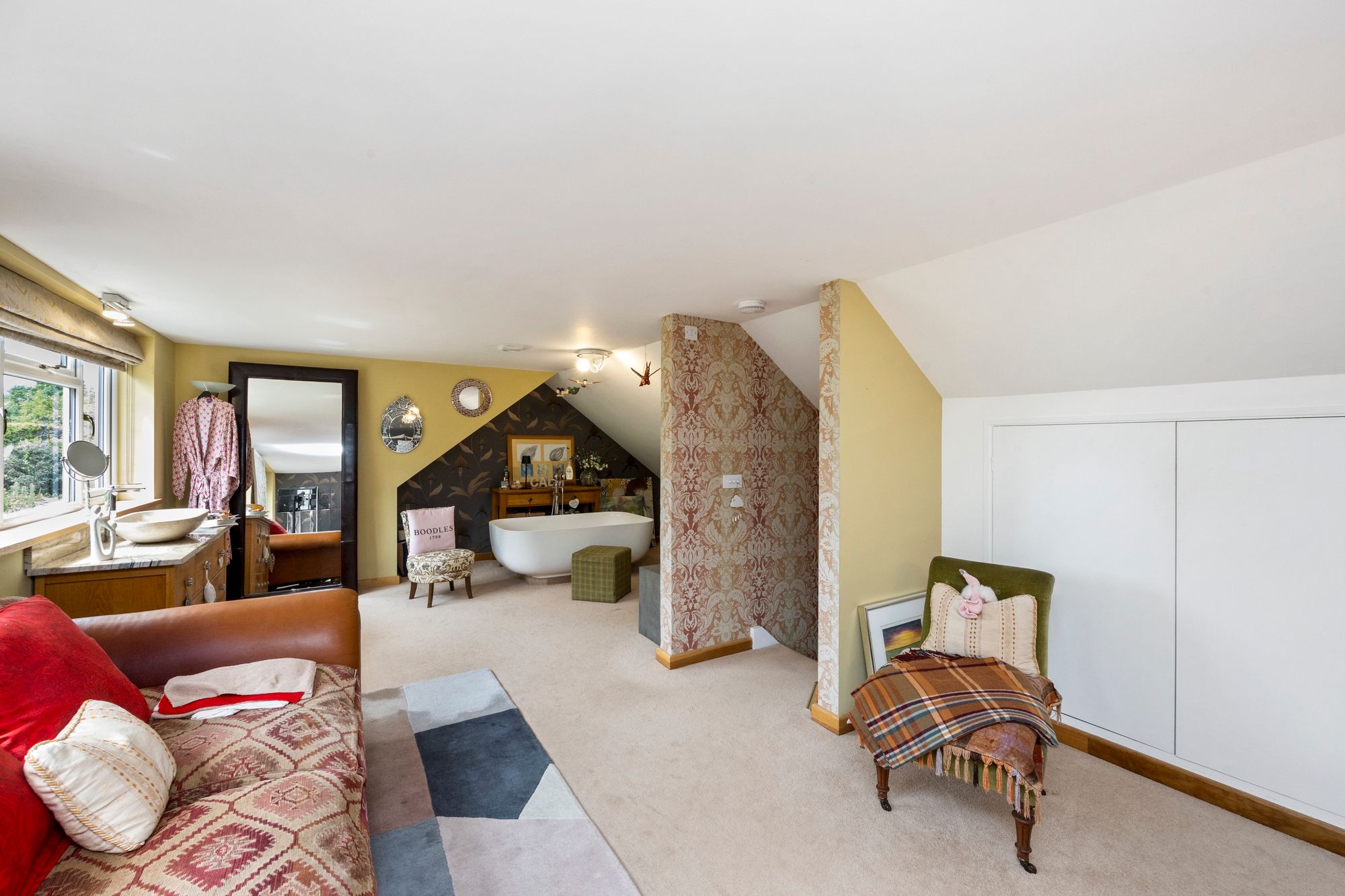 Upstairs, the main bedroom feels like a boutique hotel suite, with an open-plan bath and sink area, soft-close fitted wardrobes, additional eaves storage, and a large private balcony that offers tranquil views over the gardens—an ideal spot for morning coffee or quiet evenings.