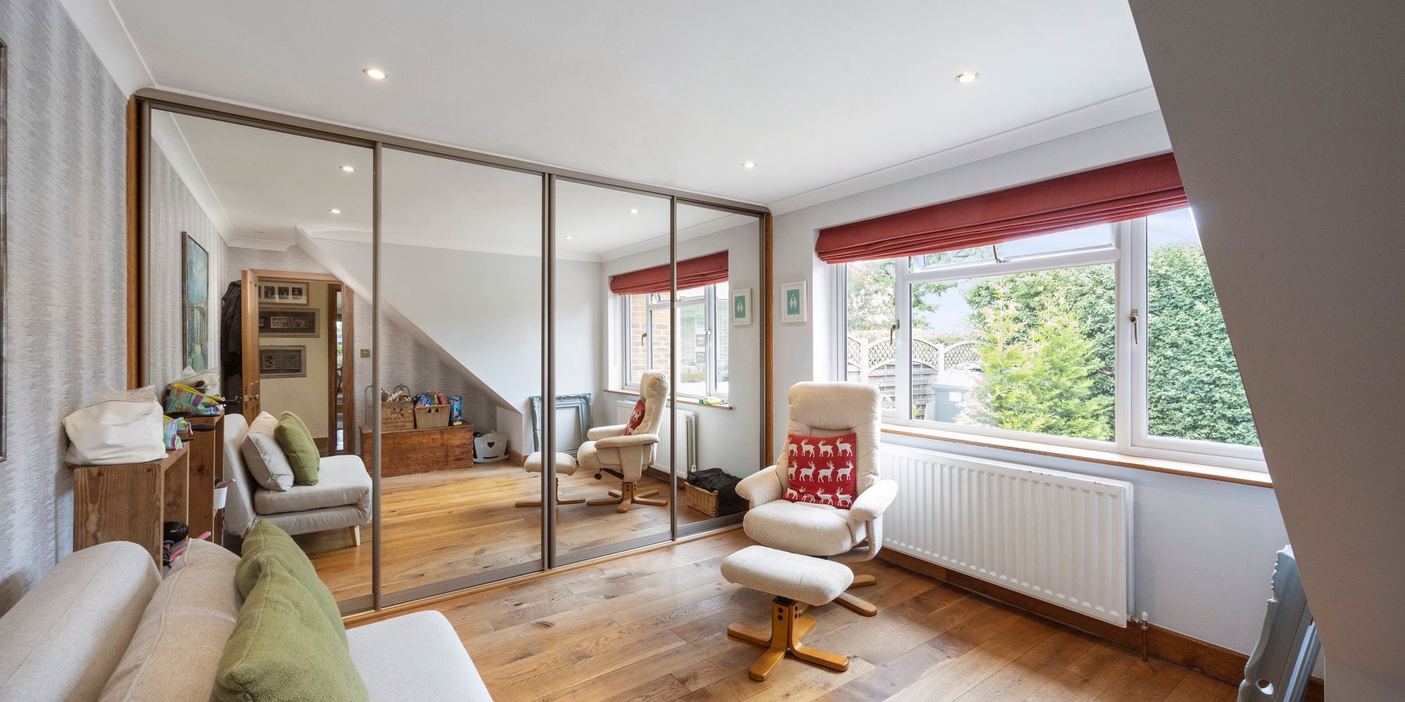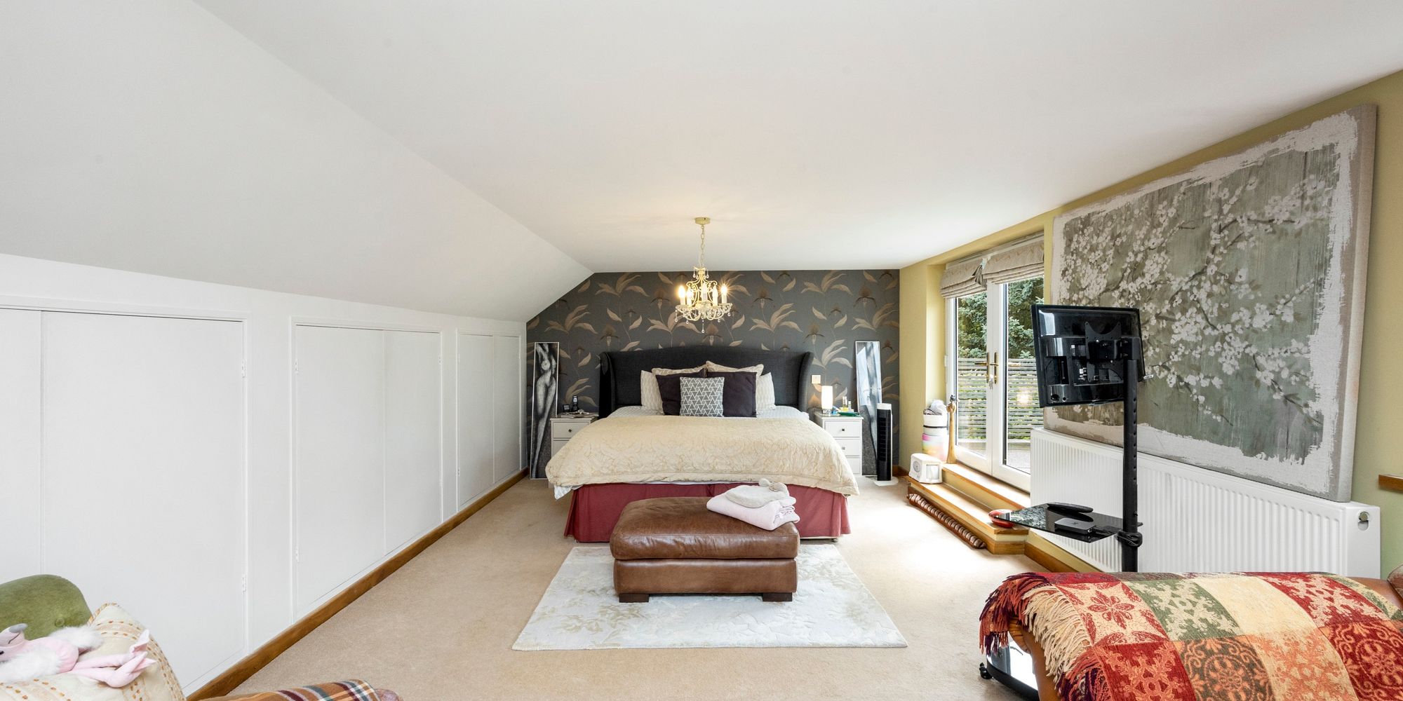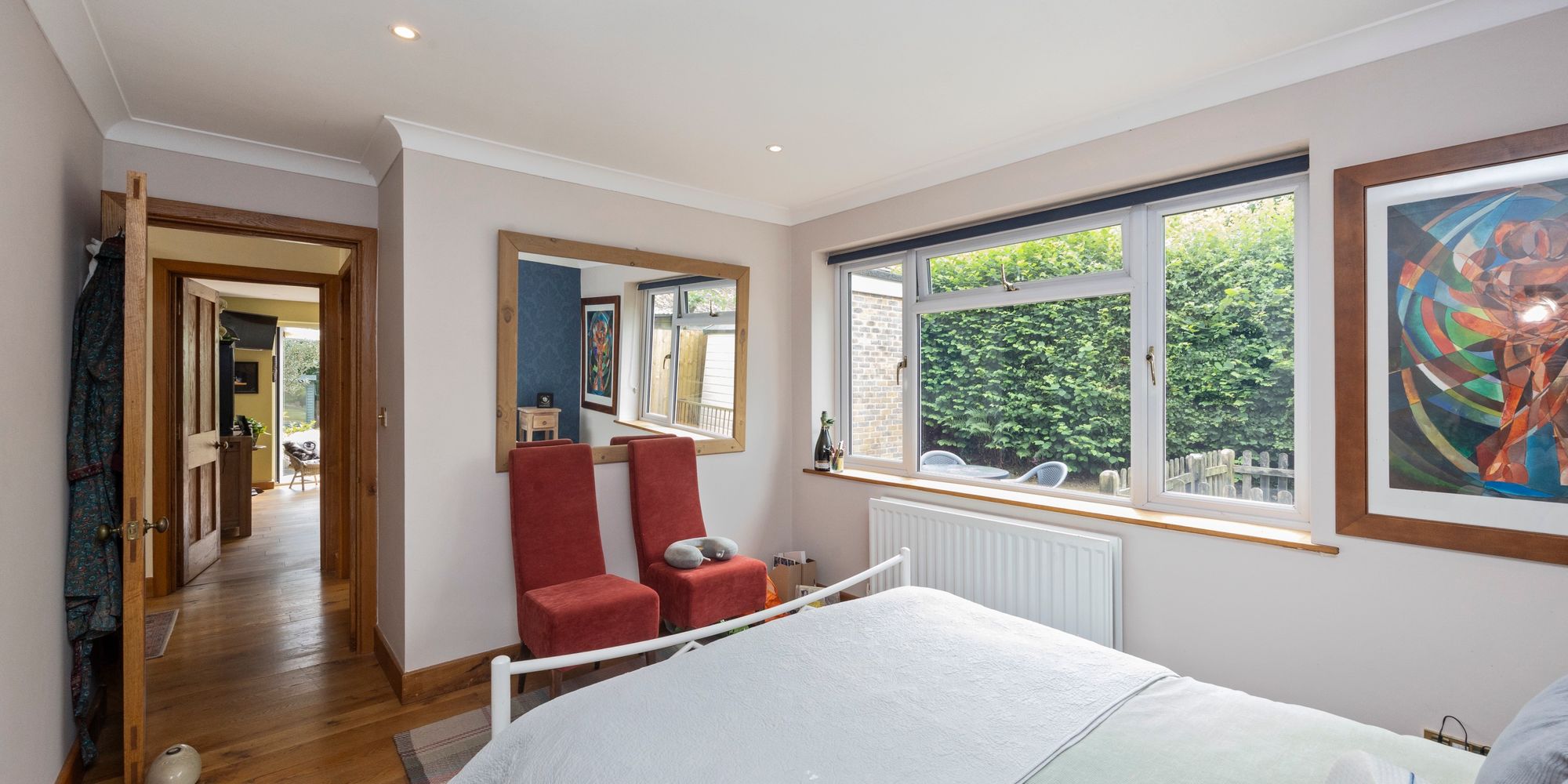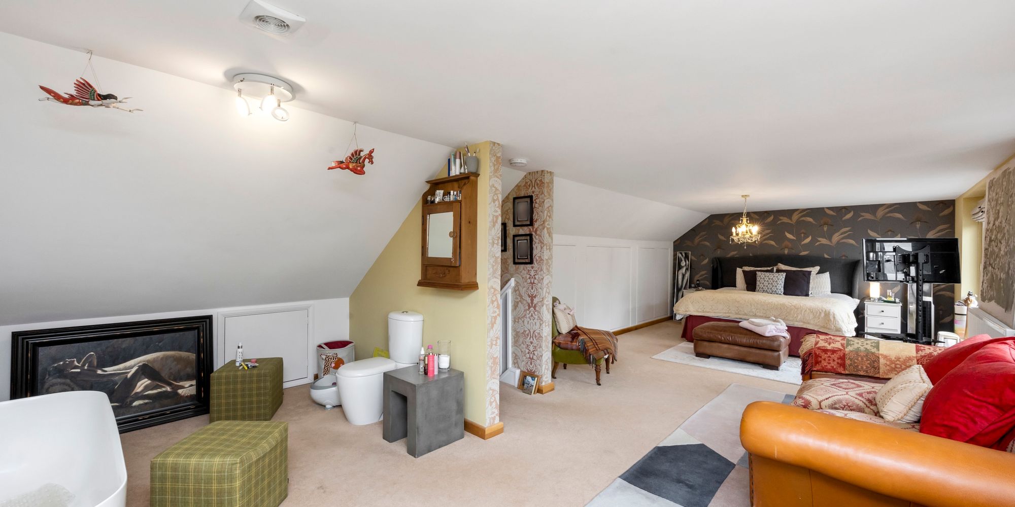 Upstairs, the main bedroom feels like a boutique hotel suite, with an open-plan bath and sink area, soft-close fitted wardrobes, additional eaves storage, and a large private balcony that offers tranquil views over the gardens—an ideal spot for morning coffee or quiet evenings.