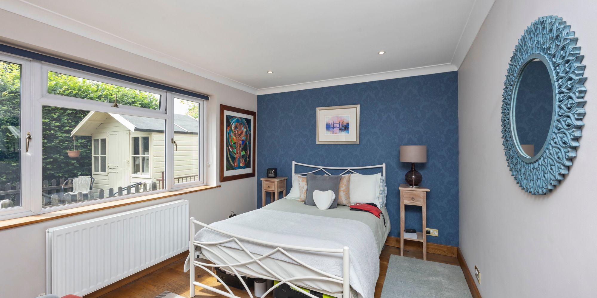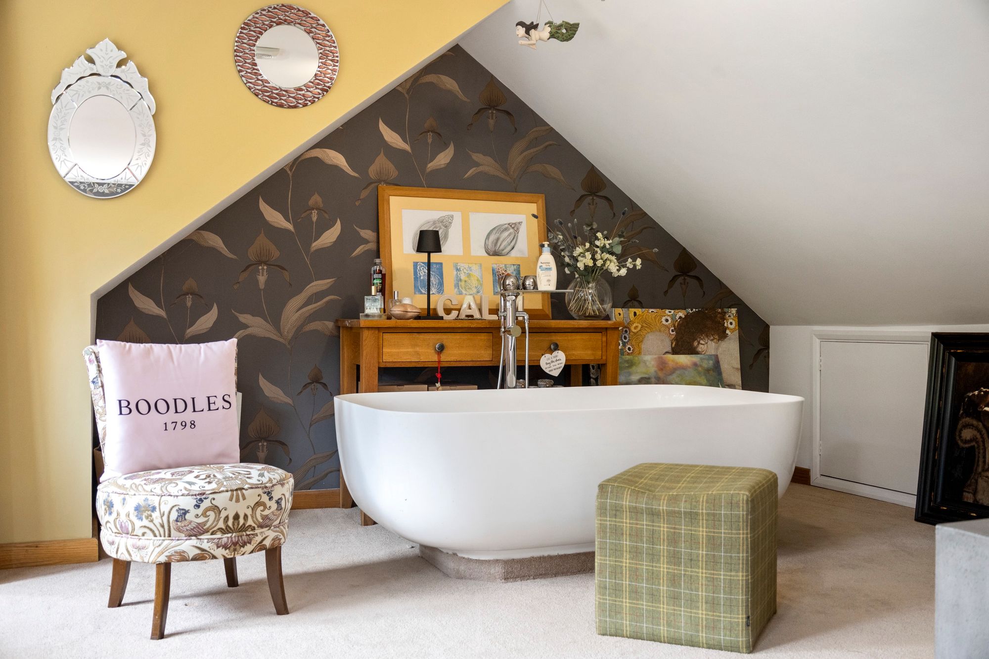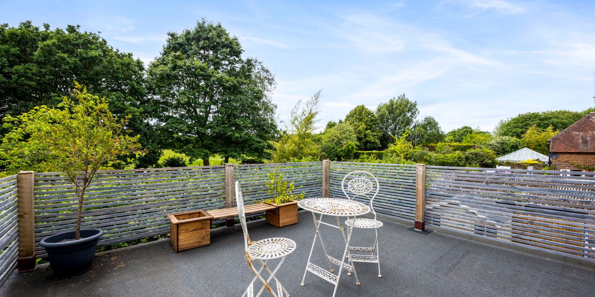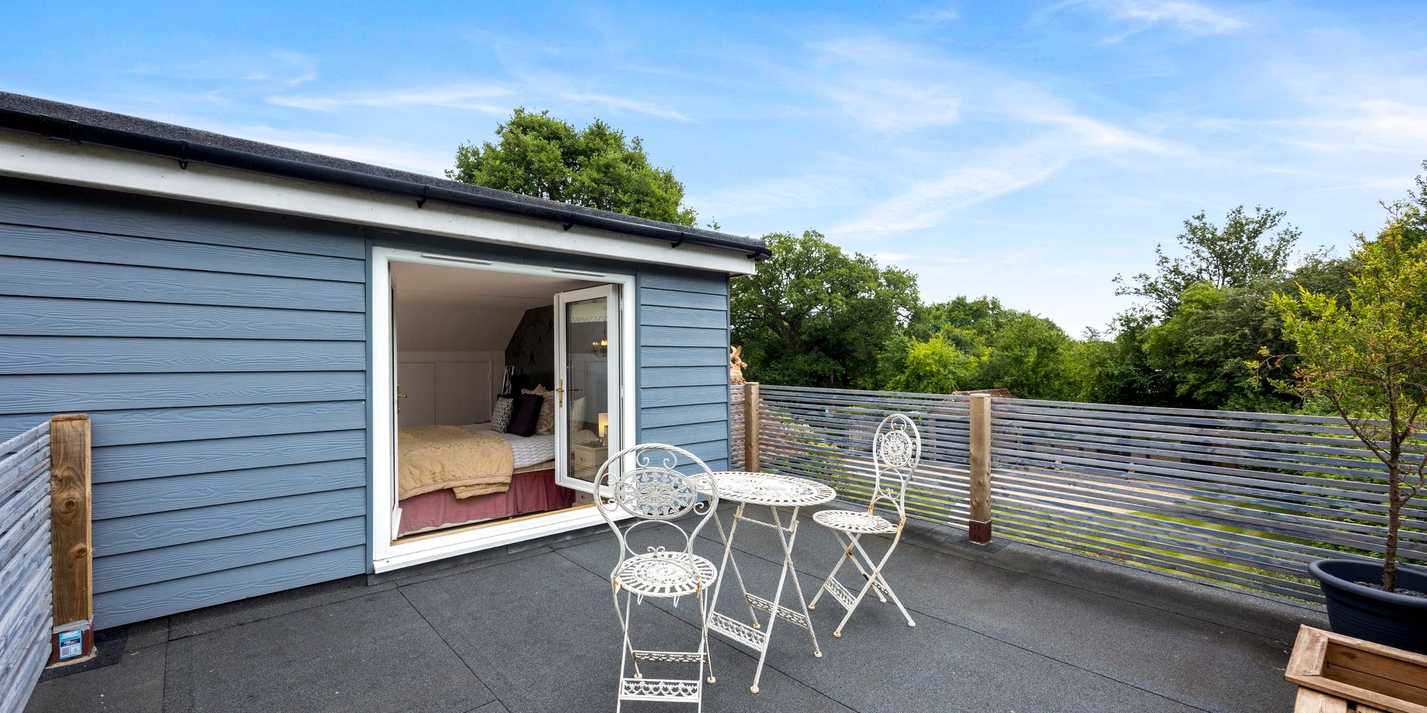 Upstairs, the main bedroom feels like a boutique hotel suite, with an open-plan bath and sink area, soft-close fitted wardrobes, additional eaves storage, and a large private balcony that offers tranquil views over the gardens—an ideal spot for morning coffee or quiet evenings.