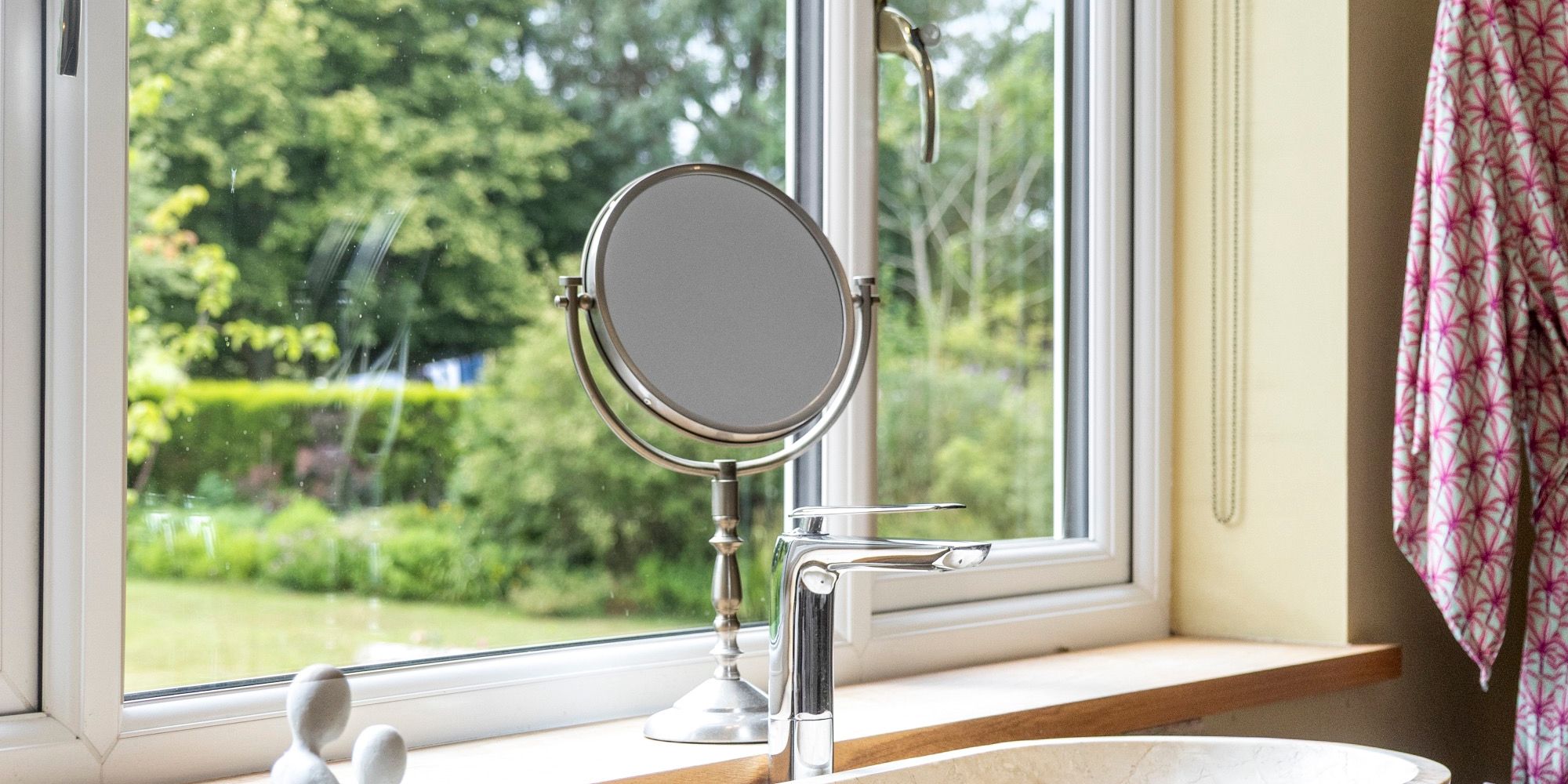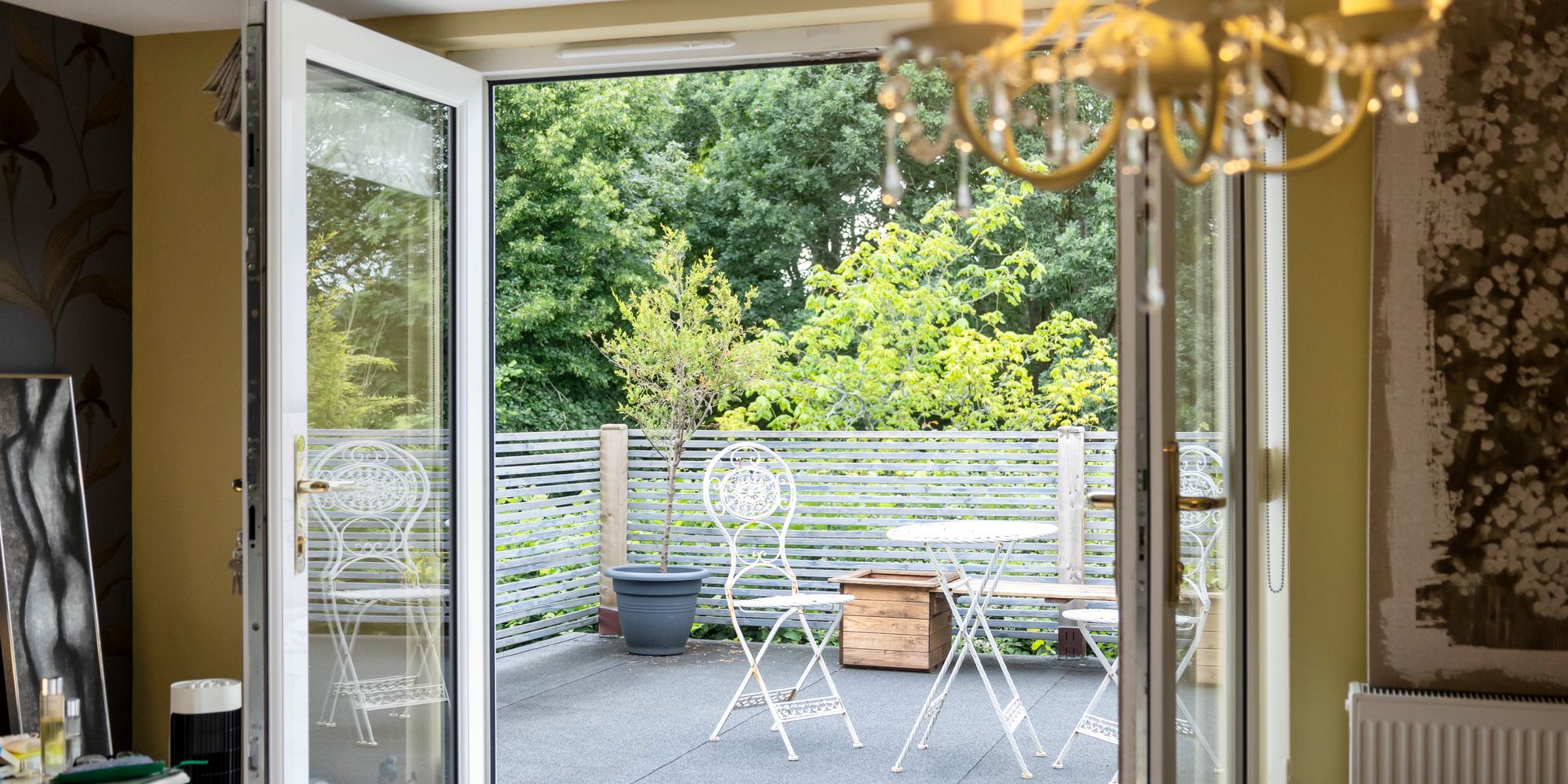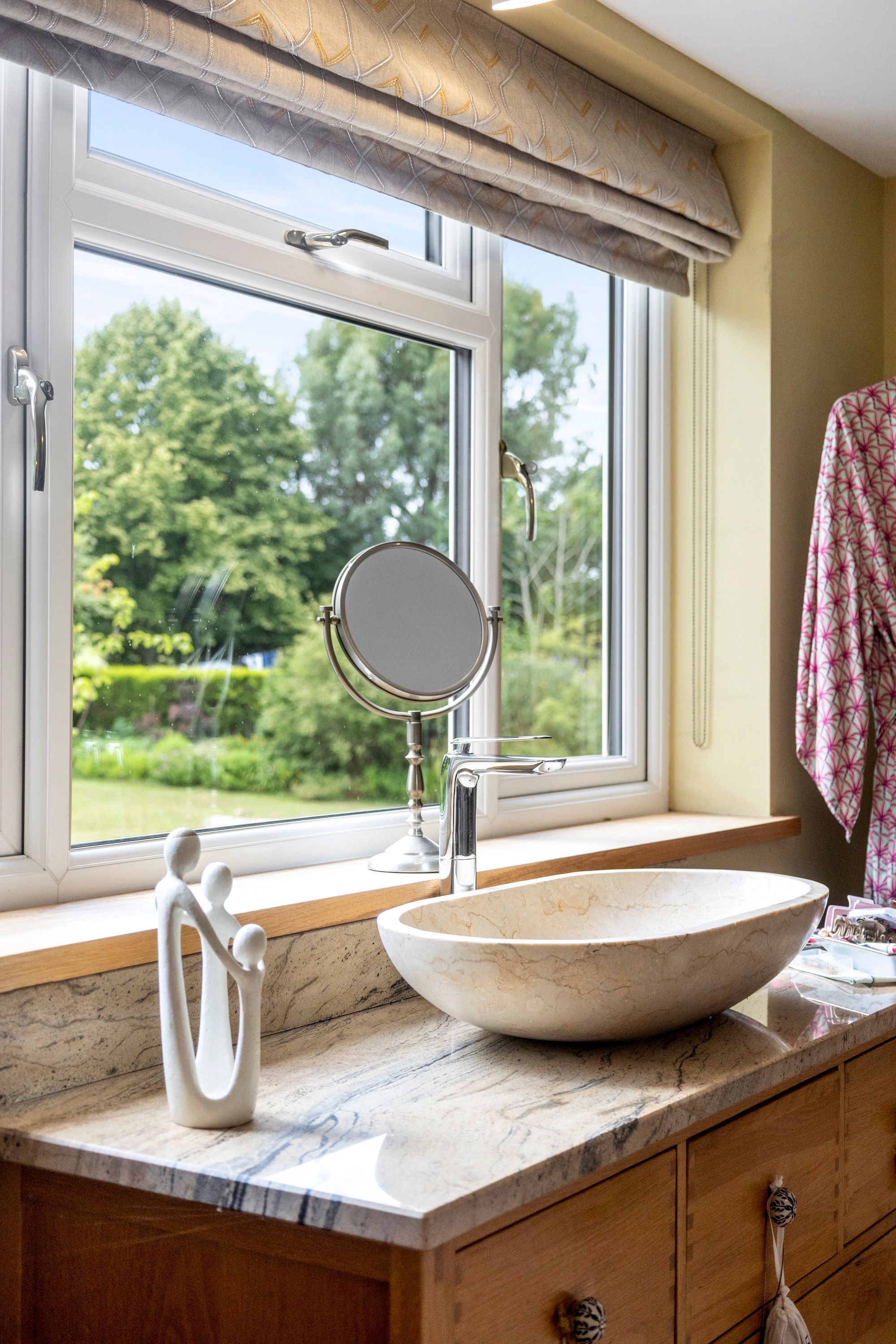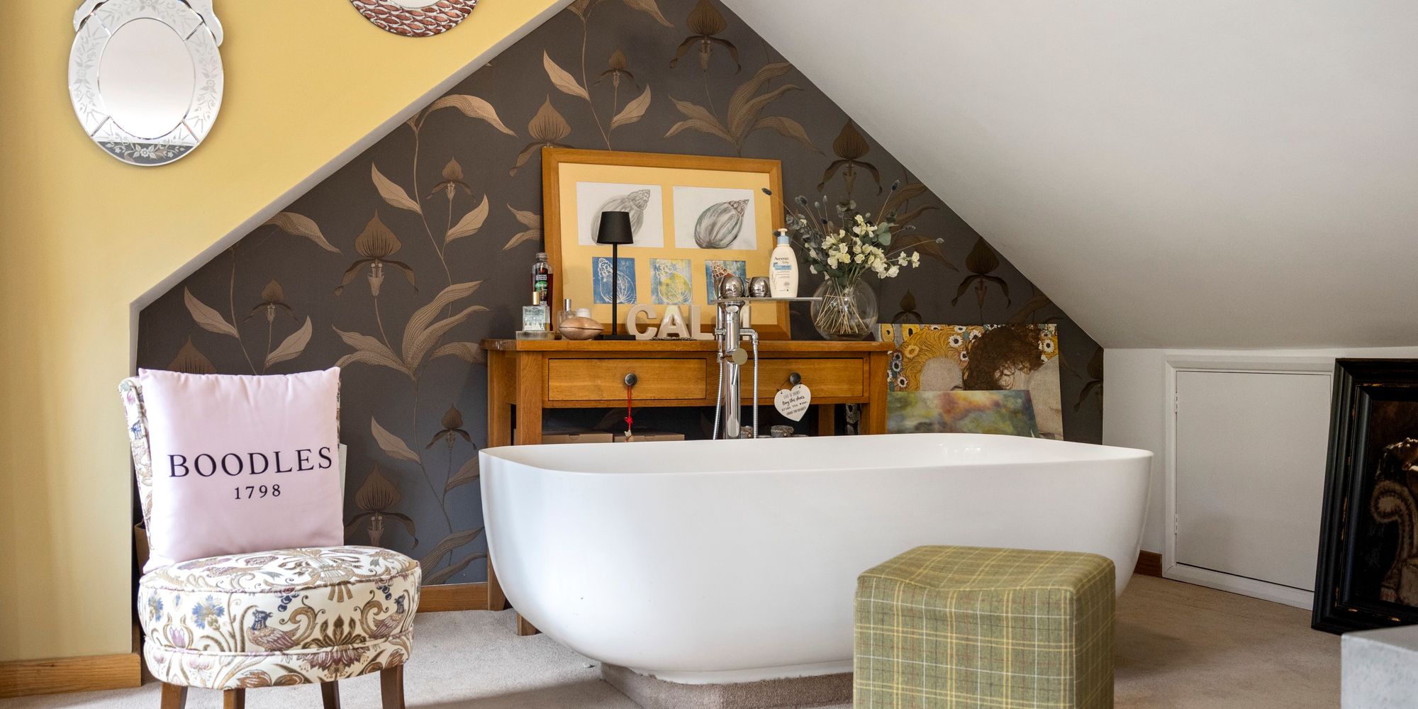 Upstairs, the main bedroom feels like a boutique hotel suite, with an open-plan bath and sink area, soft-close fitted wardrobes, additional eaves storage, and a large private balcony that offers tranquil views over the gardens—an ideal spot for morning coffee or quiet evenings.