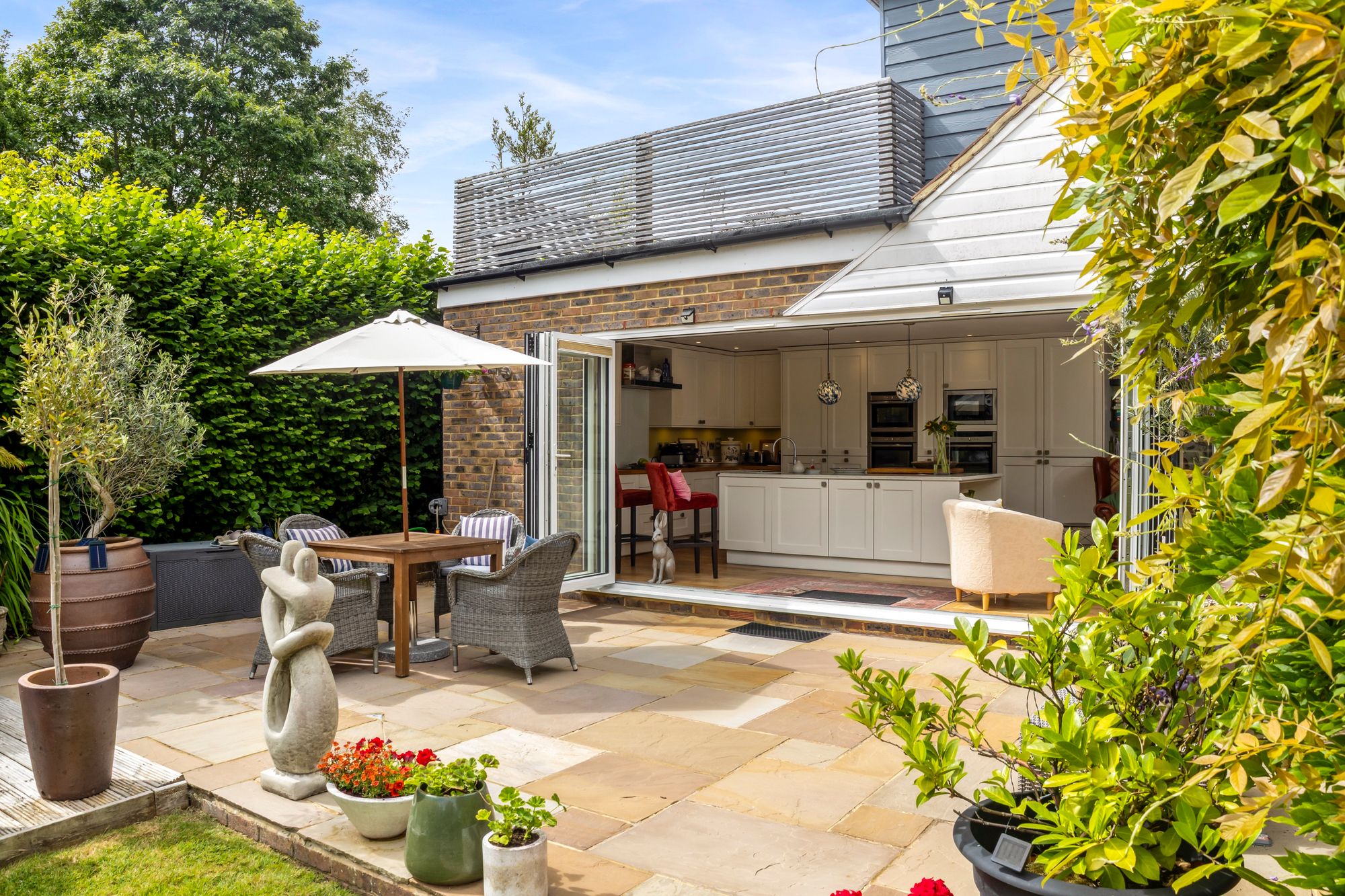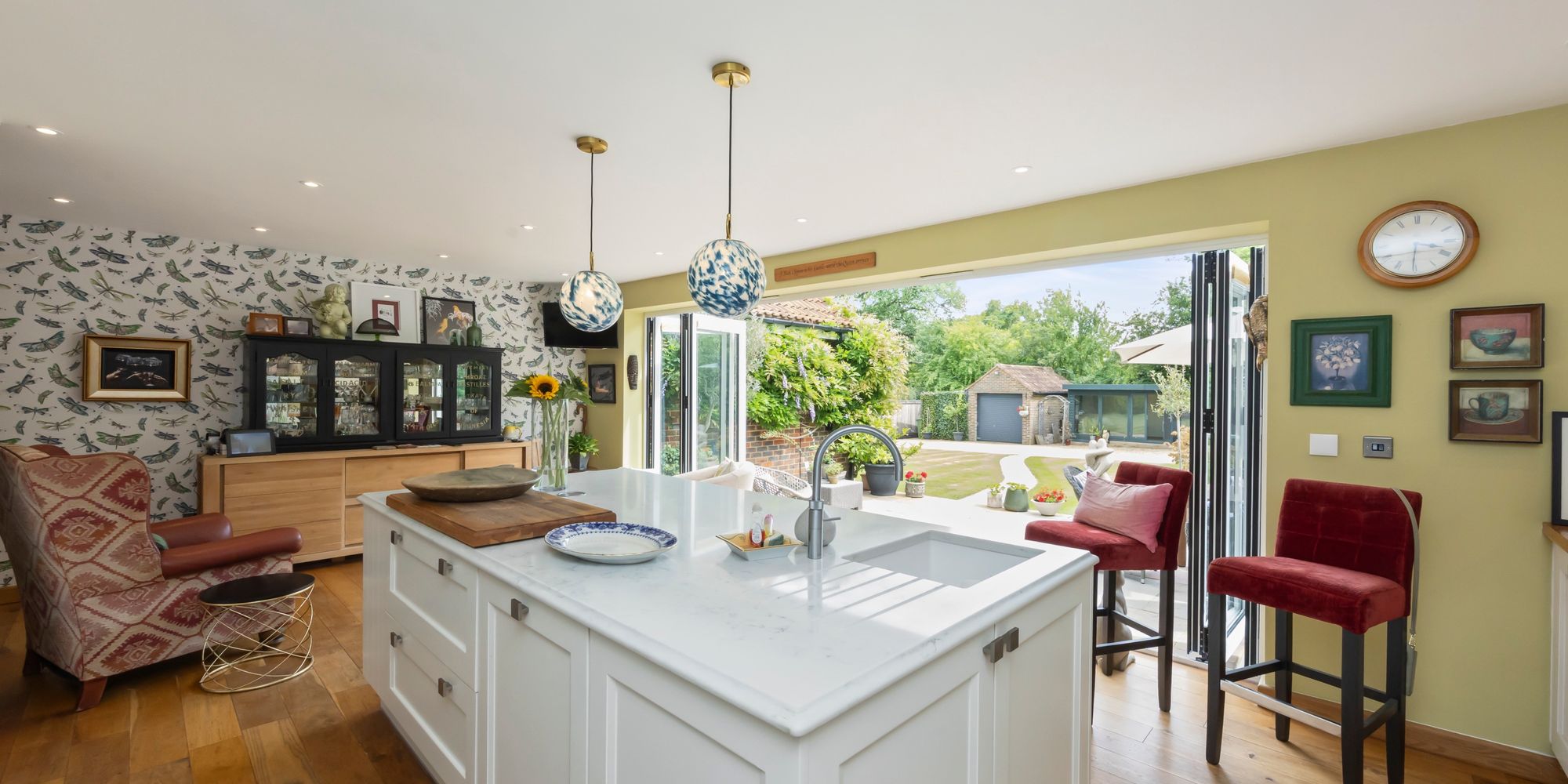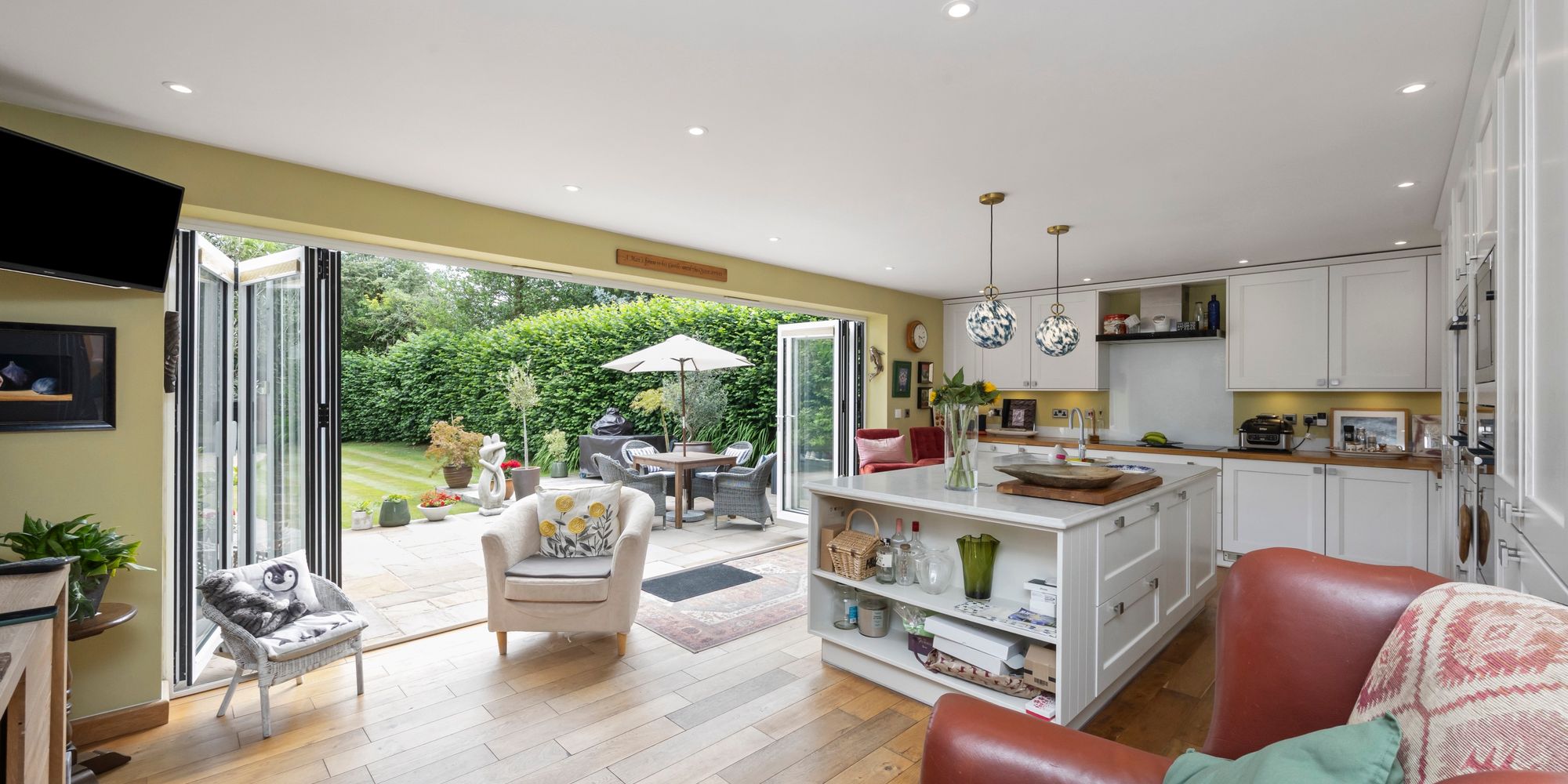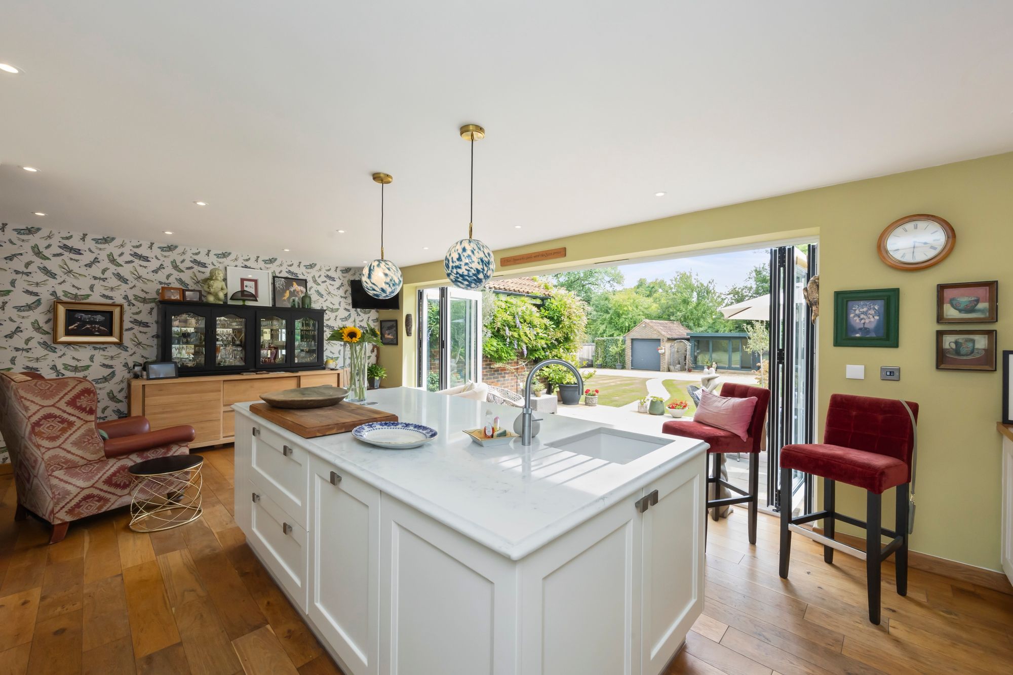 The heart of the home is a striking, contemporary kitchen featuring a large central island with extensive storage, integrated Bosch and Neff appliances, a Quooker tap for instant boiling or cold water, and a Harvey’s water softener. Bi-fold doors flood the space with natural light and open directly onto the south-facing garden and patio—ideal for entertaining or relaxing. Underfloor heating ensures warmth and comfort, even on the coldest evenings.