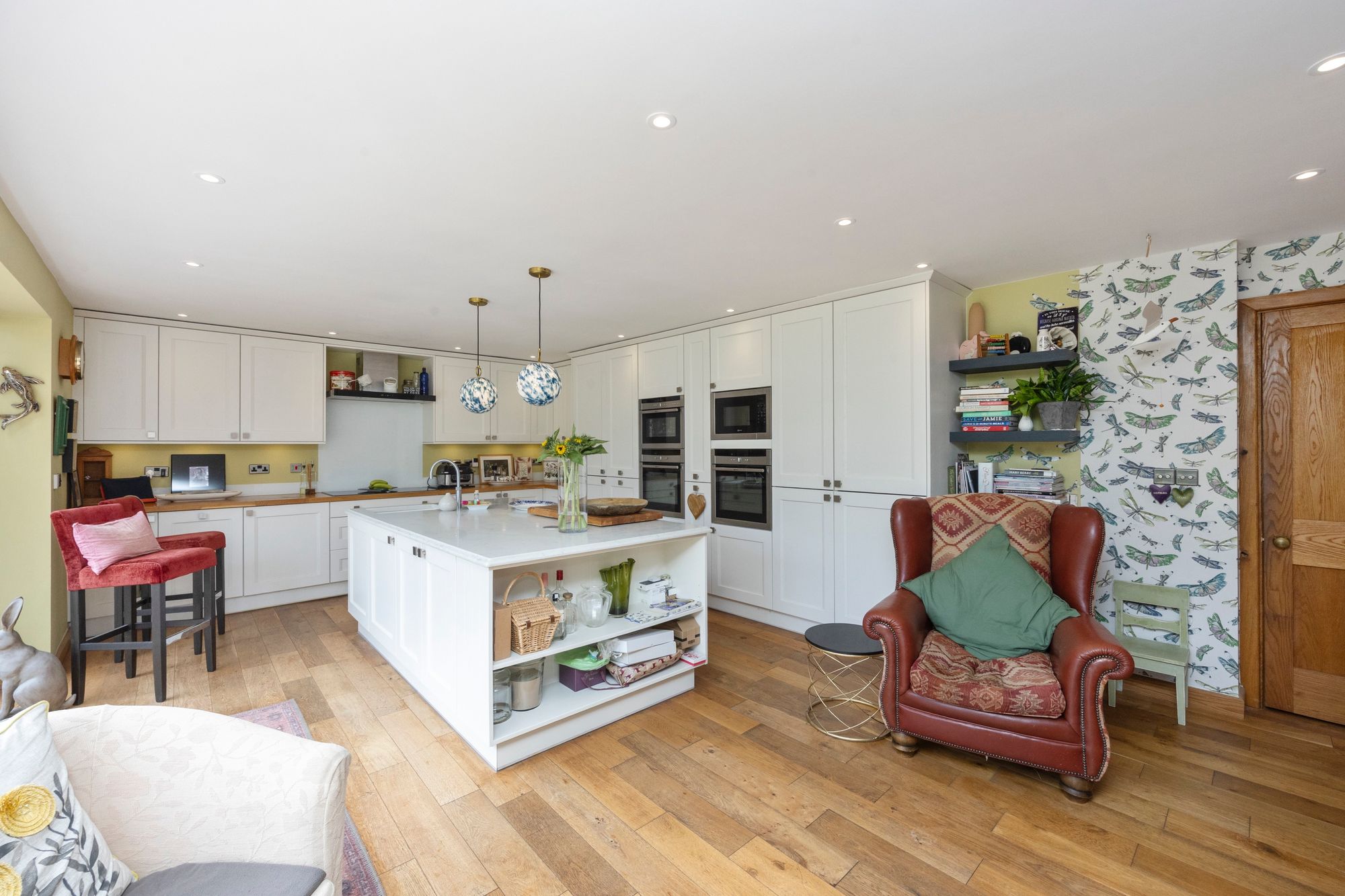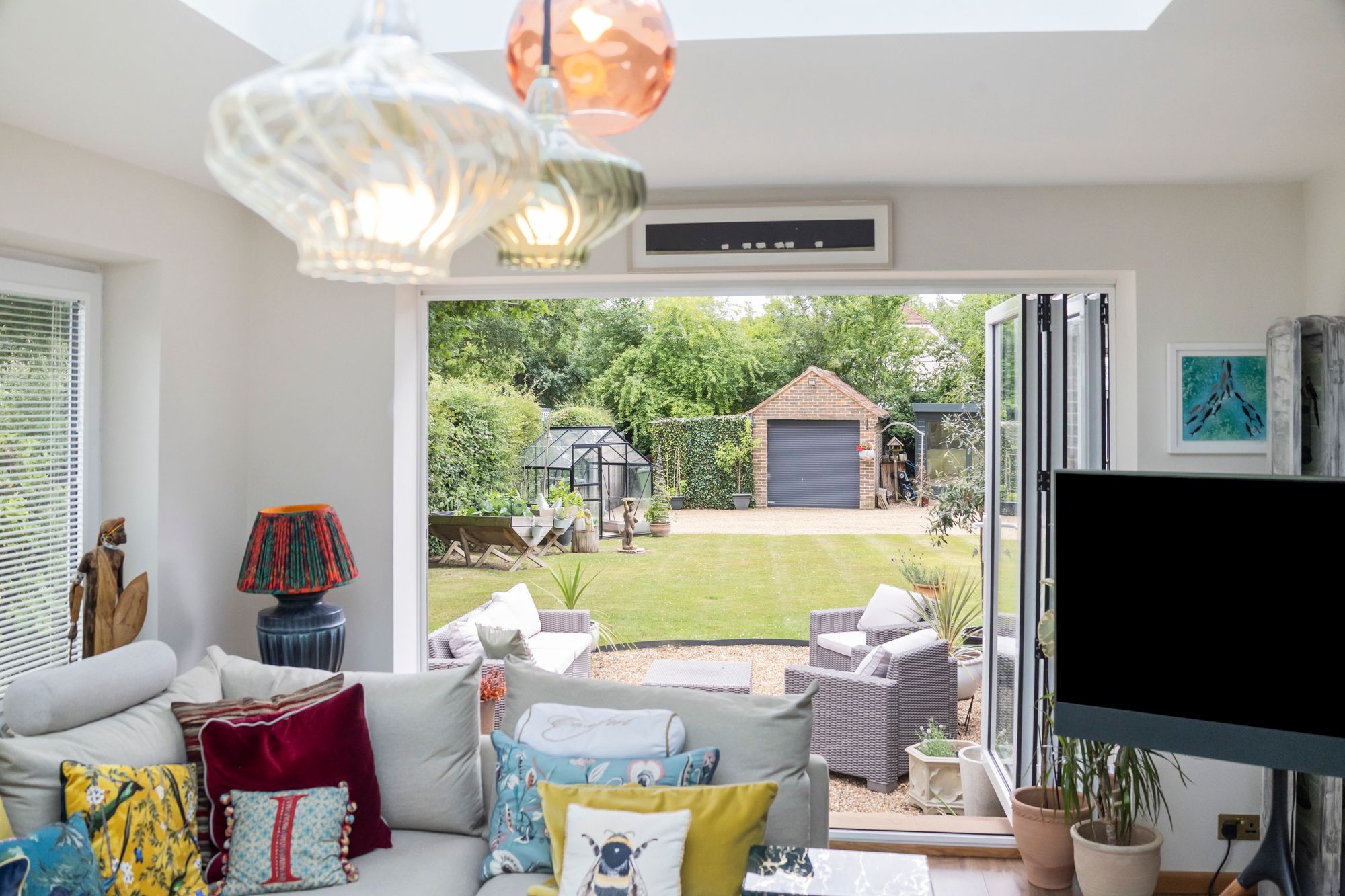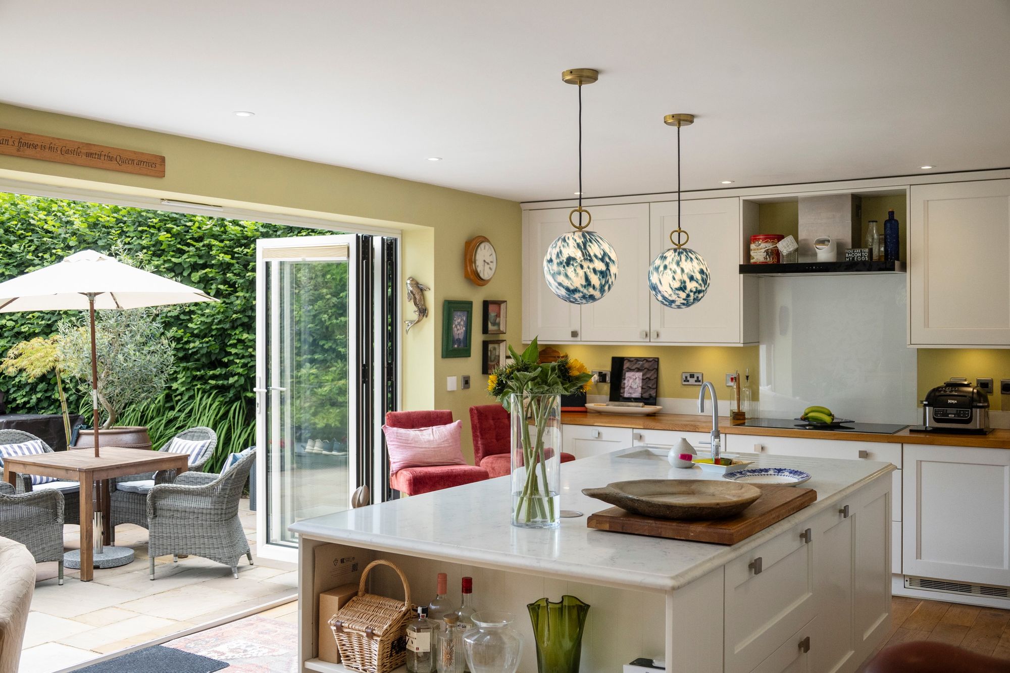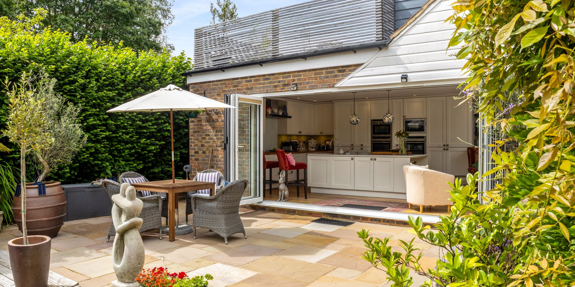The heart of the home is a striking, contemporary kitchen featuring a large central island with extensive storage, integrated Bosch and Neff appliances, a Quooker tap for instant boiling or cold water, and a Harvey’s water softener. Bi-fold doors flood the space with natural light and open directly onto the south-facing garden and patio—ideal for entertaining or relaxing. Underfloor heating ensures warmth and comfort, even on the coldest evenings.