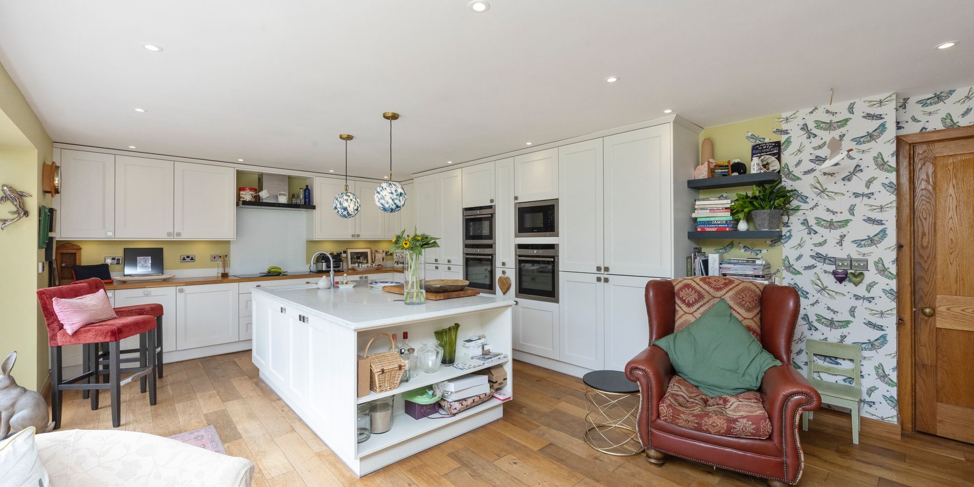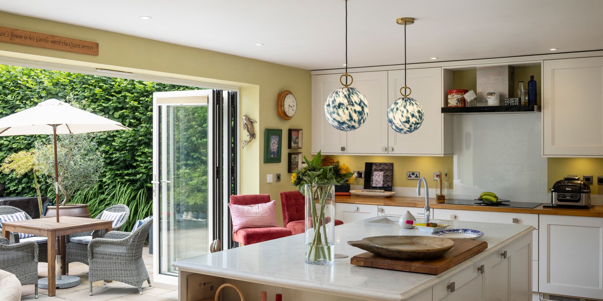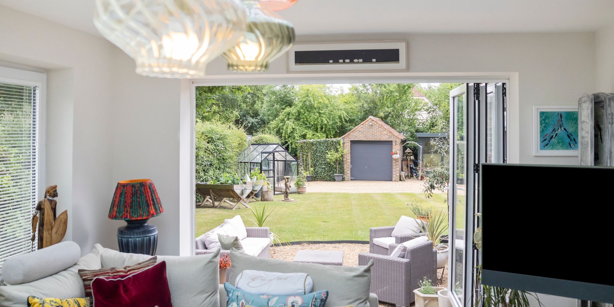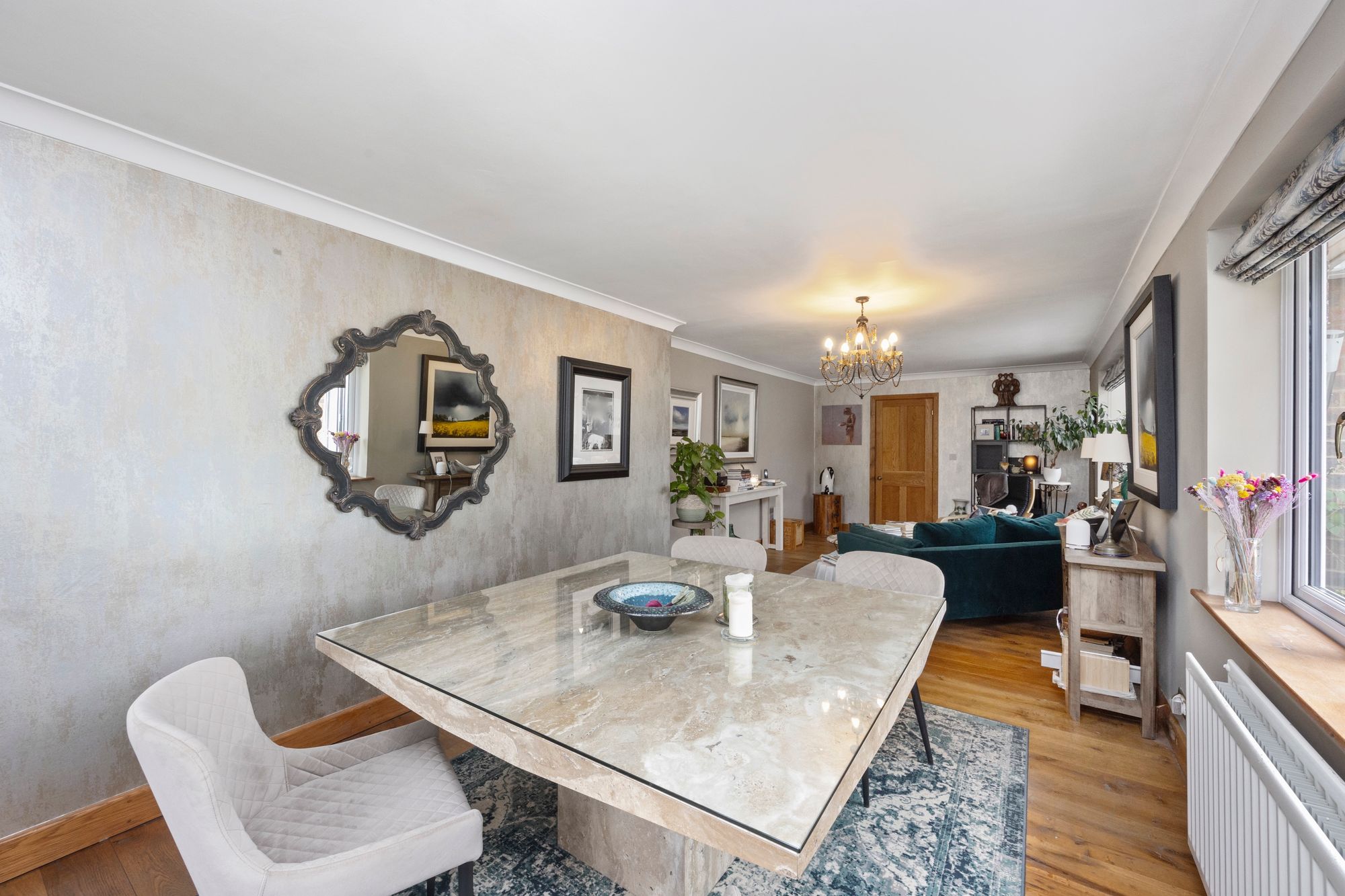 The heart of the home is a striking, contemporary kitchen featuring a large central island with extensive storage, integrated Bosch and Neff appliances, a Quooker tap for instant boiling or cold water, and a Harvey’s water softener. Bi-fold doors flood the space with natural light and open directly onto the south-facing garden and patio—ideal for entertaining or relaxing. Underfloor heating ensures warmth and comfort, even on the coldest evenings.