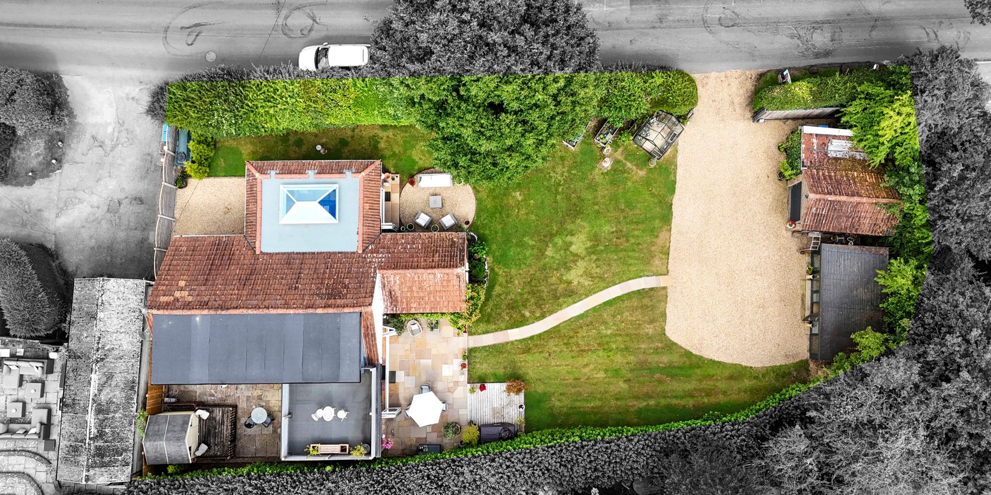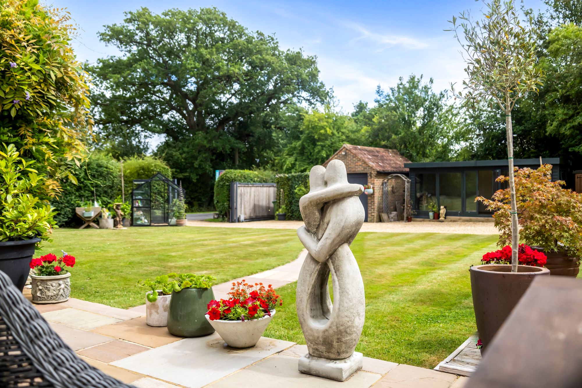 Outside, the gardens offer true tranquillity, with beautifully maintained lawns and versatile spaces. There are additional areas for storage or secure pet enclosures, and the garden is fully animal-proofed. For guests, there’s a moveable, self-contained annexe with a bedroom and bathroom, providing privacy and flexibility. The property also benefits from a powered garage, a large gated driveway with ample parking, and an electric entrance gate for added security.