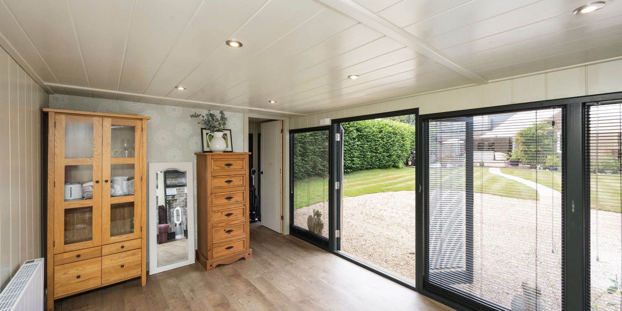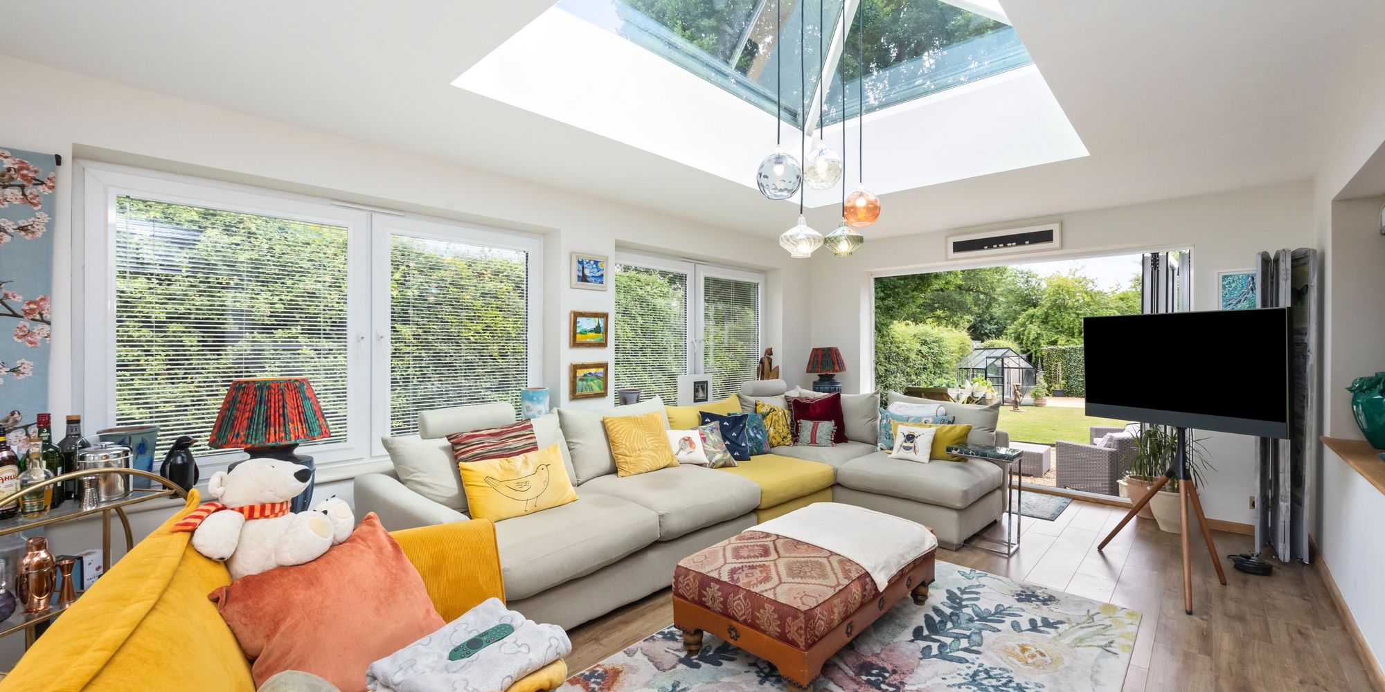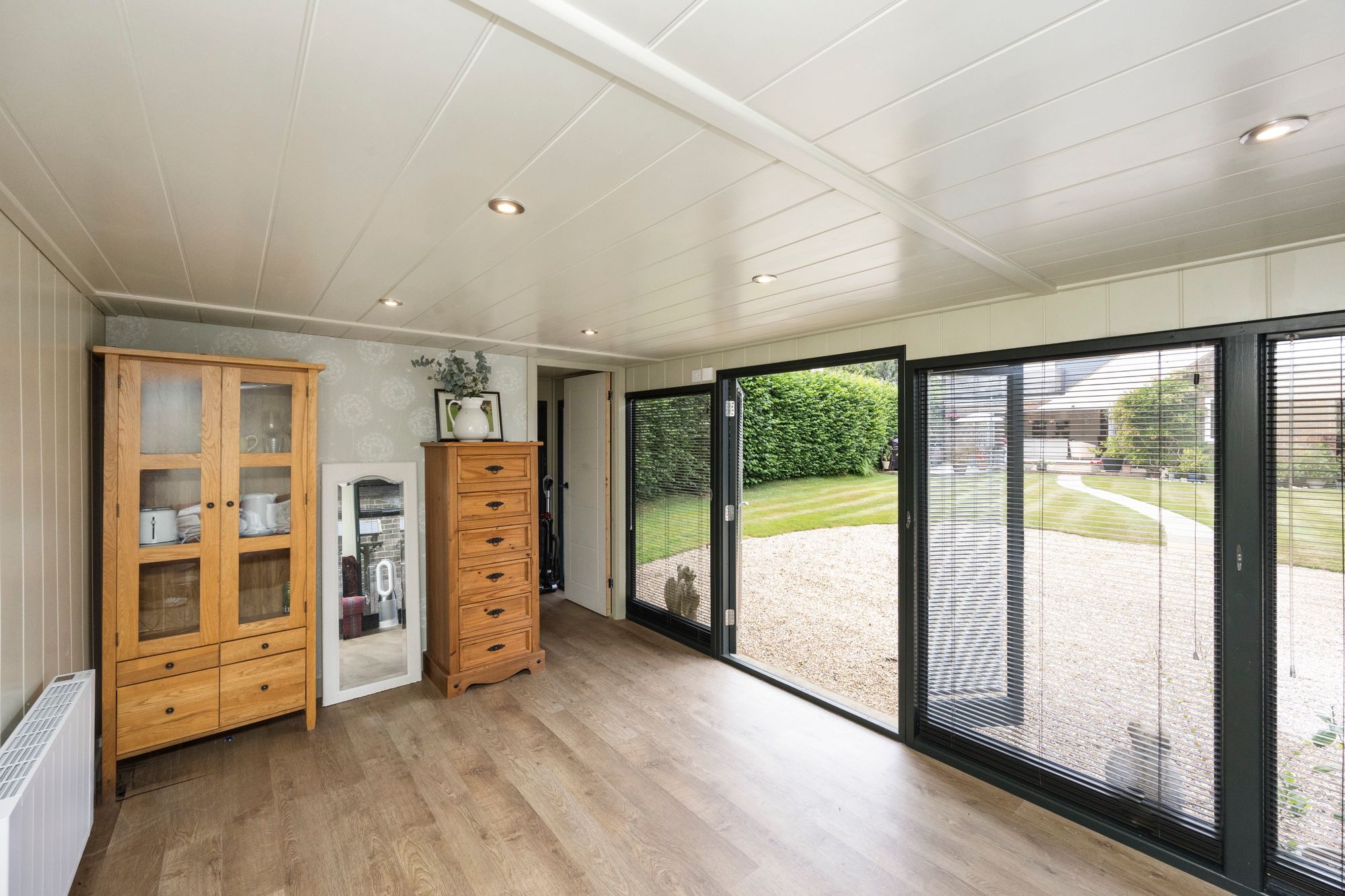 The ground floor offers two spacious double bedrooms, easily accommodating family or guests. One bedroom includes full-length fitted wardrobes with both hanging space and shelving, while both rooms are well-proportioned and versatile. The lounge is bright and airy, large enough for both seating and dining, and connects seamlessly to the stunning orangery. With its lantern roof, 180-degree windows, and bi-fold doors leading outside, the orangery is perfect for gatherings in any season, offering plenty of light and ventilation.