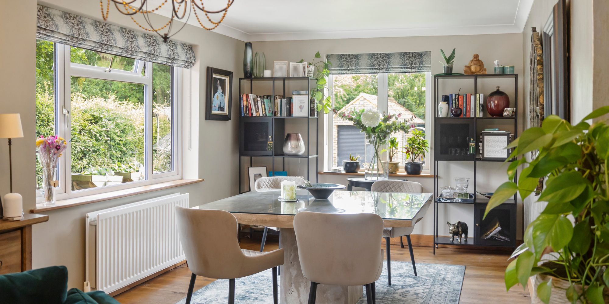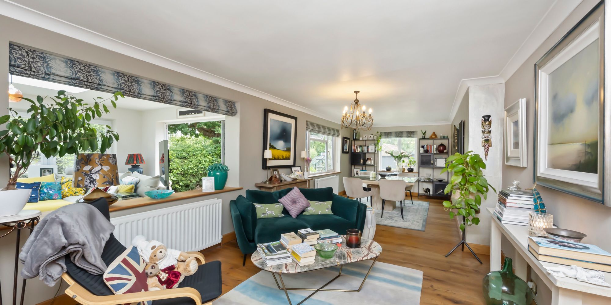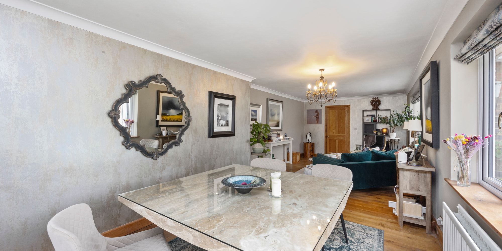 The ground floor offers two spacious double bedrooms, easily accommodating family or guests. One bedroom includes full-length fitted wardrobes with both hanging space and shelving, while both rooms are well-proportioned and versatile. The lounge is bright and airy, large enough for both seating and dining, and connects seamlessly to the stunning orangery. With its lantern roof, 180-degree windows, and bi-fold doors leading outside, the orangery is perfect for gatherings in any season, offering plenty of light and ventilation.