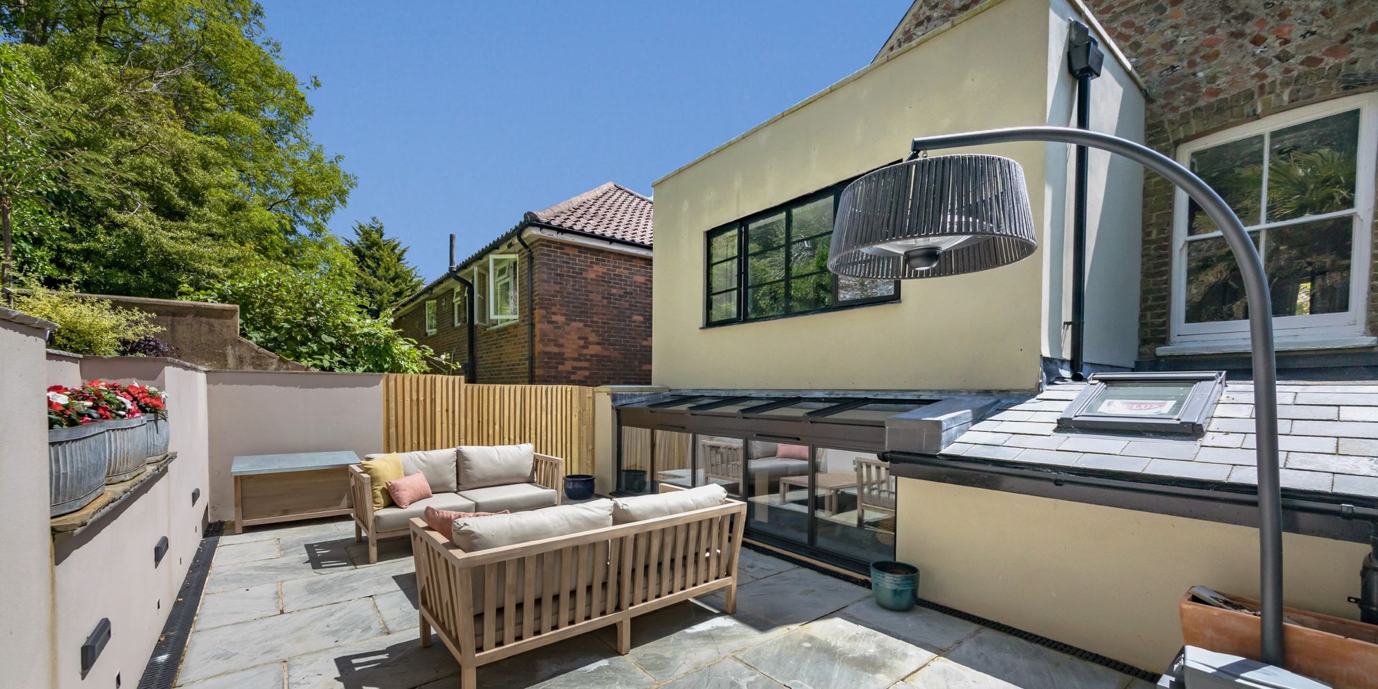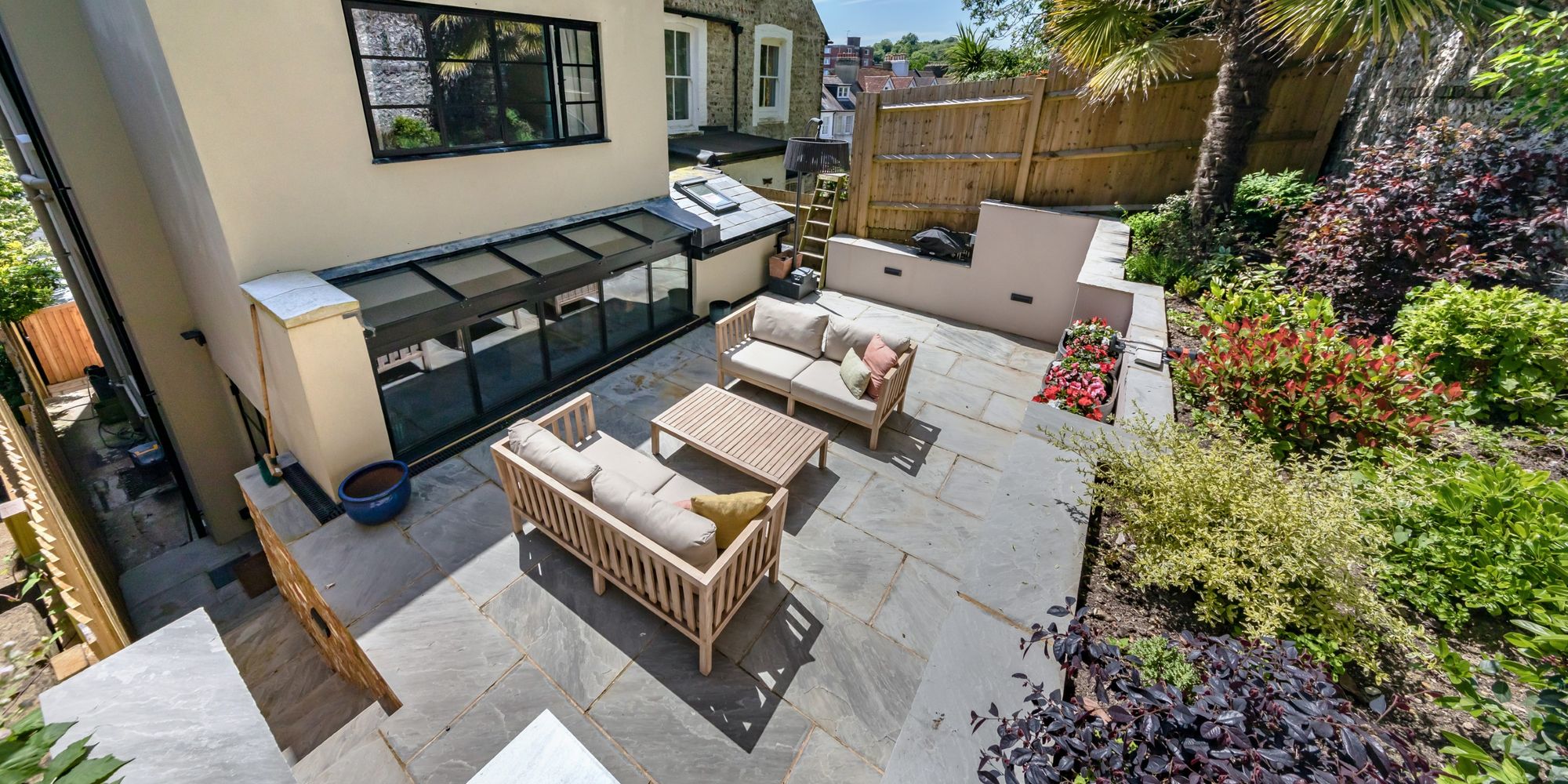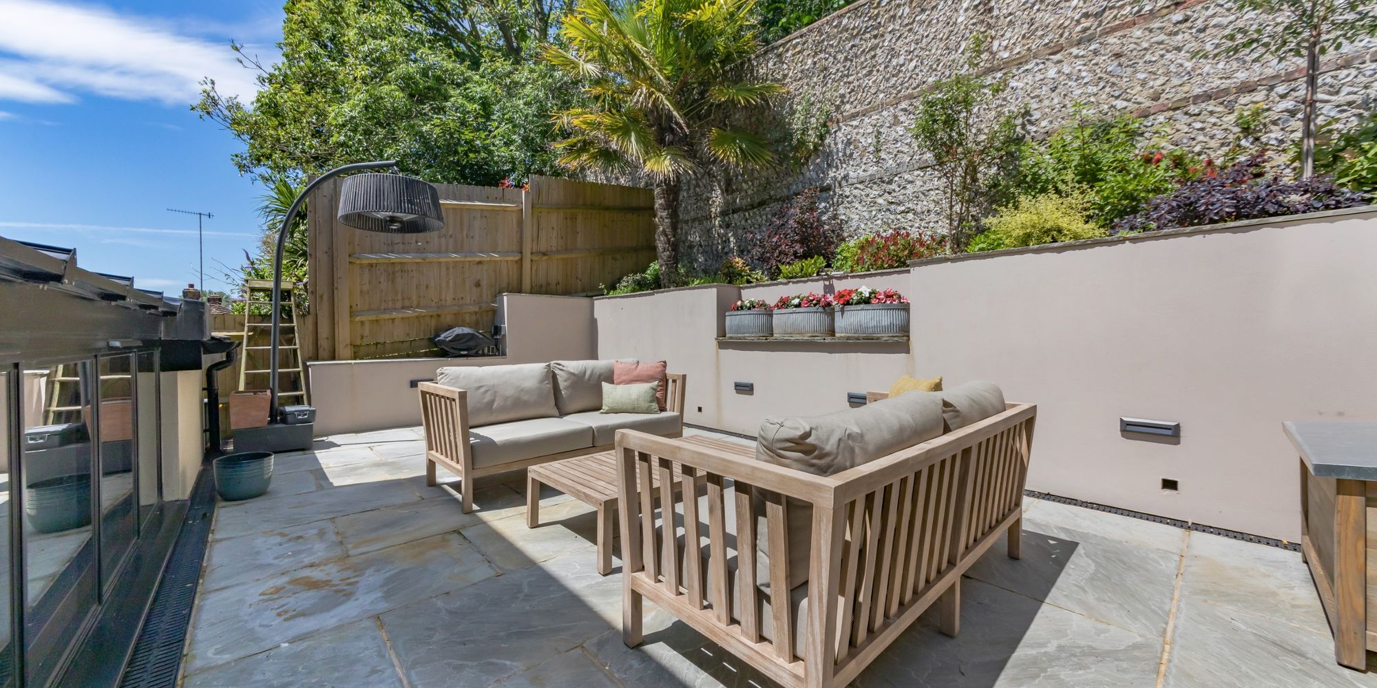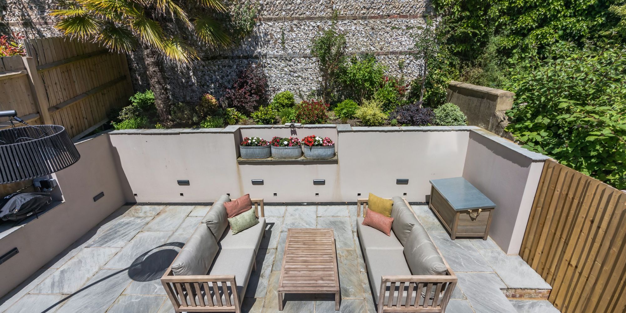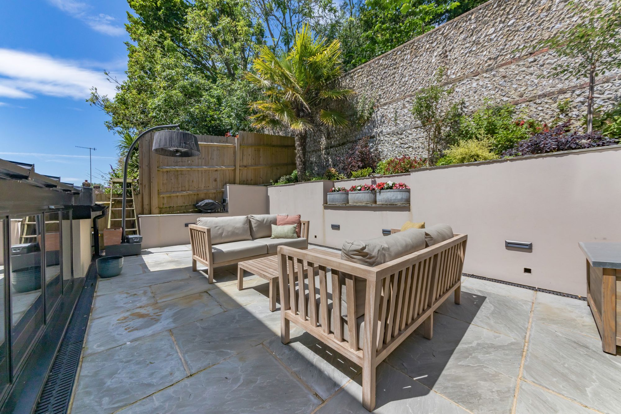 REAR GARDEN- A fully redesigned, landscaped elevated courtyard garden which makes the most of the summer sun. The garden is surrounded by raised beds which are well stocked with a colourful array of plants and shrubs. The garden features a pretty flint wall and features concealed outdoor lighting.