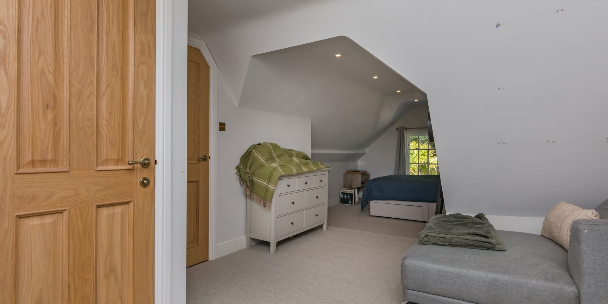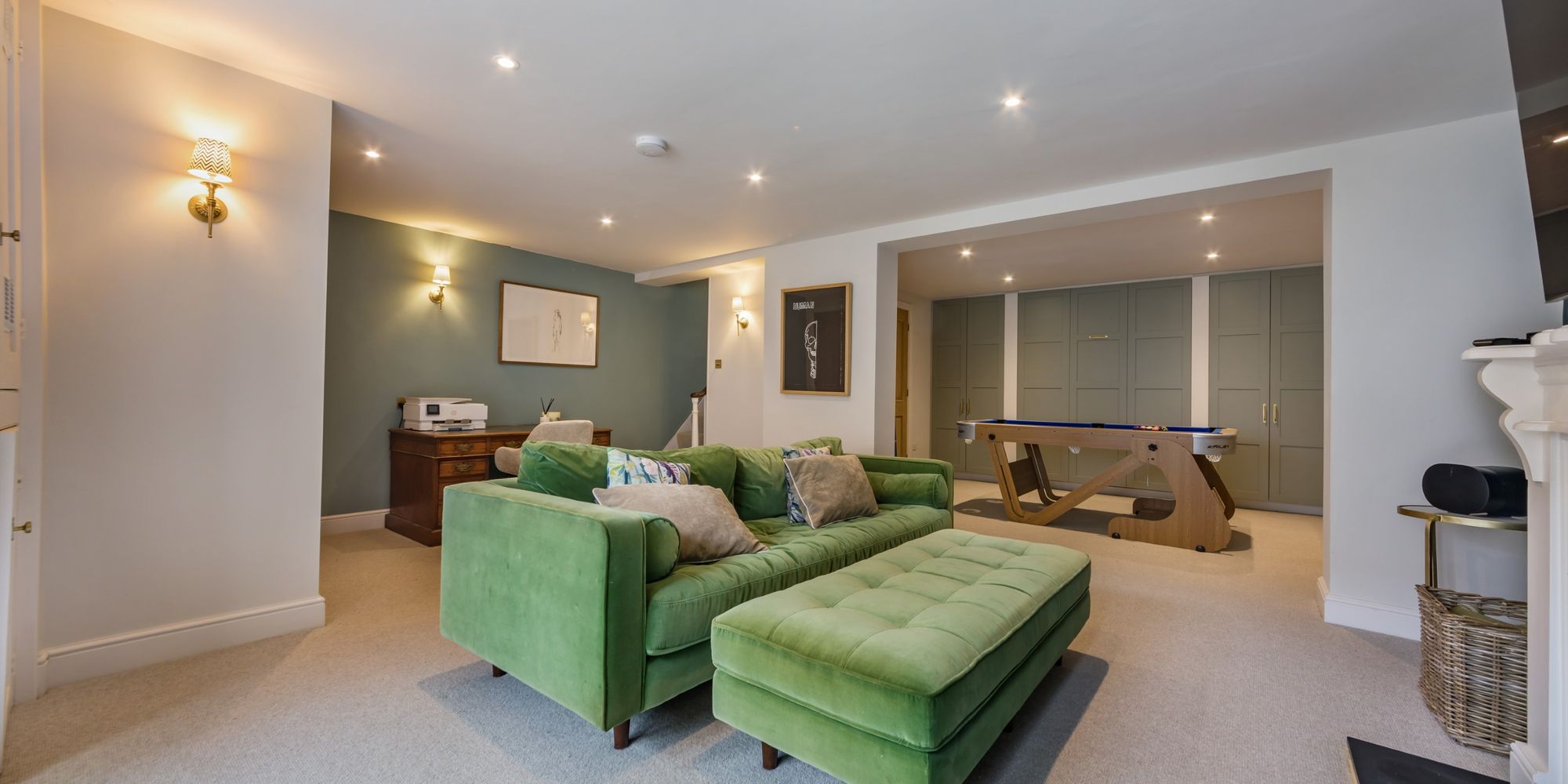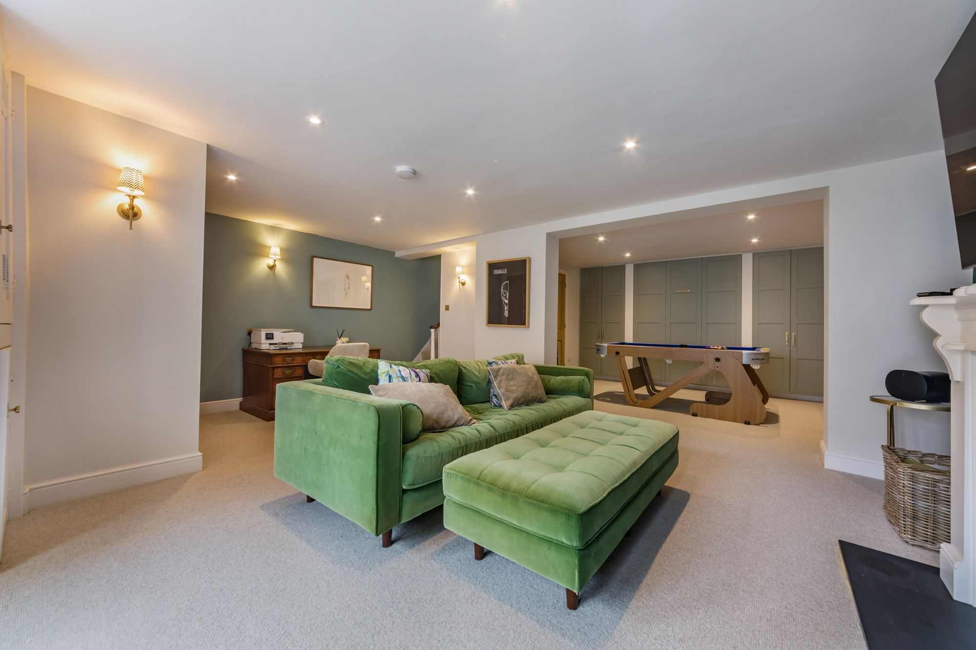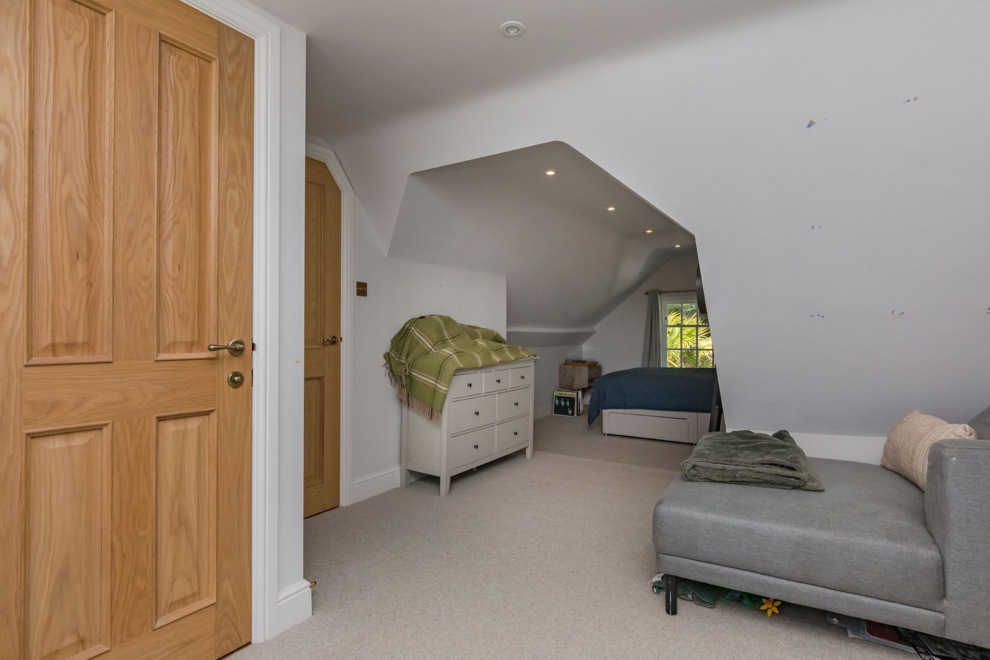 BEDROOM AREA- A creative use of the room providing an Occasional Bedroom with a discrete pull-down bed concealed by painted panelled doors with fitted cupboards to either side. The room is otherwise used as an enviable Games Room. Solid oak door to;