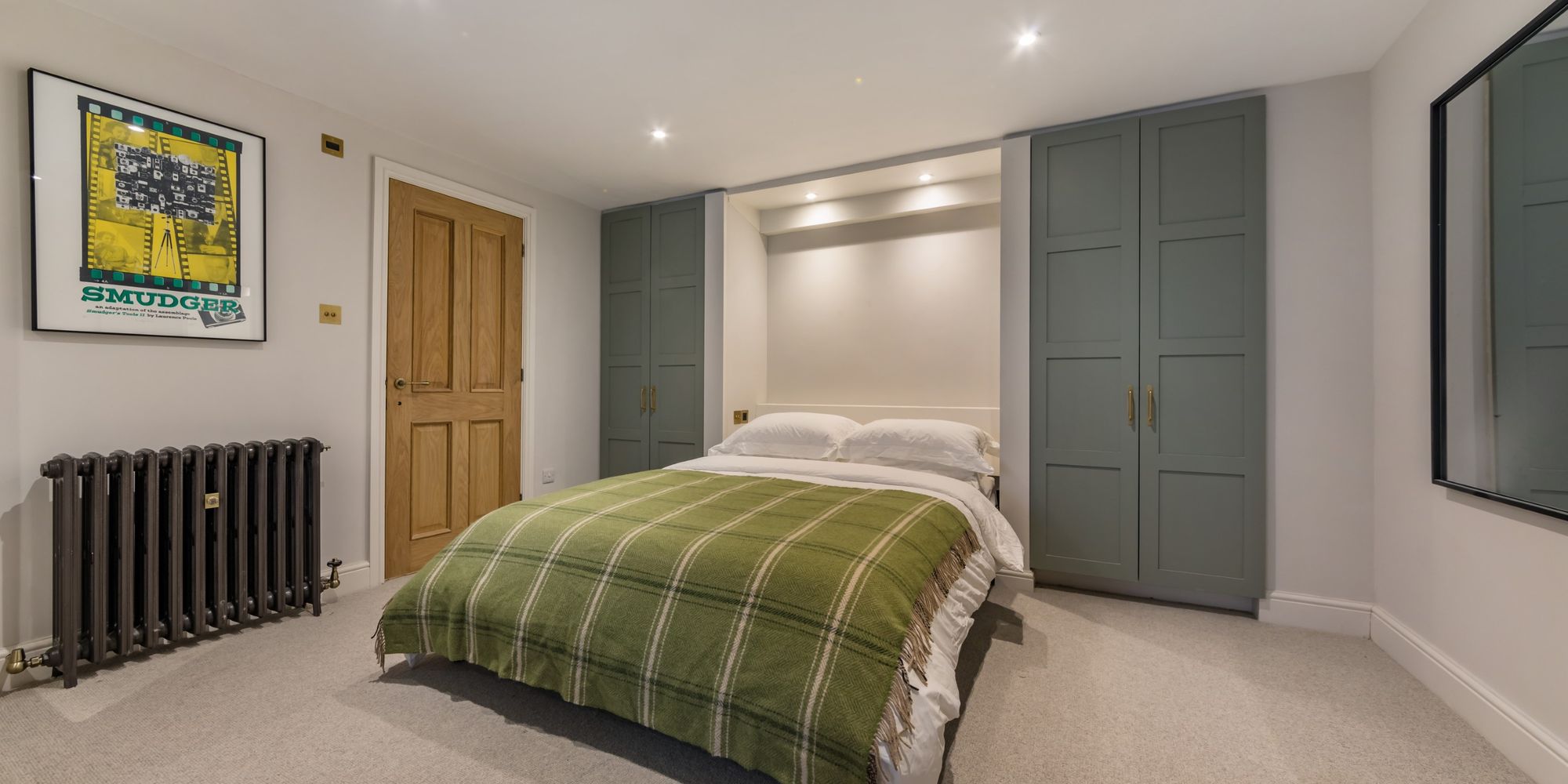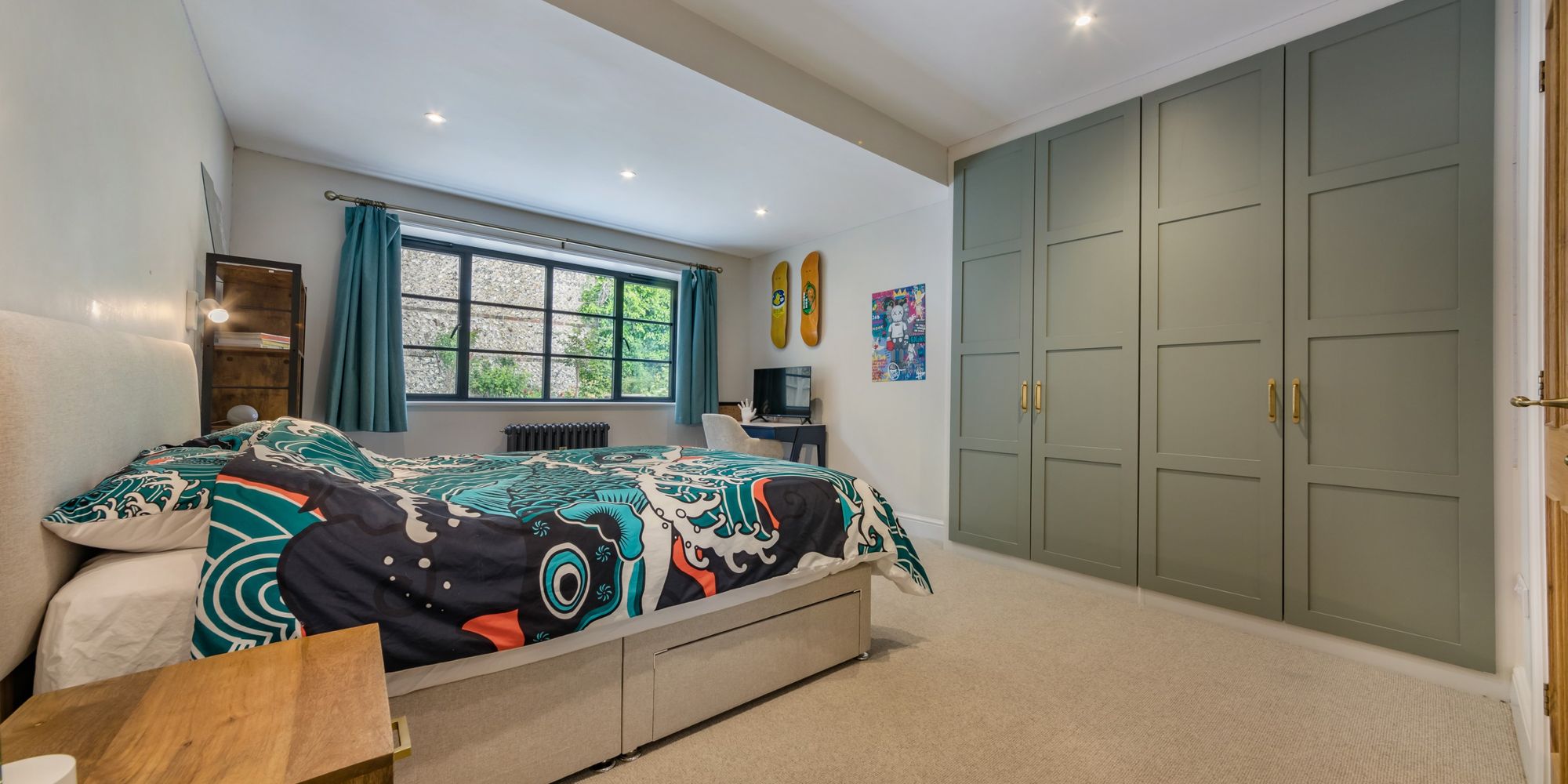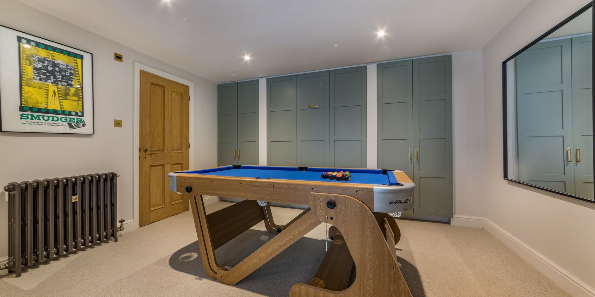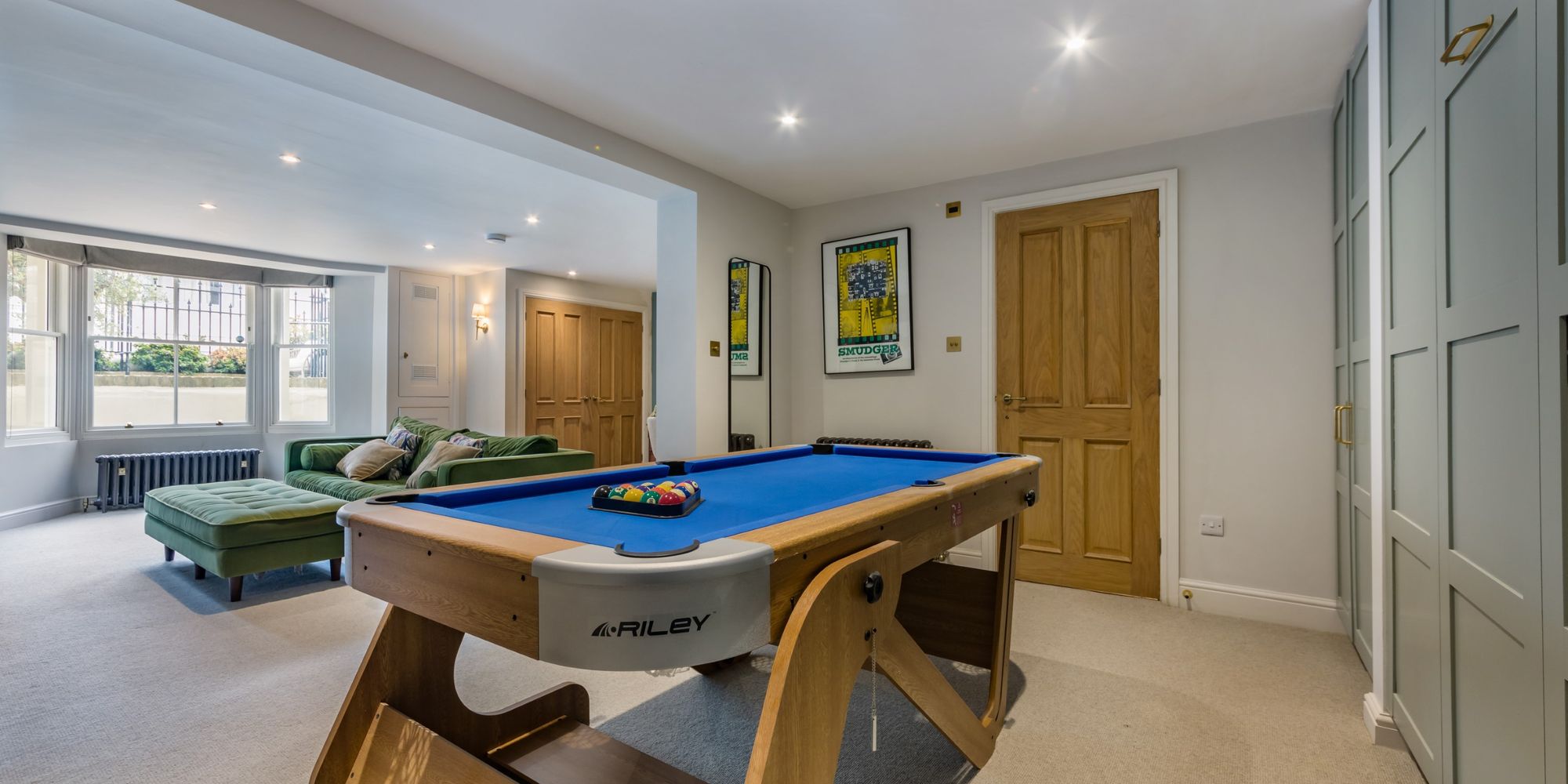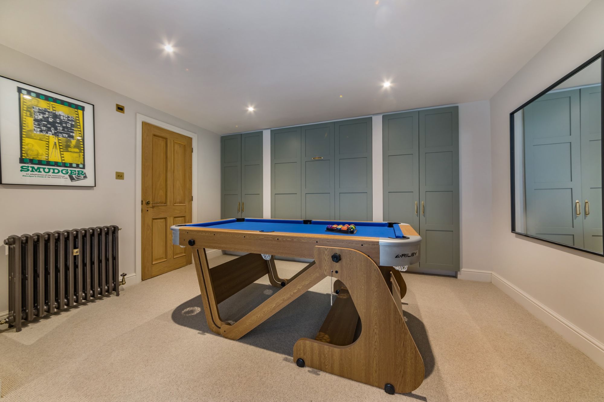 BEDROOM AREA- A creative use of the room providing an Occasional Bedroom with a discrete pull-down bed concealed by painted panelled doors with fitted cupboards to either side. The room is otherwise used as an enviable Games Room. Solid oak door to;