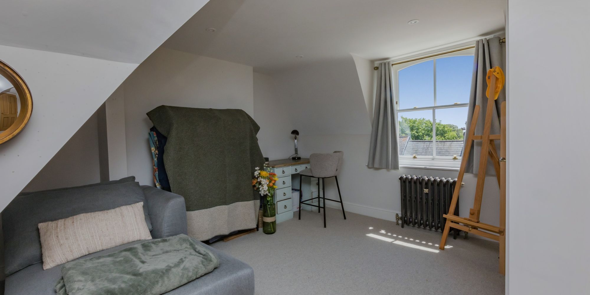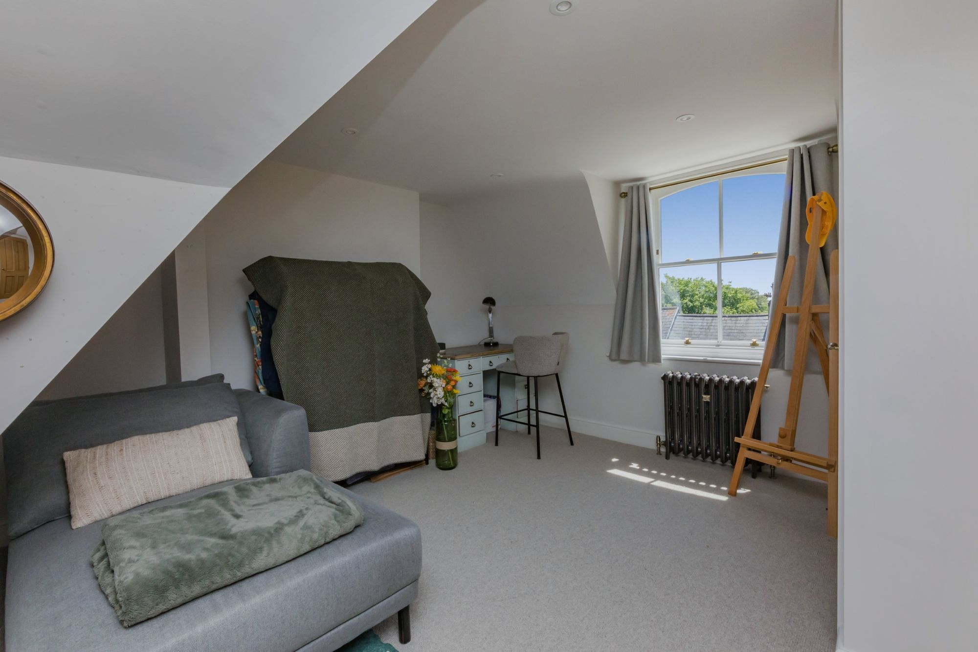 BEDROOM 3- A superb top floor bedroom boasting dual aspect light from the rear and the front with views over rooftop to the South Downs. The room was previously separated as two bedrooms but now provides a Dressing Area or Study Area. Oak door to;