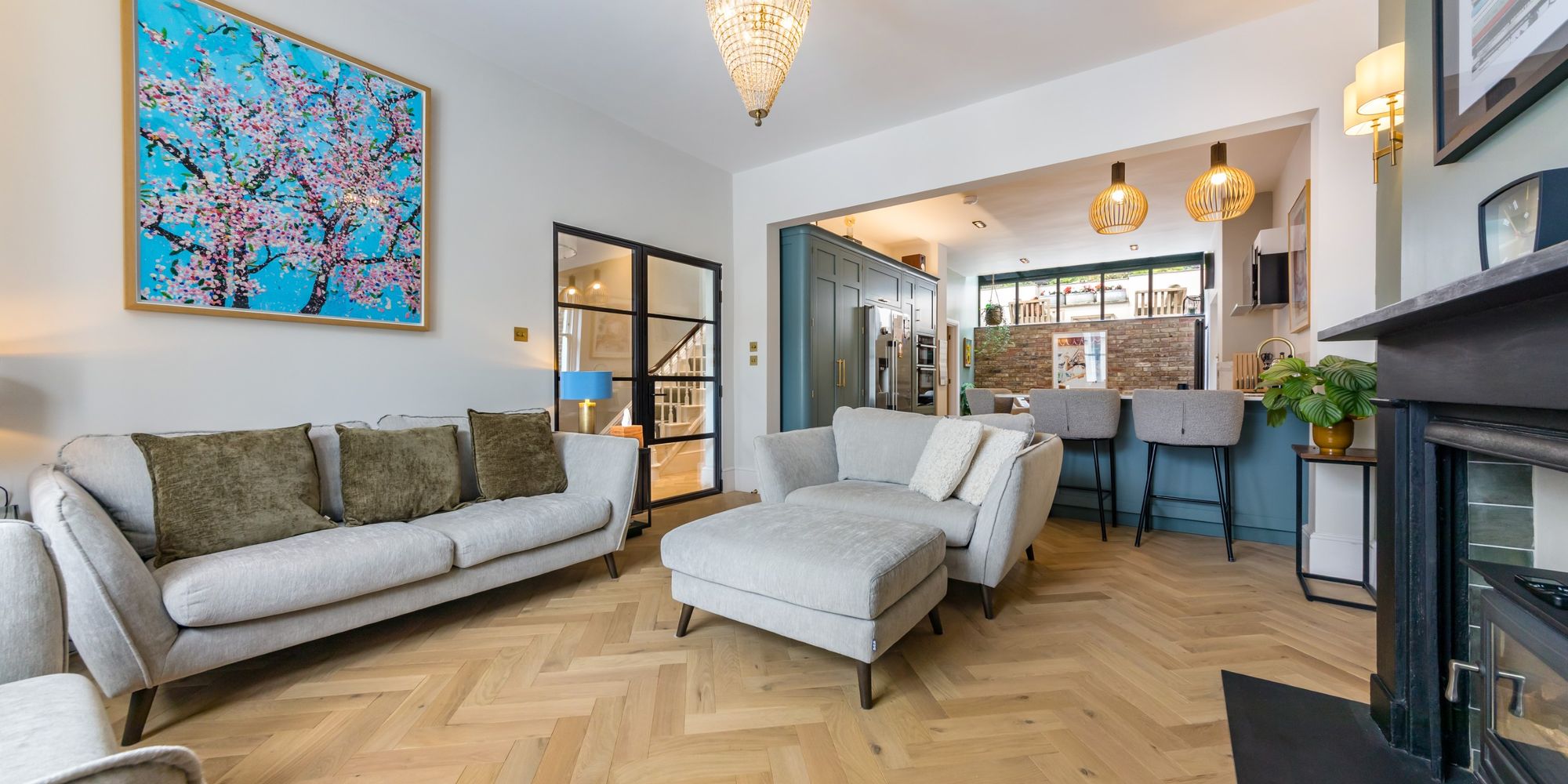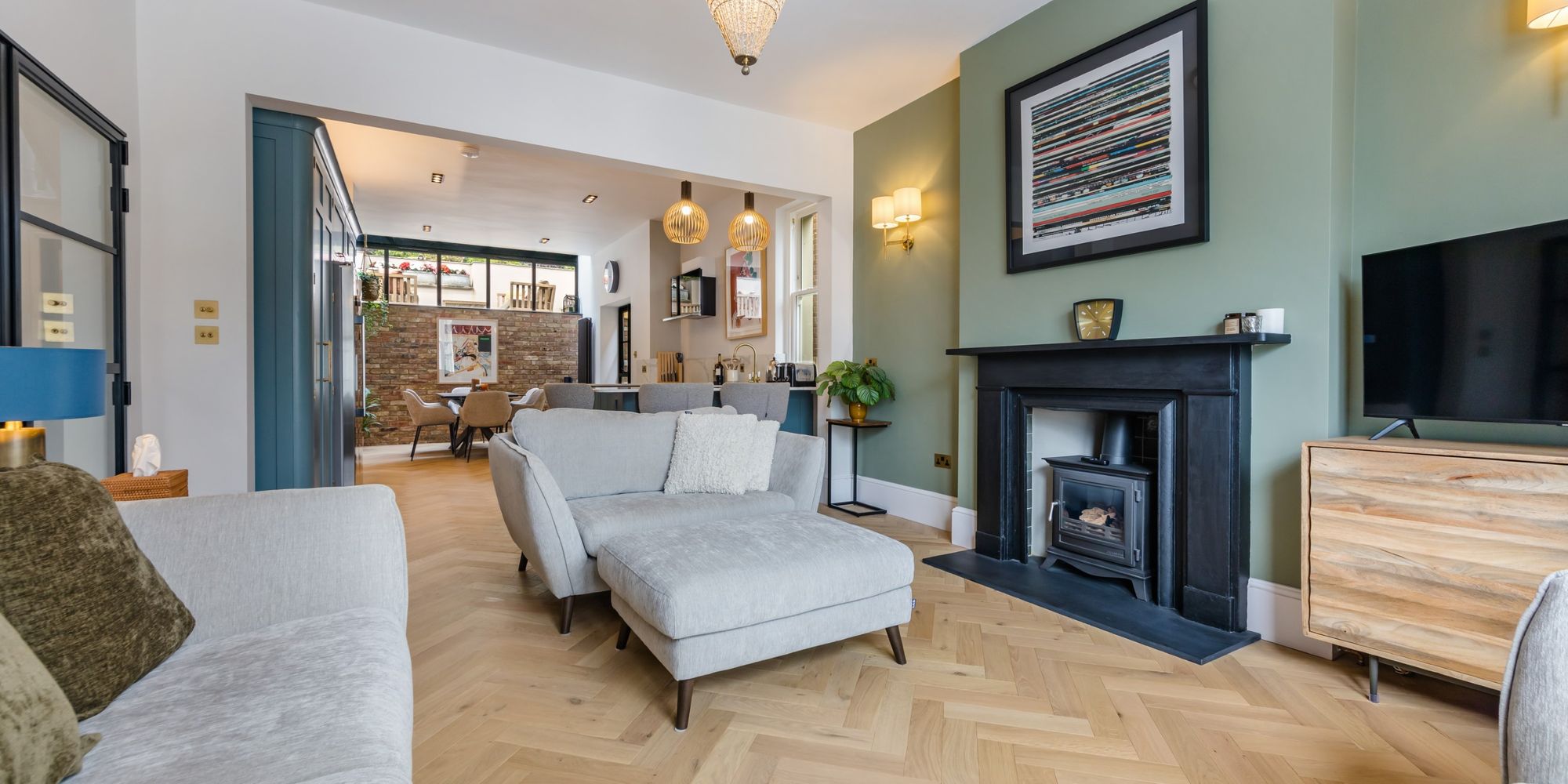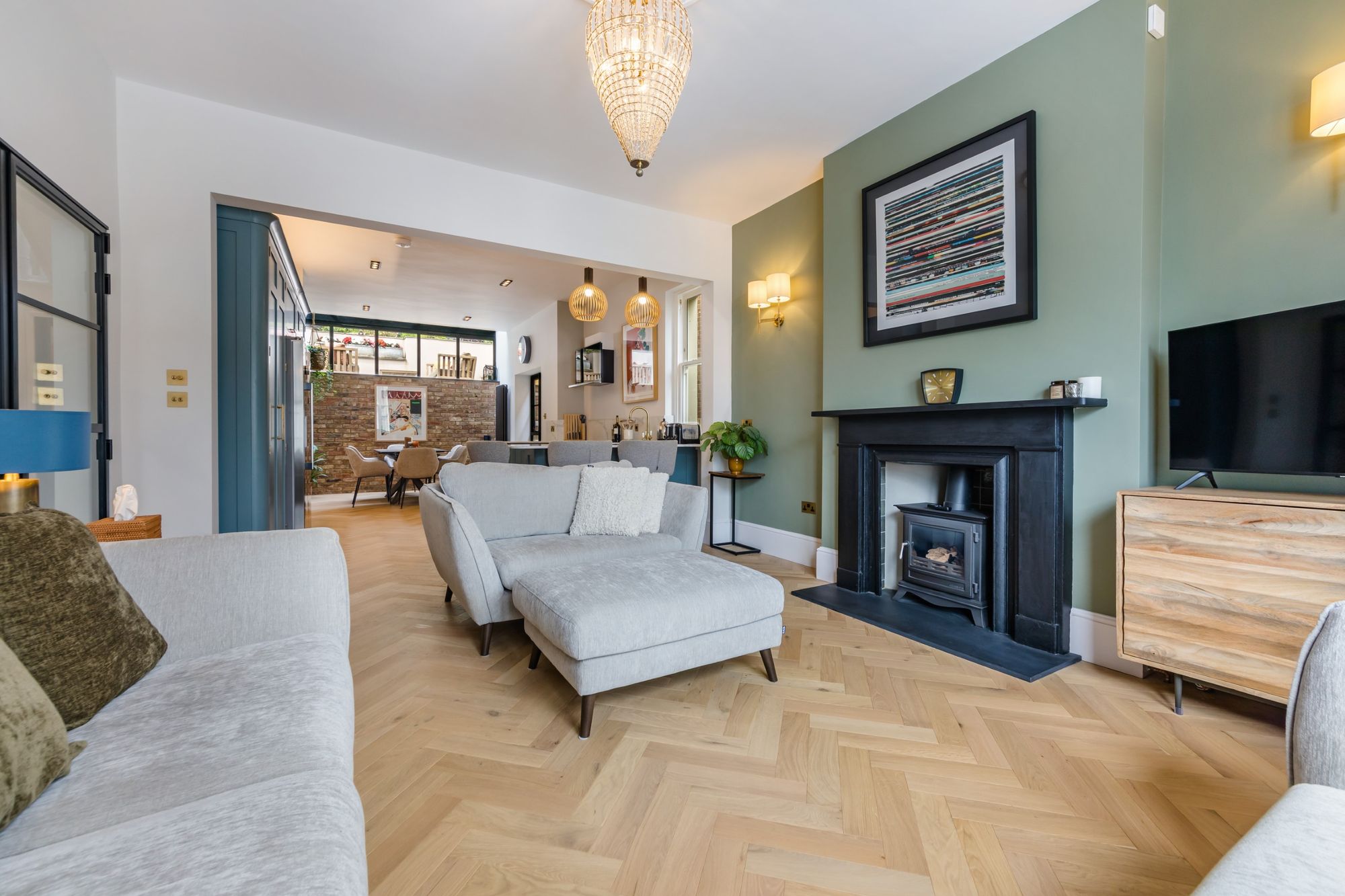 SITTING AREA- The gorgeous solid oak herringbone floor continues throughout the ground floor, and is complemented by beautiful yet simple stone fireplace with modern stove inset. Bay window to the front comprising of three double glazed sash windows flooding the room with natural light and featuring an elevated view along Grange Road. Open plan to;